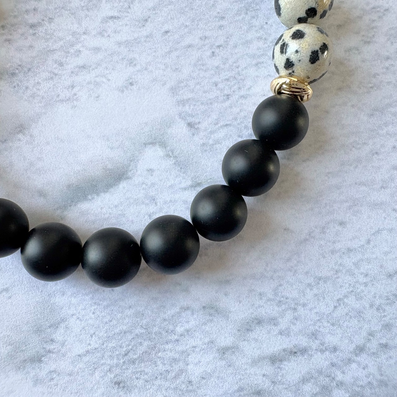 ダルメシアン柄のジャスパーと、落ち着いた質感のマットオニキスを組み合わせた、安全を守るお守り天然石デザインブレスレットです。