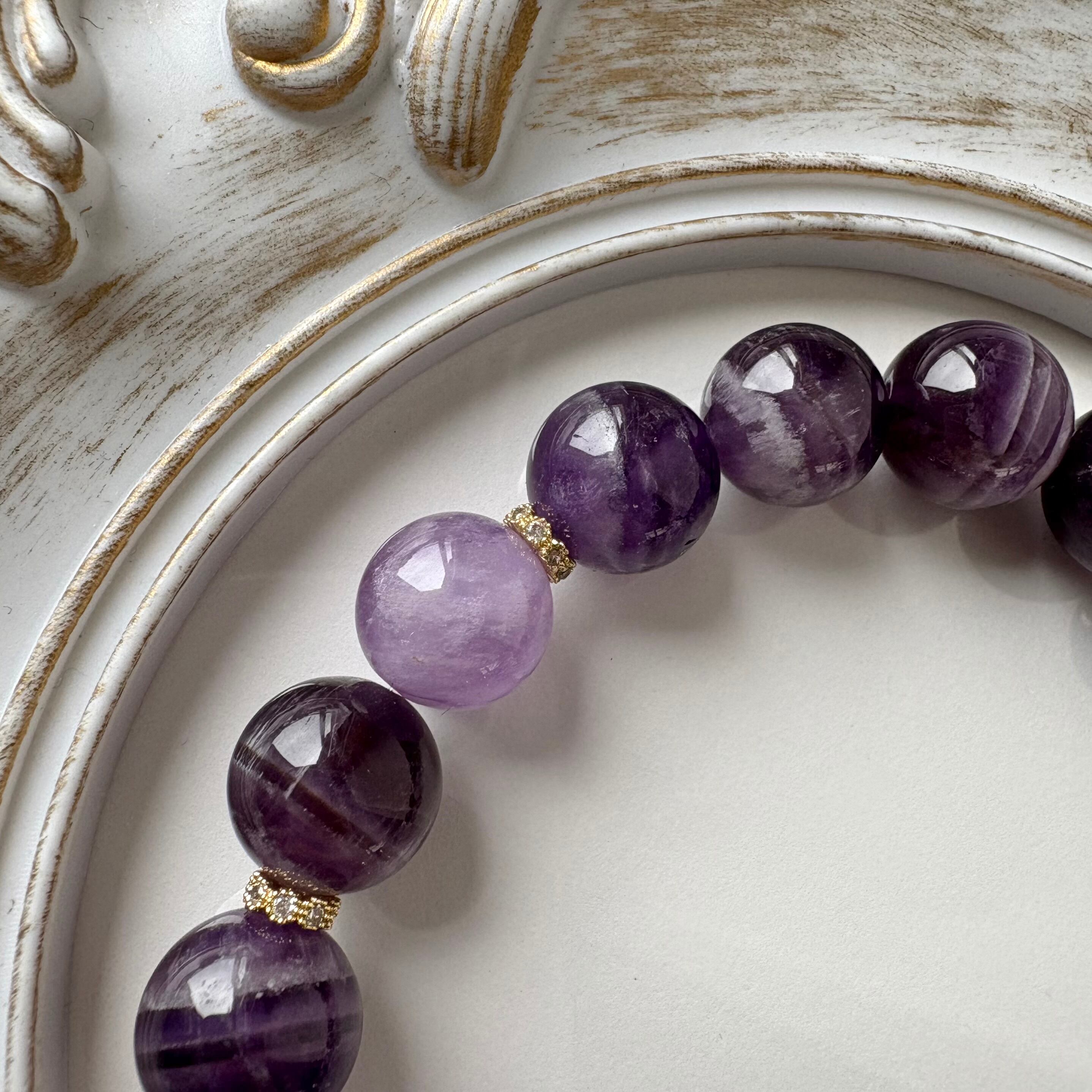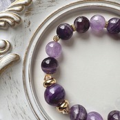 エンジェルシリカを一粒メインに、シェブロンアメジストとラベンダーアメジストを組み合わせた、紫色の上品なブレスレットです。全体的にパープルの色合いにゴールドのパーツとクリスタルガラスを合わせ、輝きと華やかさをプラスしたデザインです。天使・高次元・癒しのキーワードが気になる方へおすすめのブレスレットです。