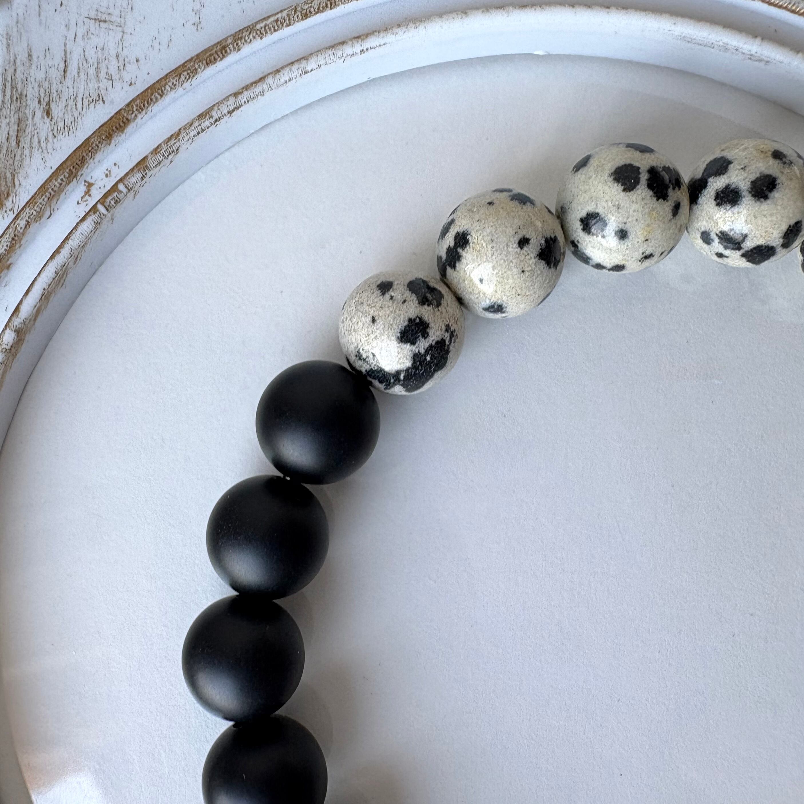 ダルメシアン柄のジャスパーと、落ち着いた質感のマットオニキスを組み合わせた、安全を守るお守り天然石デザインブレスレットです。
