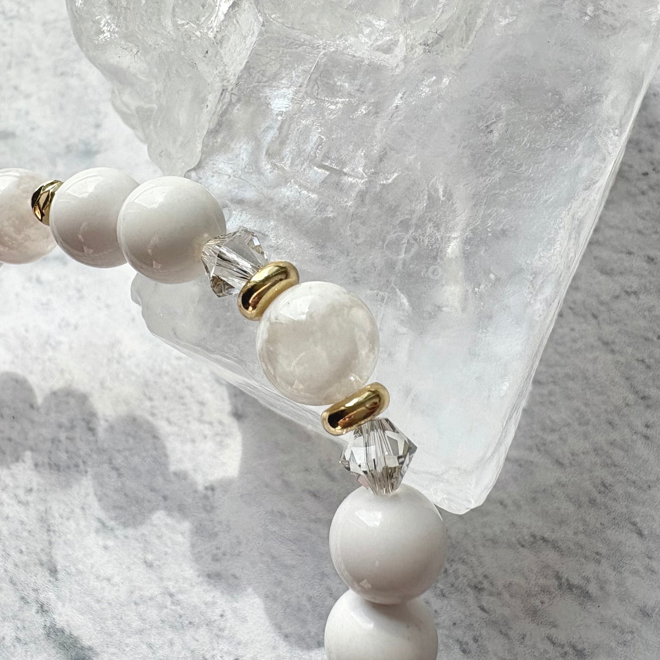 純白のホワイトオニキスとホワイトセリサイトインクォーツをセレクトし、キラキラと輝くクリスタルガラス、そして14kgf・ステンレスのゴールドパーツを組み合わせました。アクセサリー感覚で気軽に身に着けられる、浄化と守護のブレスレットです。