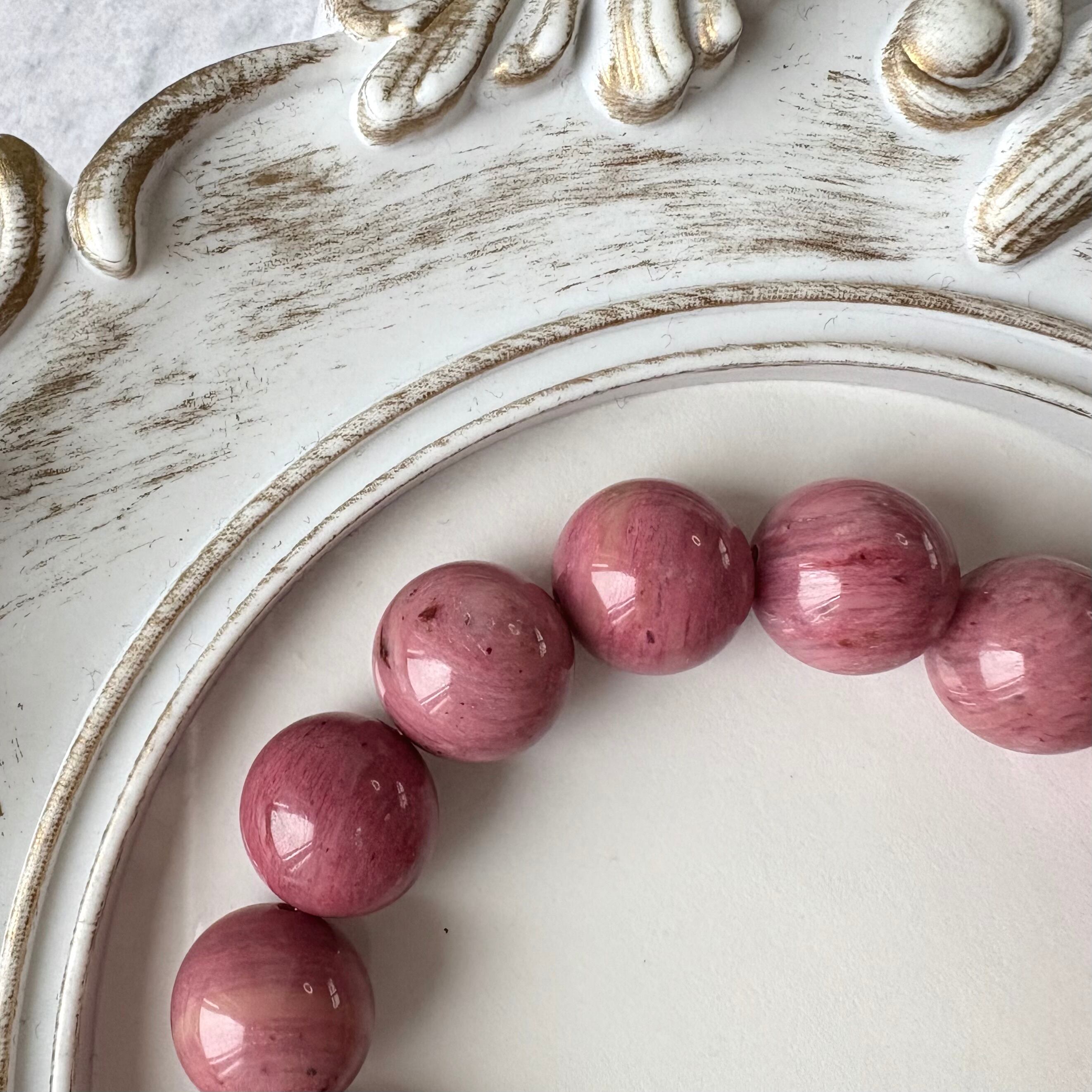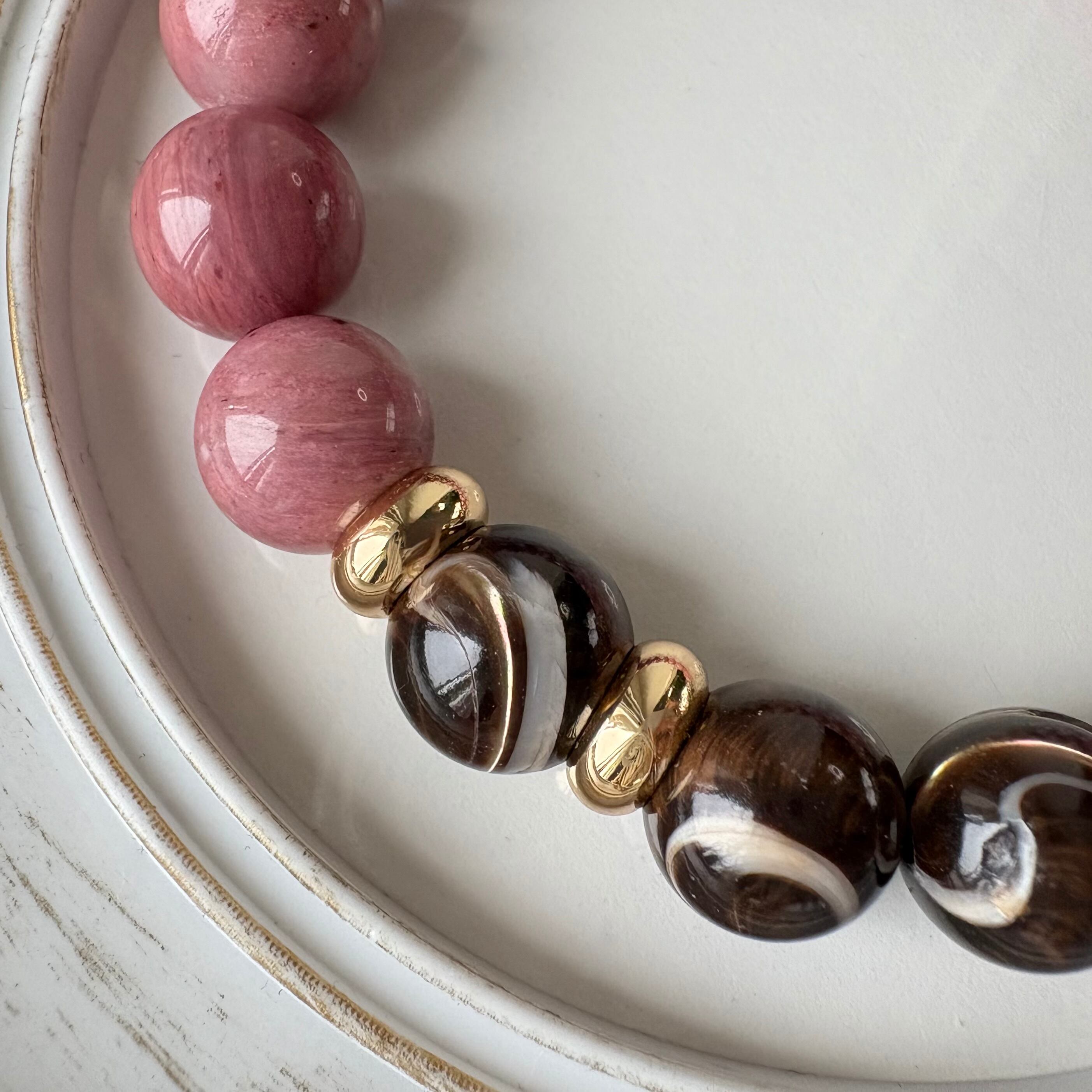 ストロベリーチョコレートのような甘く可愛らしいピンク色のシリシャスシスト(ピーモンタイト)と、チョコレート色のマザーオブパールが織りなす魅力的な組み合わせのブレスレットです。