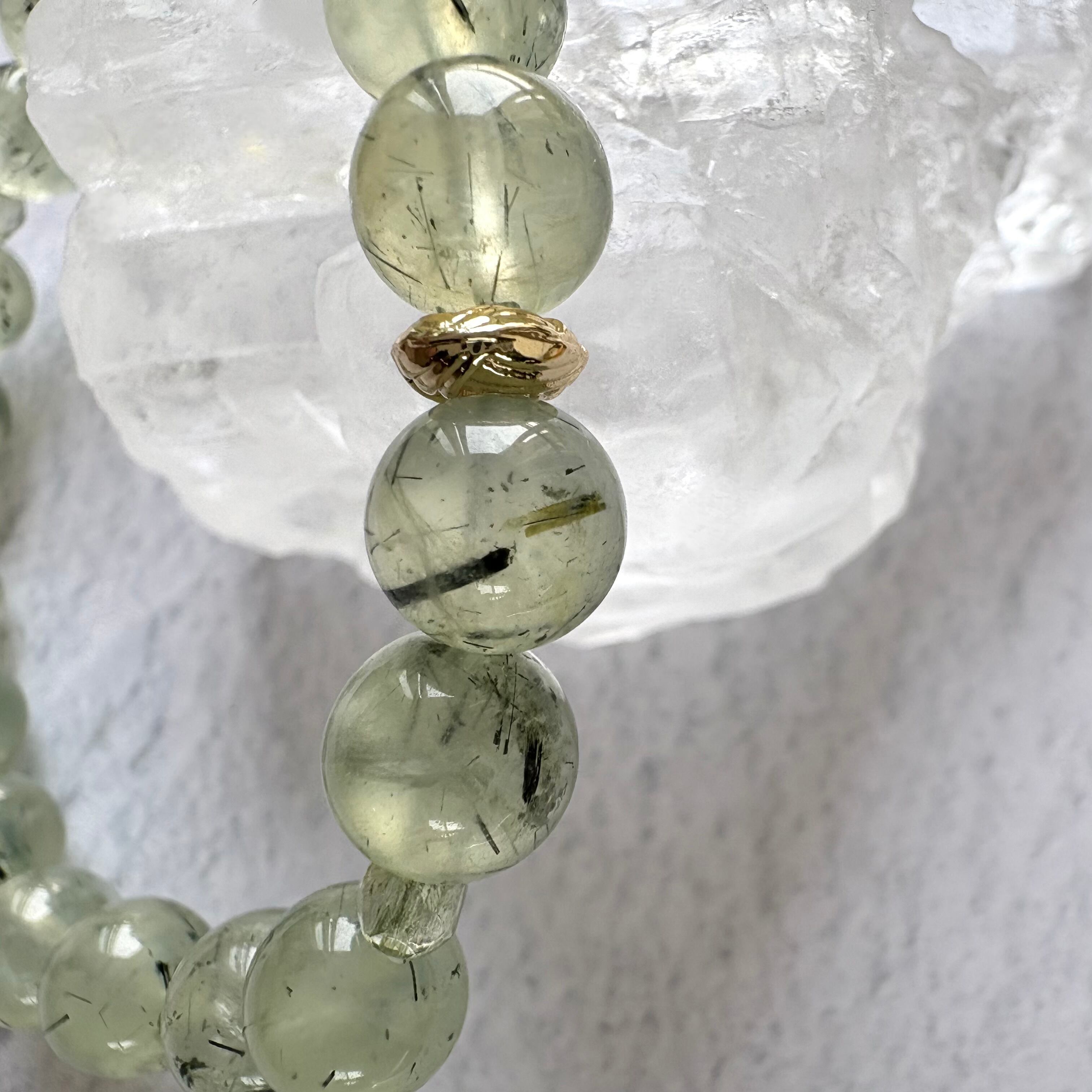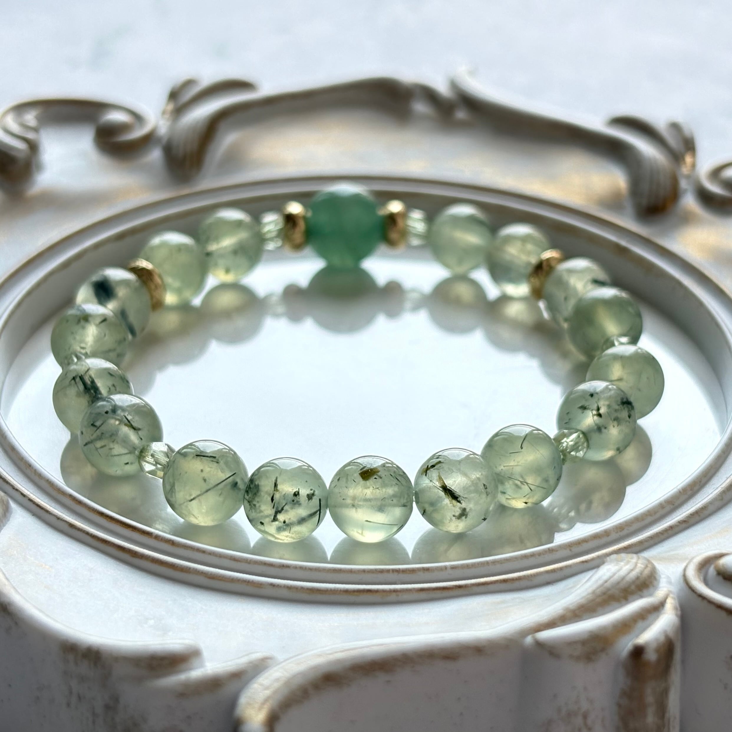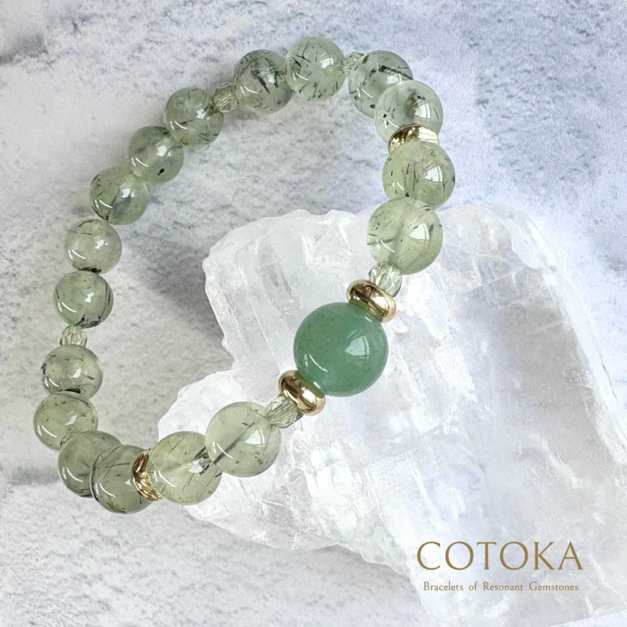 淡いグリーンのなかに優しさと静けさが溶け込んだ、癒しのエネルギーをまとうブレスレット。トップには、森林を思わせるような癒し色のグリーンアベンチュリンを一粒配置。ベースにはマスカットのように瑞々しくとろみ感のあるエピドート入りプレナイトを使用しています。
