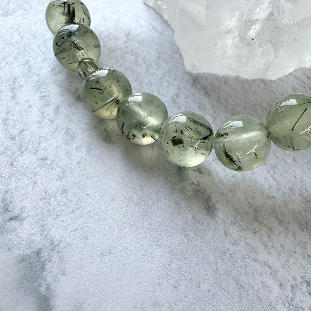 「真実を見抜く石」とされるプレナイトに、ネガティブな思考の浄化と再生の力を持つエピドートが内包された天然石。不要な感情や執着を手放し冷静で前向きな判断ができるよう導きます。感情を整えたいときや心の整理におすすめ。