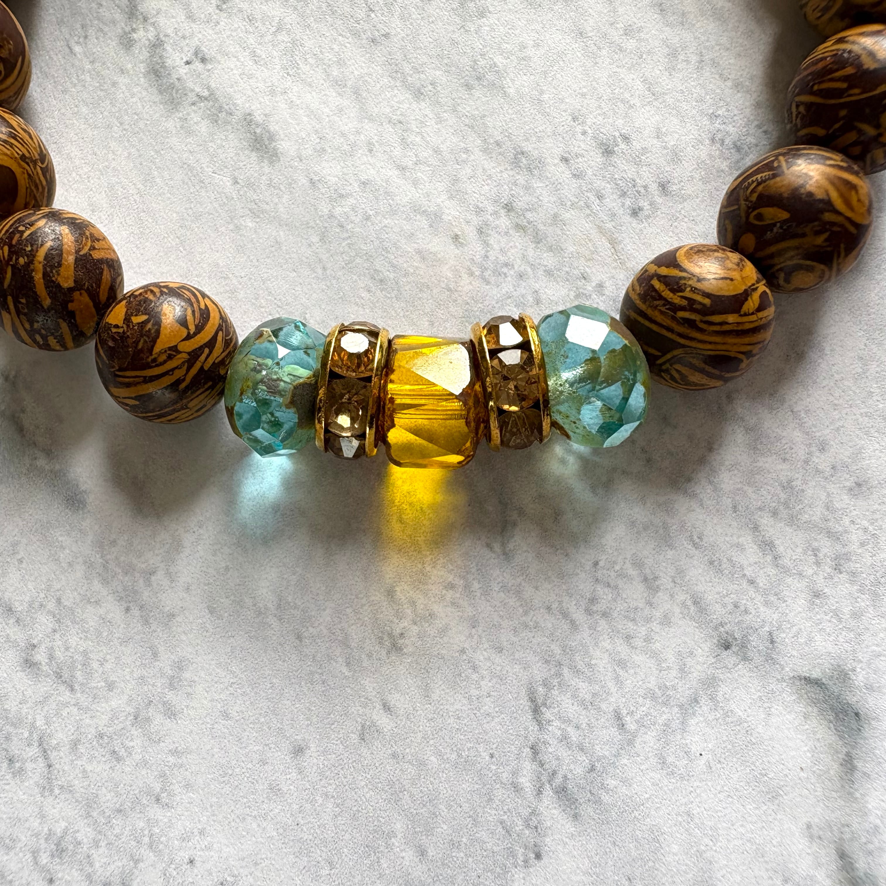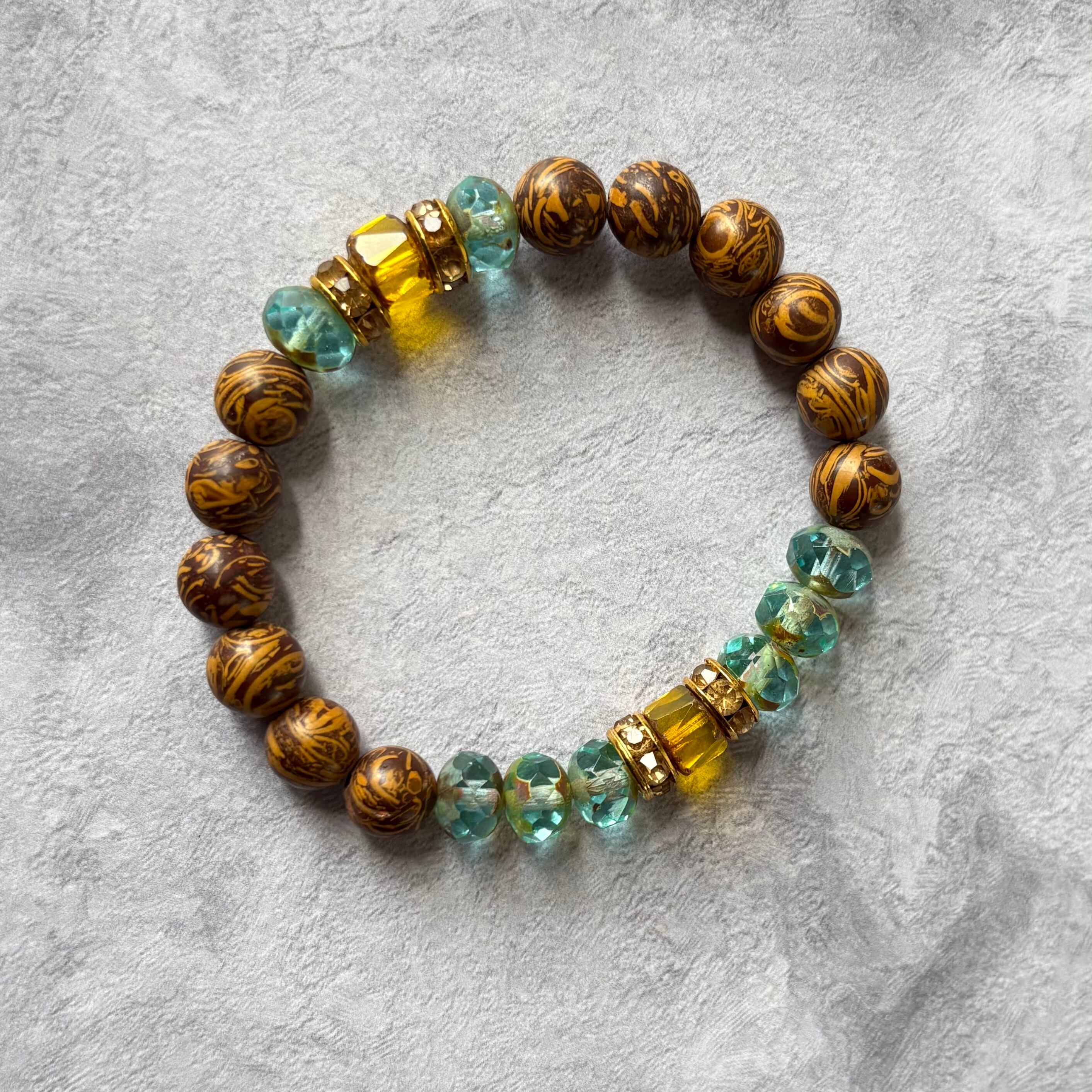 アクアブルー&イエロー チェコガラス×エレファントスキンジャスパーデザインブレスレット