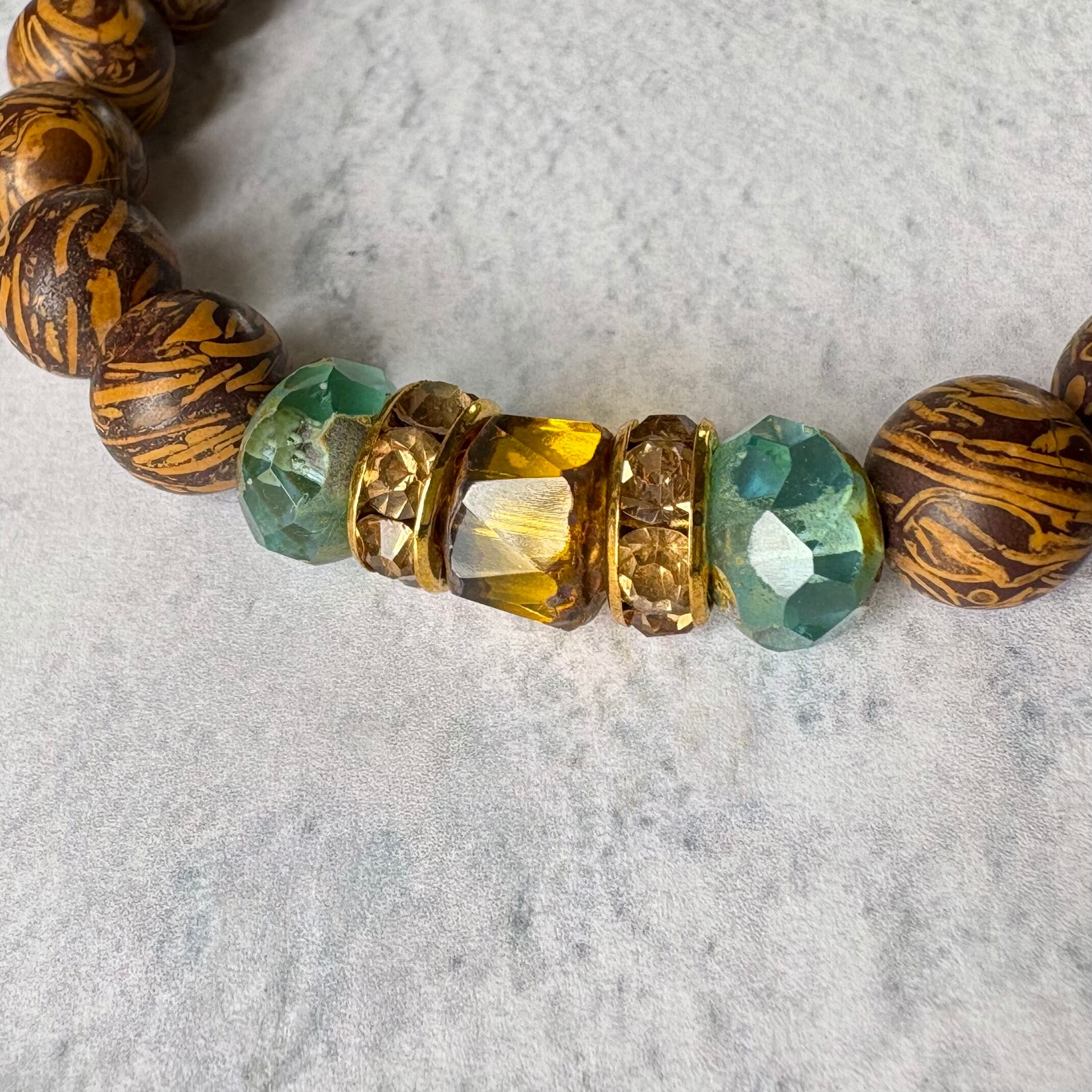 ブラウン色がベースのエレファントスキンジャスパーは、独特な模様と少しマットな質感が魅力。ひとつひとつ異なる表情を持ち素朴でありながらも味わい深い風合いが特徴です。チェコガラスビーズは透明感のある煌めきとアンティーク調の加工が施され、どこかヴィンテージ感のある雰囲気に。