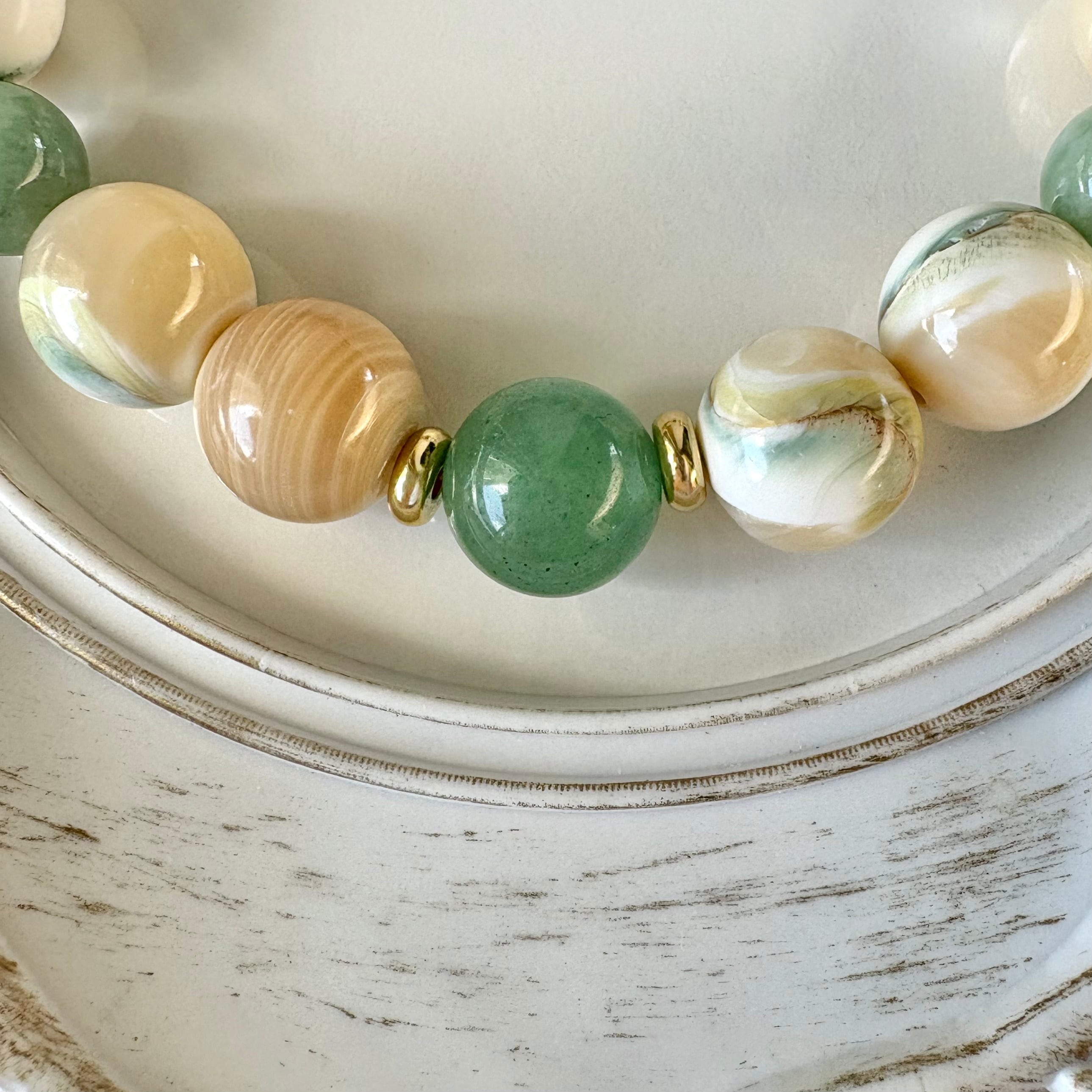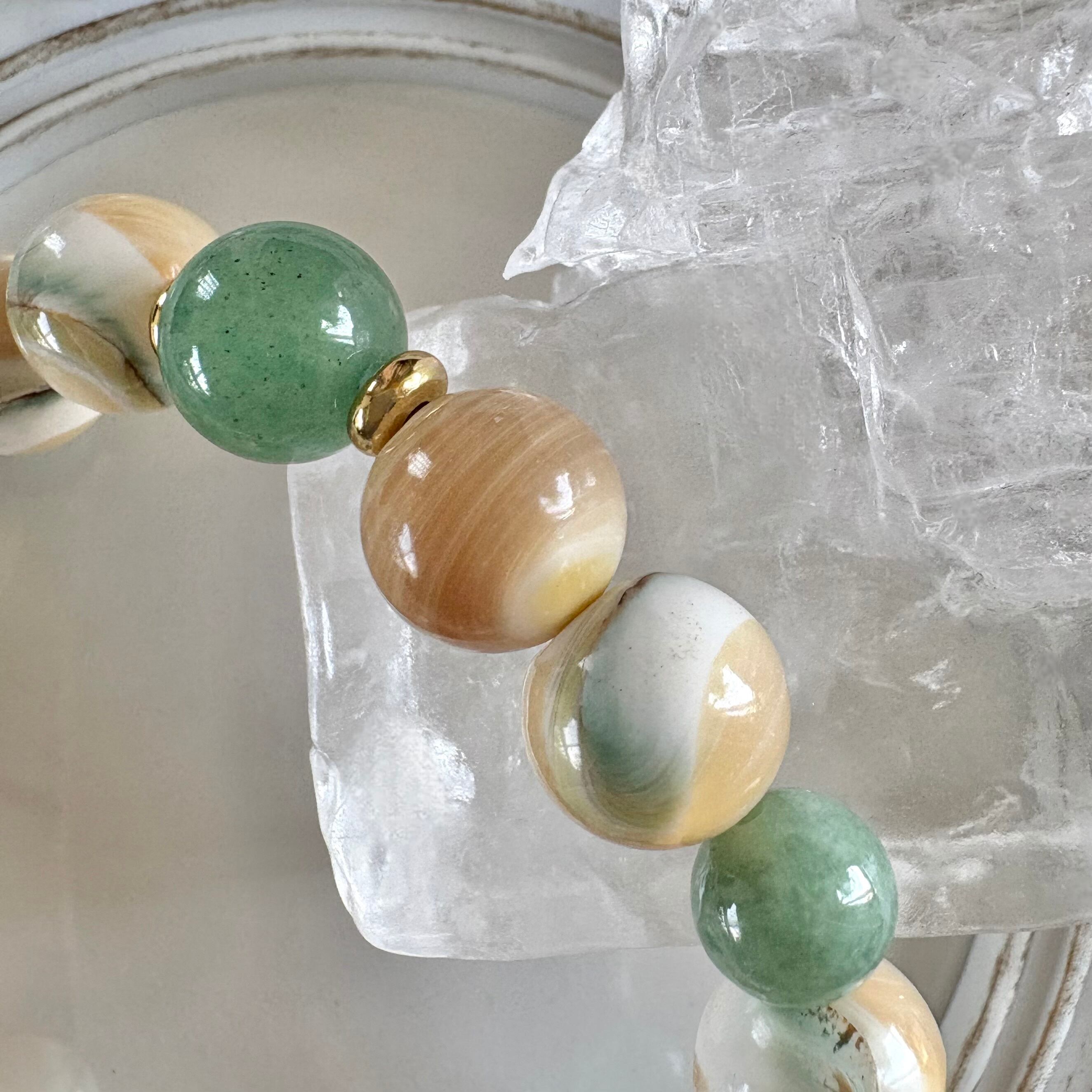 summerナチュラルブレスレット。マザーオブパール グリーンミックス × グリーンアベンチュリン × ビルマ翡翠