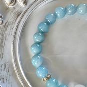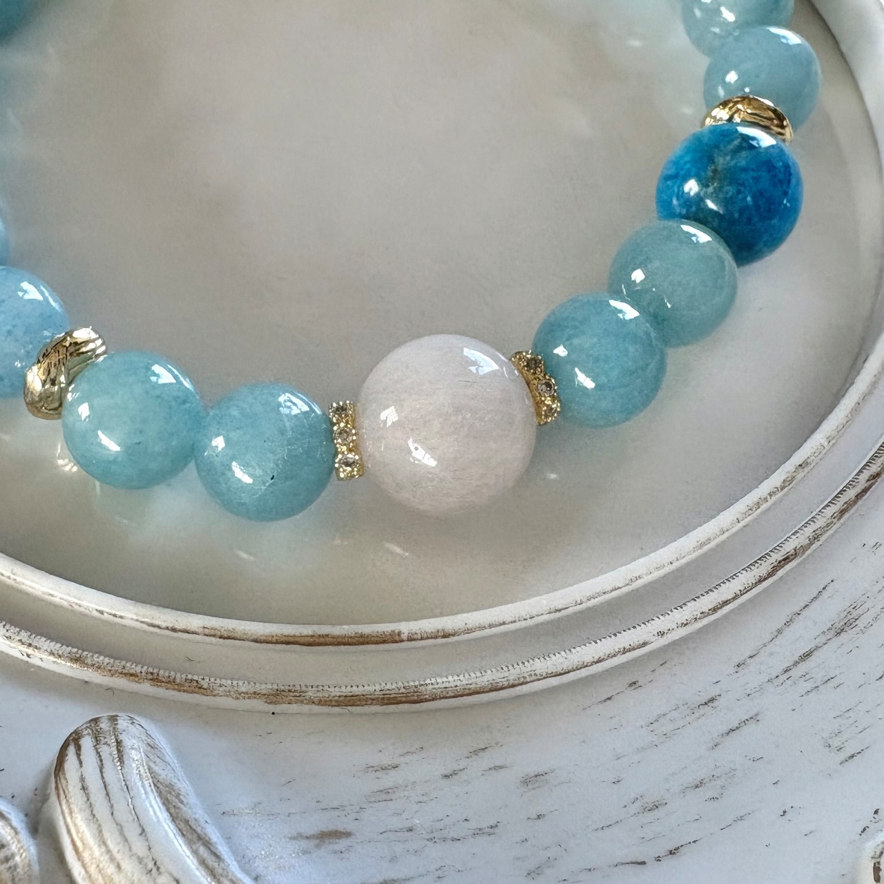 さらに、ディープアパタイトをアクセントにひと粒添えました。深い青が放つきらめきが、見る角度によって変化し、天然石ならではの奥行きを感じられます。やわらかな印象の中に、芯のあるエネルギーを感じる—そんな神秘的な魅力を持つブレスレットに仕上がりました。