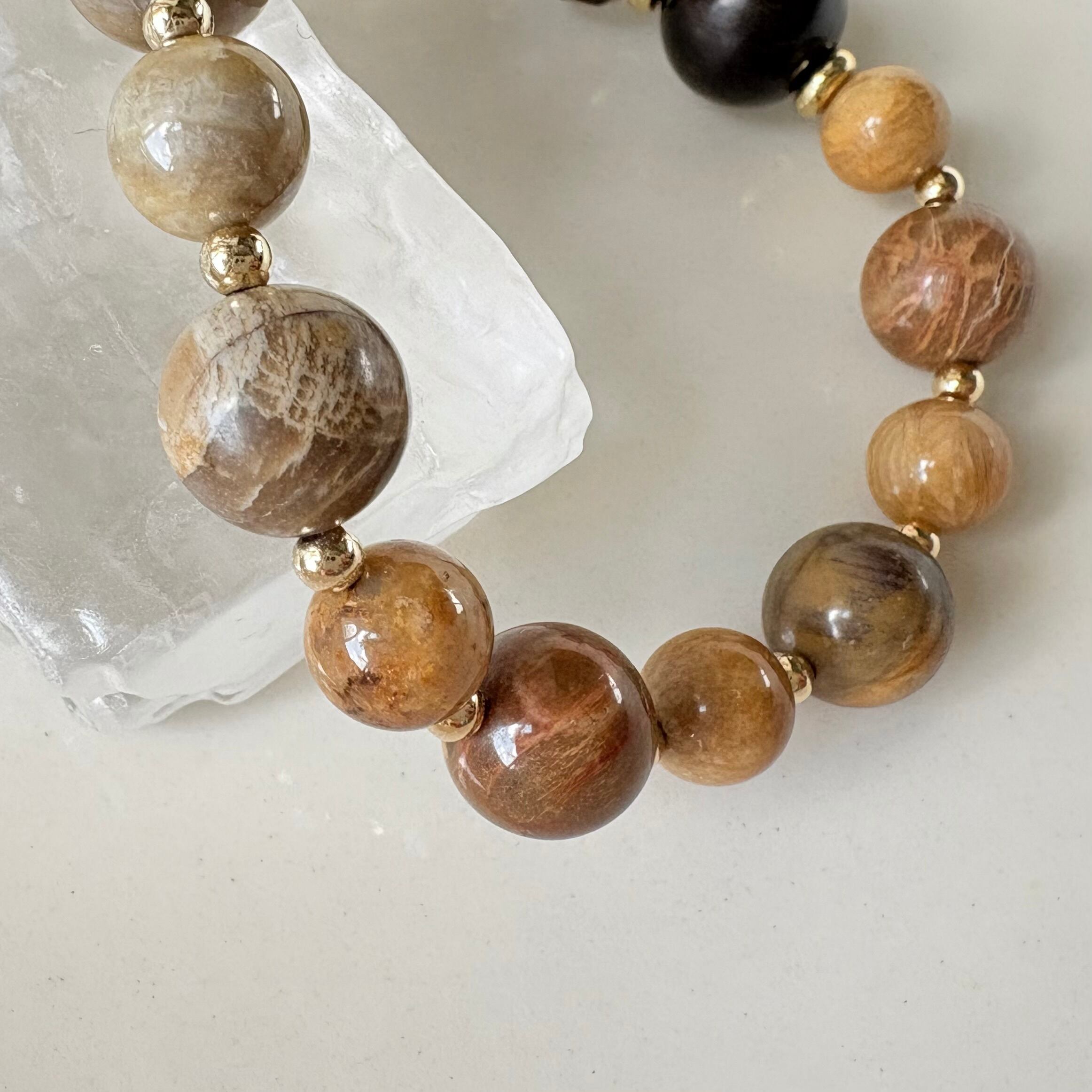 自然の記憶を纏うブレスレット✶エボニー(黒檀)×ペトリファイドウッド×フォシルコーラル×スモーキークォーツのデザインブレスレット