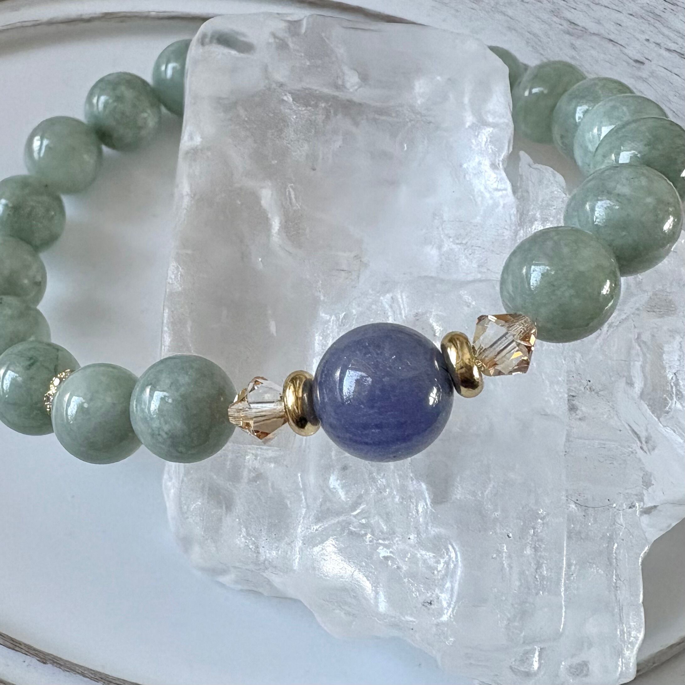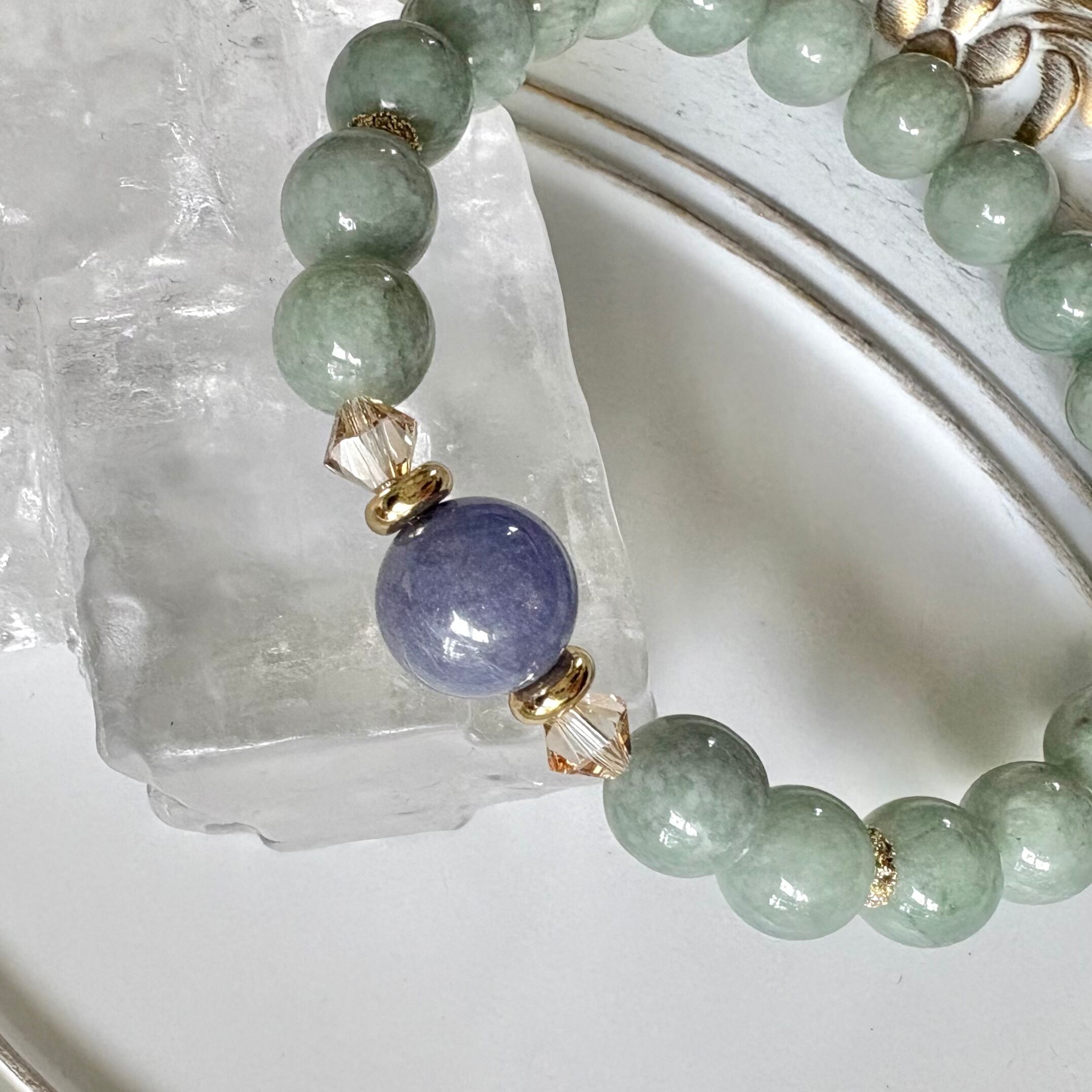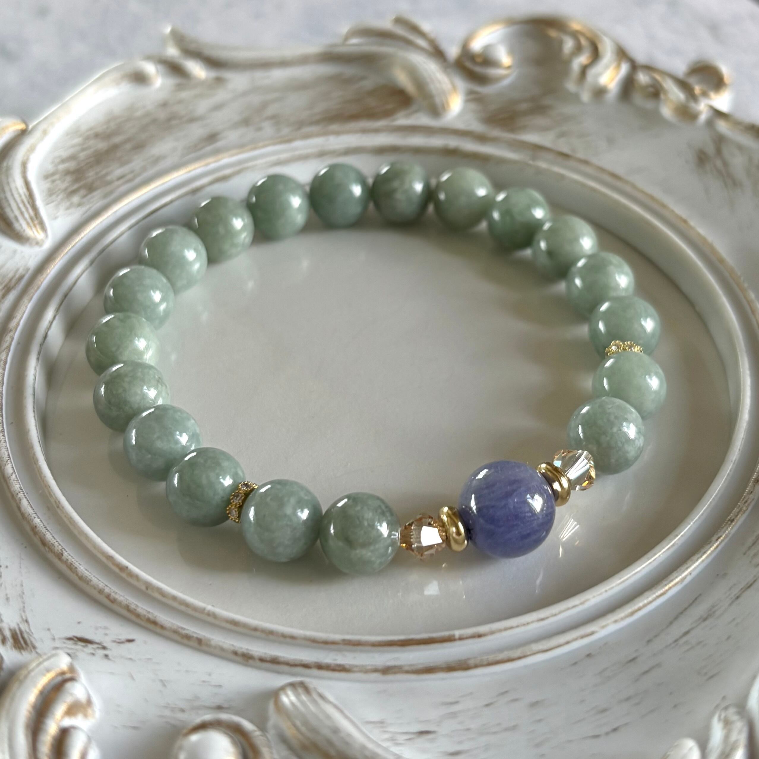 タンザナイトを一粒メインに、ビルマ翡翠を組み合わせた淡い色合いの上品なブレスレットです。持ち主の直感と判断力を高めるタンザナイトと、繁栄と安定をサポートするといわれるビルマ翡翠を使用しています。洗練された美しさとスピリチュアルなエネルギーを兼ね備えたこのブレスレットは、品格と幸福を引き寄せるお守りとしておすすめです。