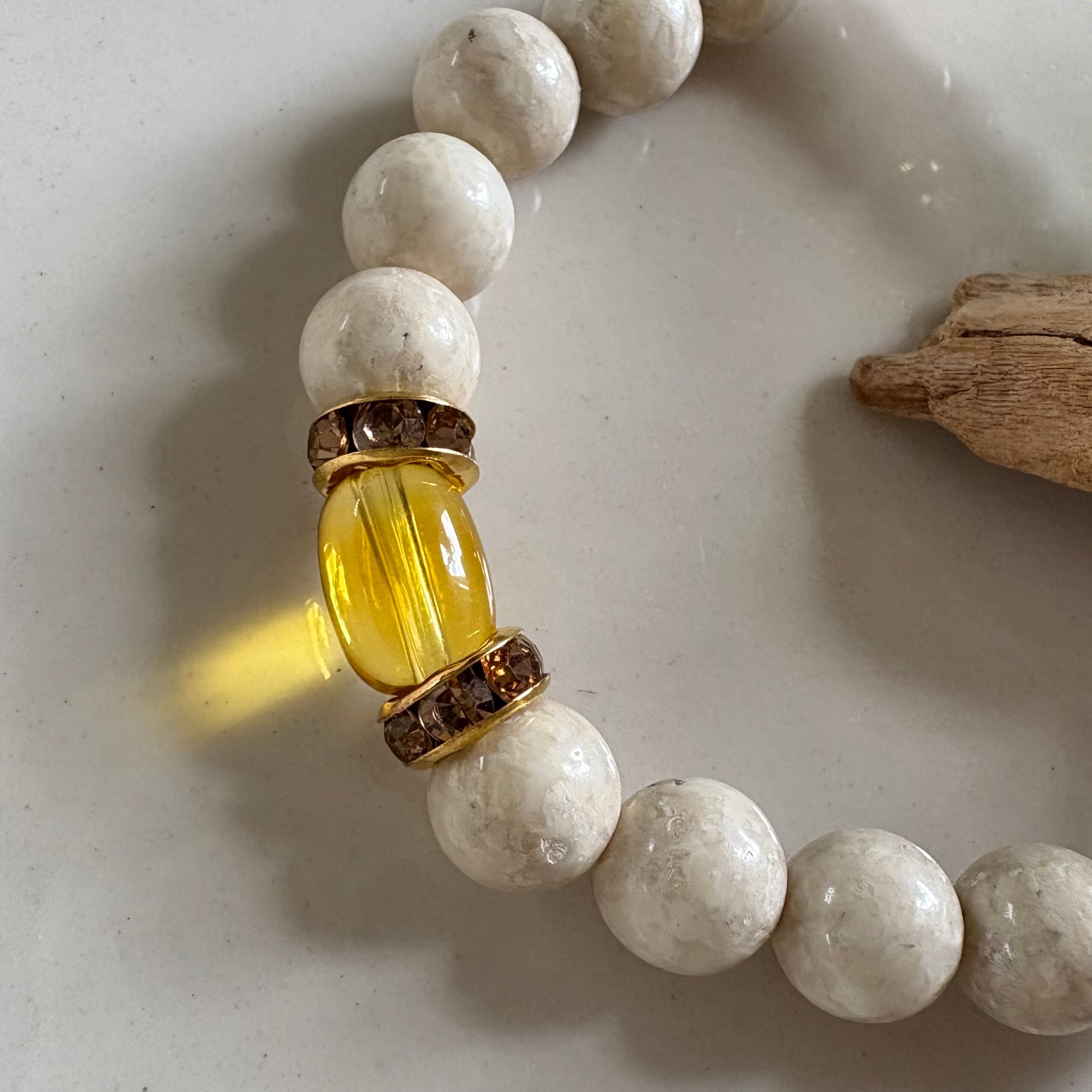 samirebi✶ホワイト内周16cm シトリン×リバーストーン×アクアブルーチェコガラス デザインブレスレット