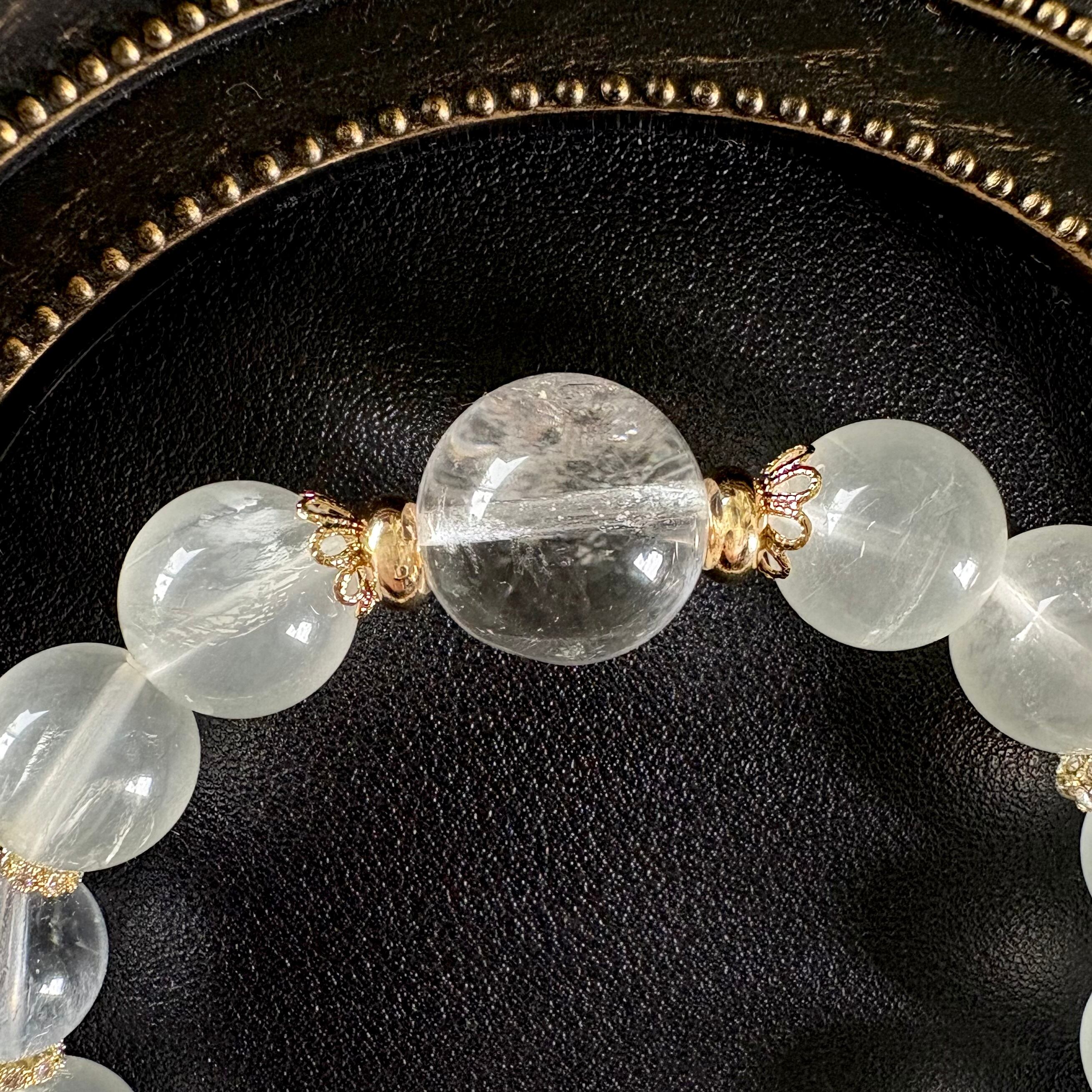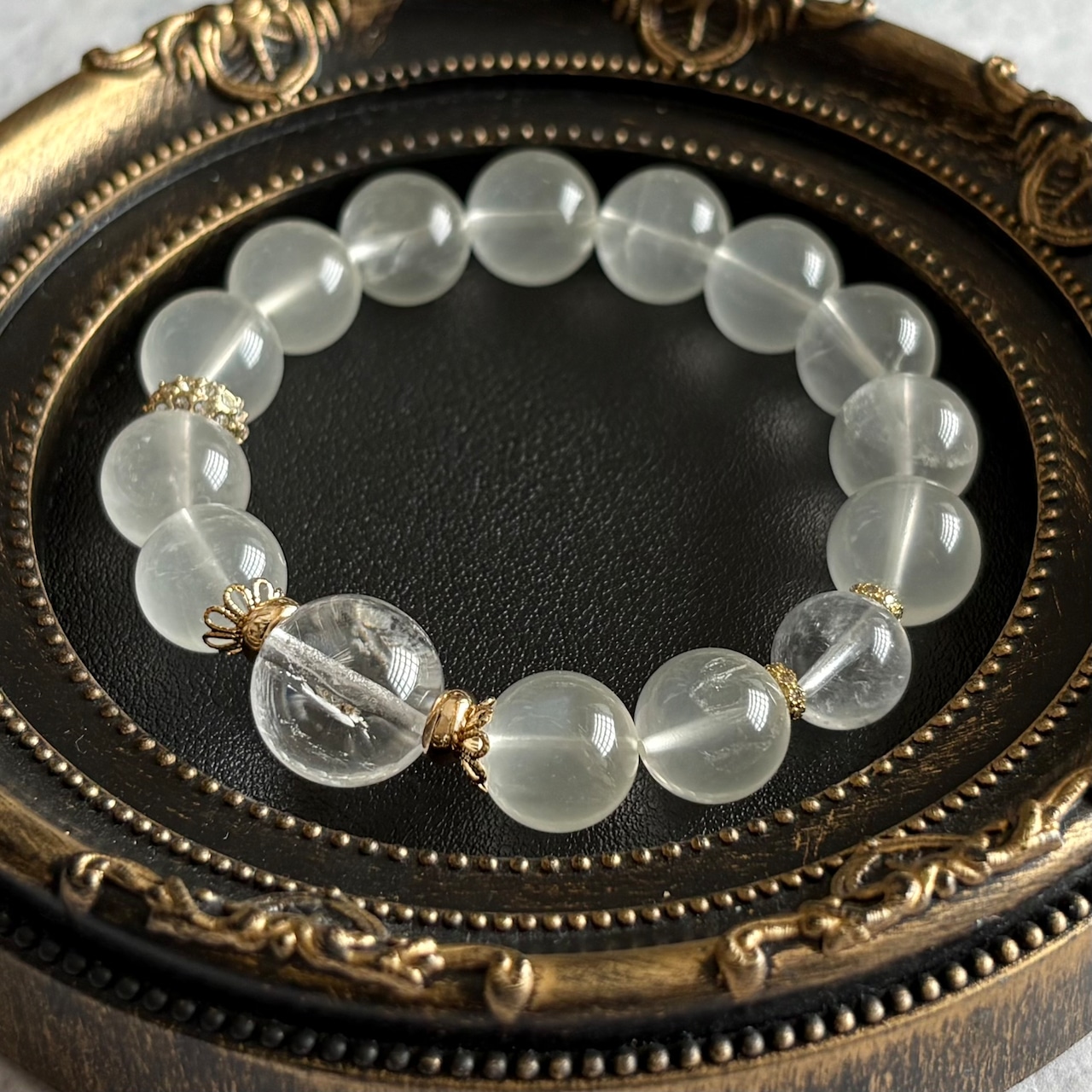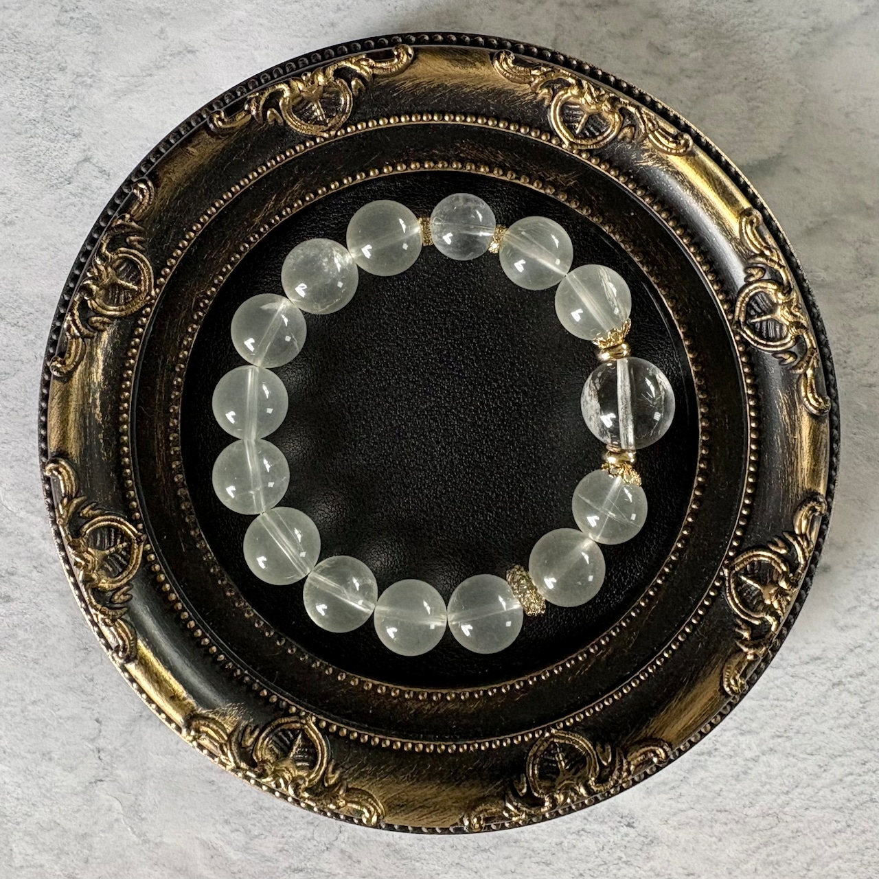 ブラジル・ミナスジェライス州でしか産出されず、強い変容のエネルギーを持つ高波動ストーンとして知られているオウロヴェルデクォーツ。浄化不要ともいわれるほど力強いこの石を主役に、エレスチャルとヒマラヤ産アイスクォーツを組み合わせた、特別なオールクリスタルブレスレット。