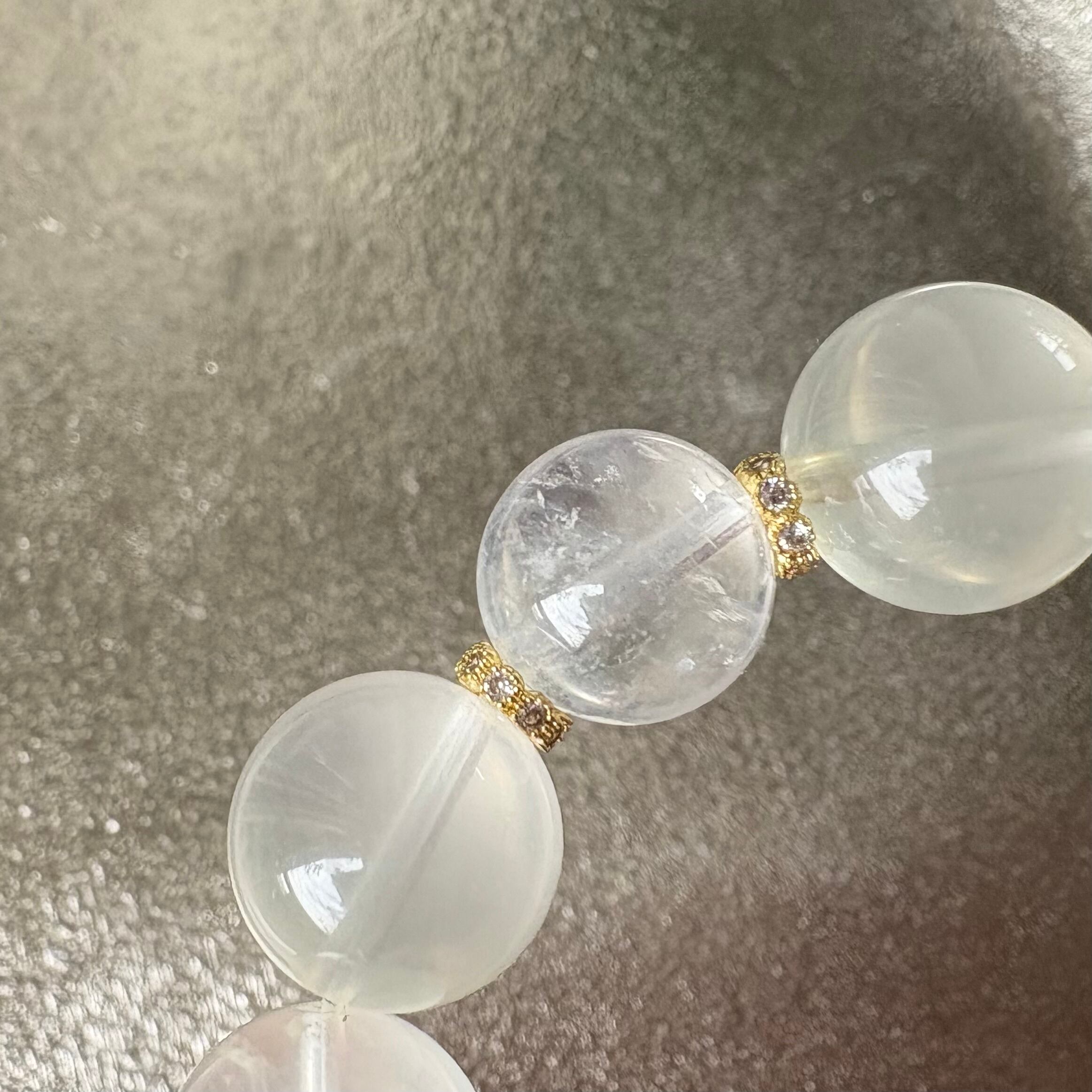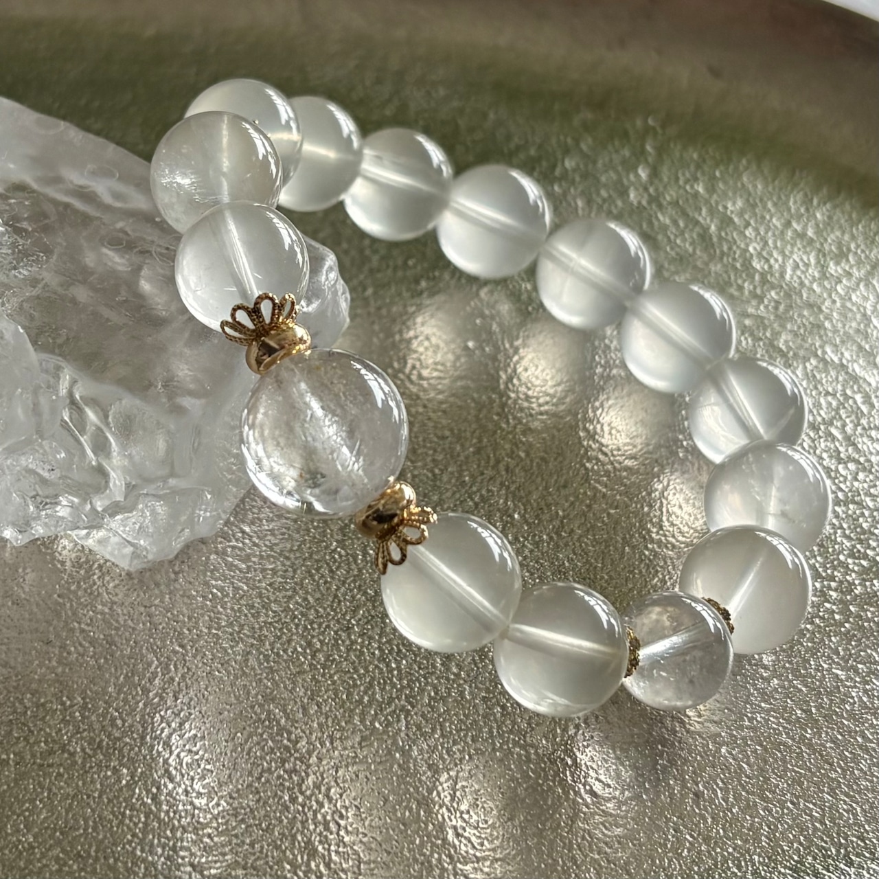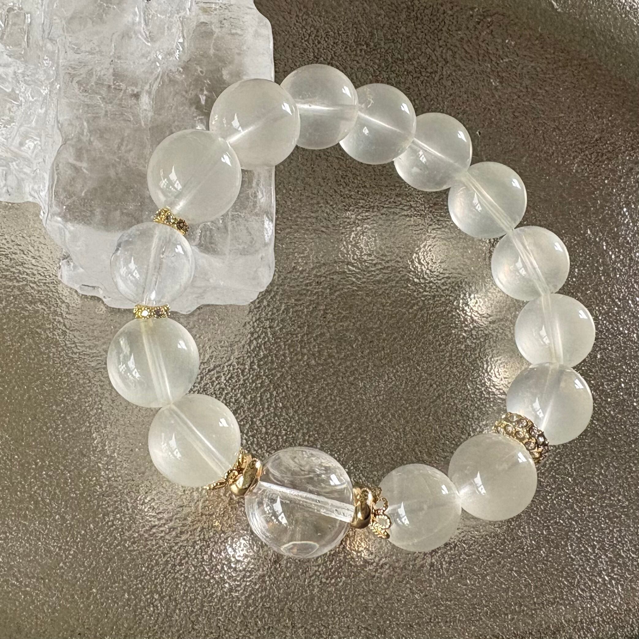 ブラジル・ミナスジェライス州でしか産出されず、強い変容のエネルギーを持つ高波動ストーンとして知られているオウロヴェルデクォーツ。浄化不要ともいわれるほど力強いこの石を主役に、エレスチャルとヒマラヤ産アイスクォーツを組み合わせた、特別なオールクリスタルブレスレット。