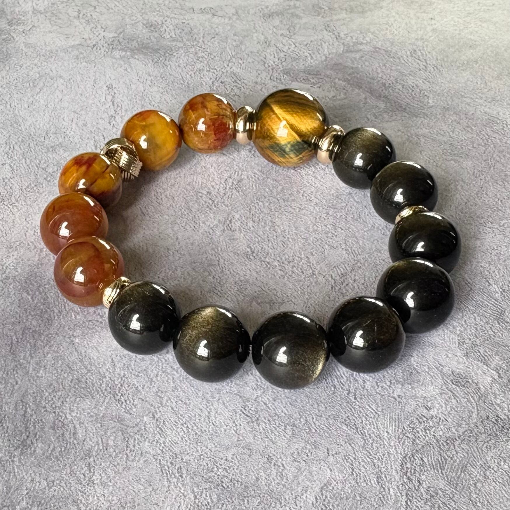 秋色に輝く強さと自信✶金運・仕事運✶イエロータイガーアイ×ゴールデンピーターサイト×ゴールデンオブシディアンのデザインブレスレット