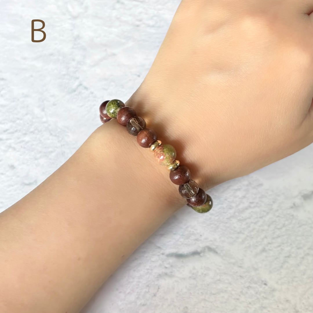 自然のぬくもり秋のナチュラルブレスレット✶ウッド×ユナカイト×スモーキークォーツ