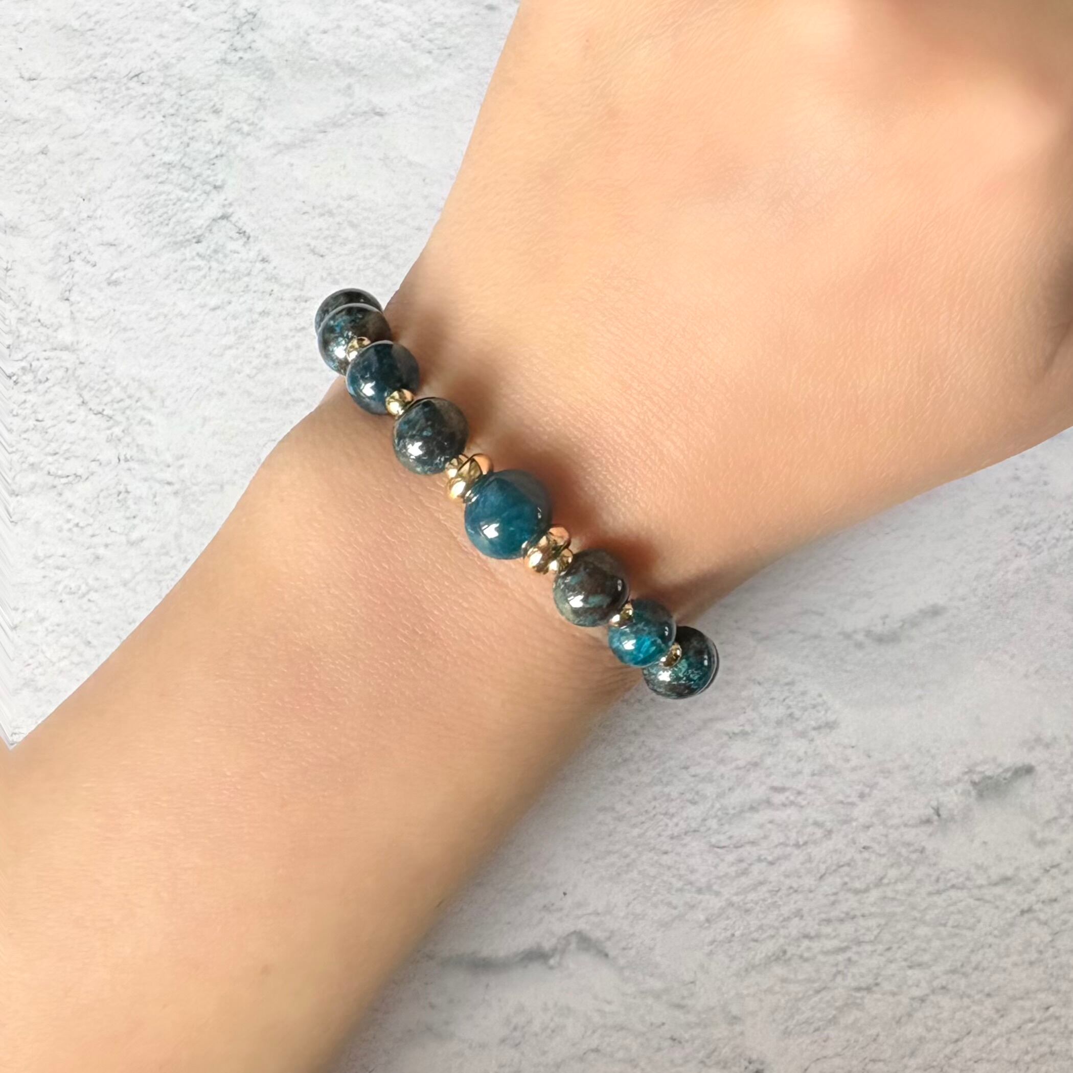 地球を思わせるような神秘的なブルーグリーンが印象的な、クリソコラとディープアパタイトのデザインブレスレットです。