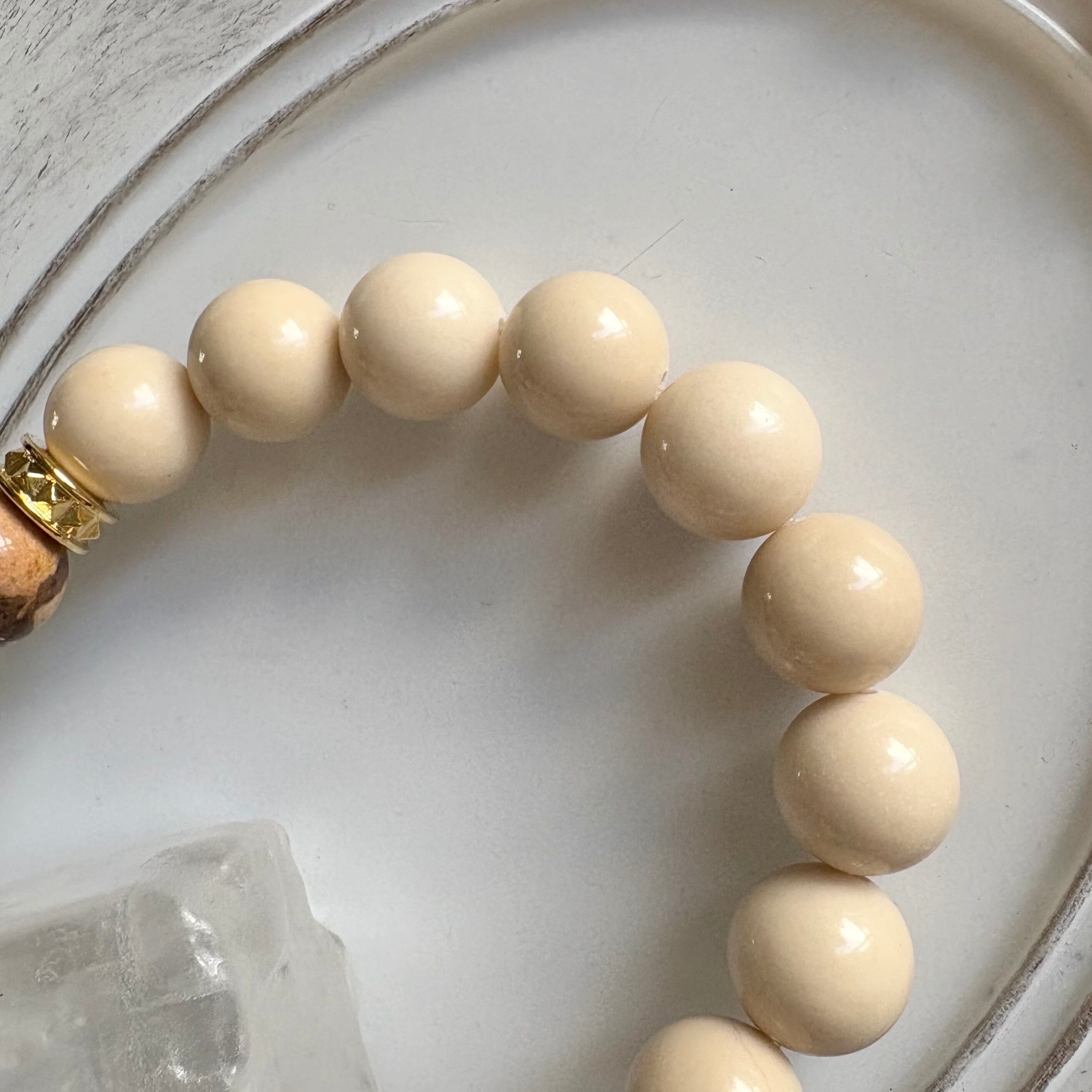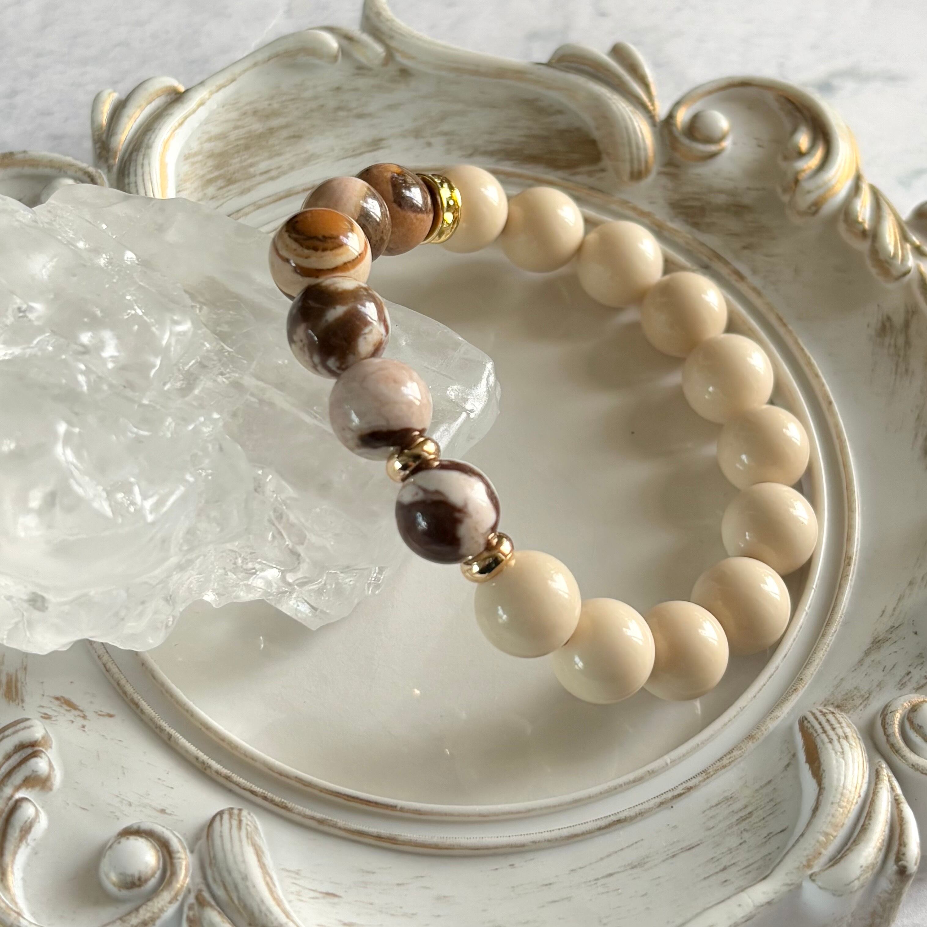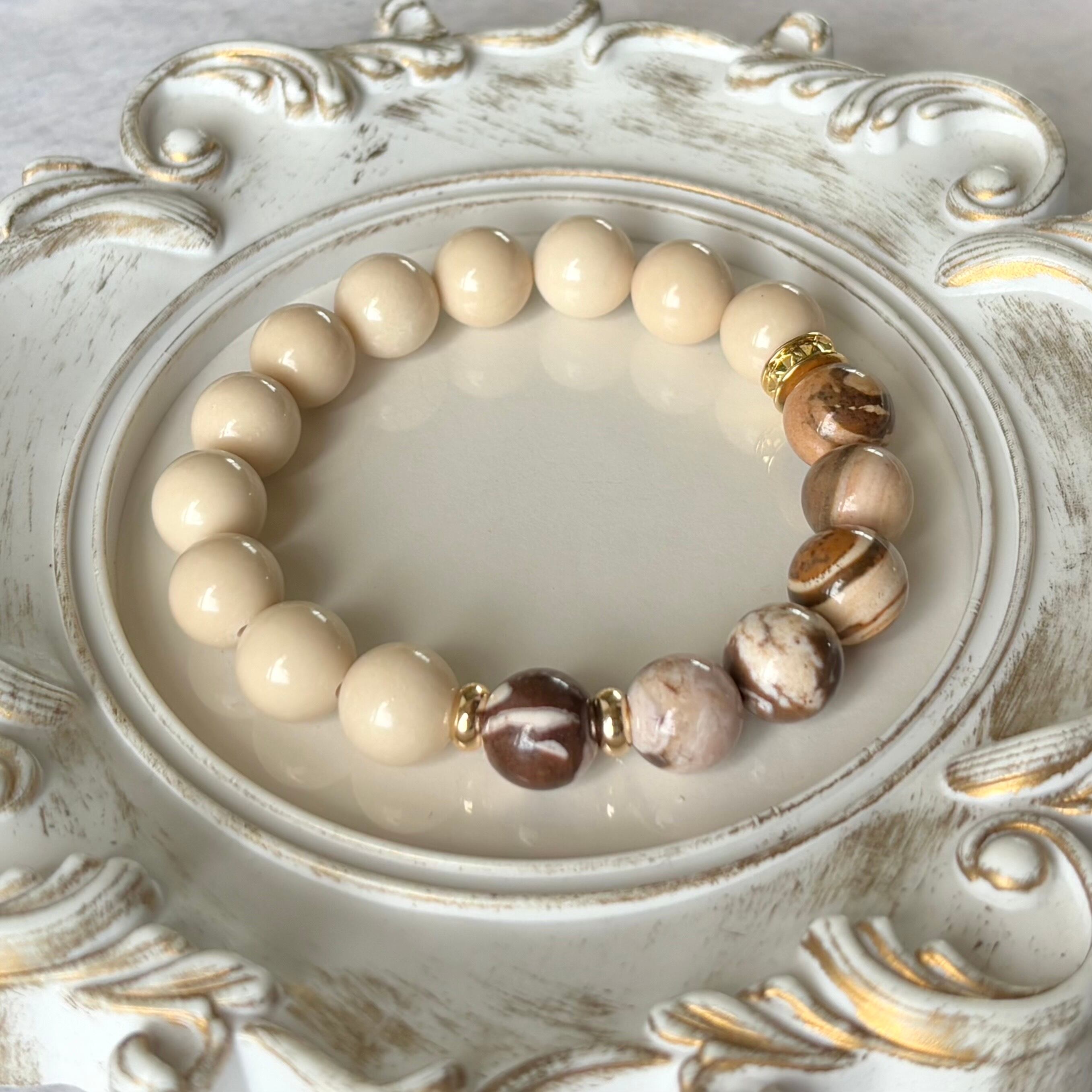 まるでホワイトチョコレートを思わせるコロンとしたフォルムと柔らかな色合いのリバーストーン。そしてコーヒーにミルクを溶かしたような独特の模様が美しいカプチーノジャスパーを組み合わせた上品で可愛らしいブレスレットです。