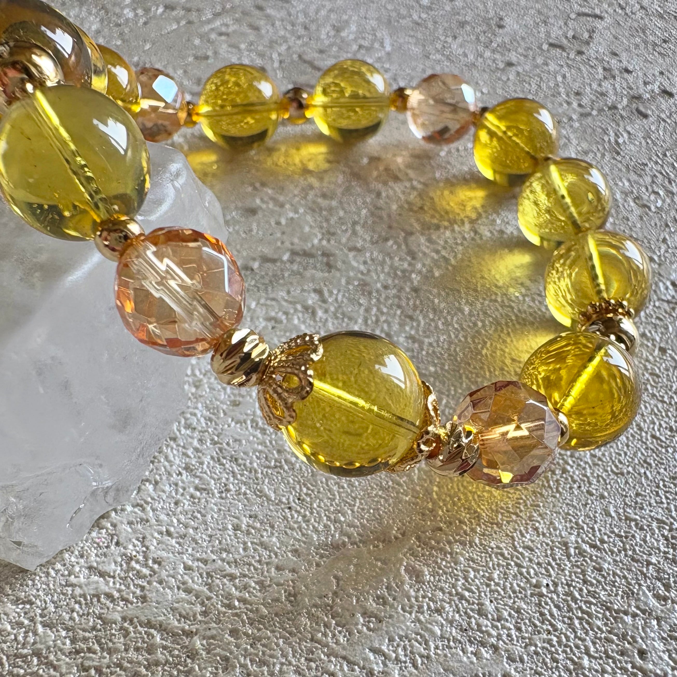 その幻想的な光を引き立てるように、繊細な光沢を持つゴールデンオーラクリスタルを組み合わせました。透明感の中にシャープな輝きを宿し、手元に品のある華やかさを添えます。