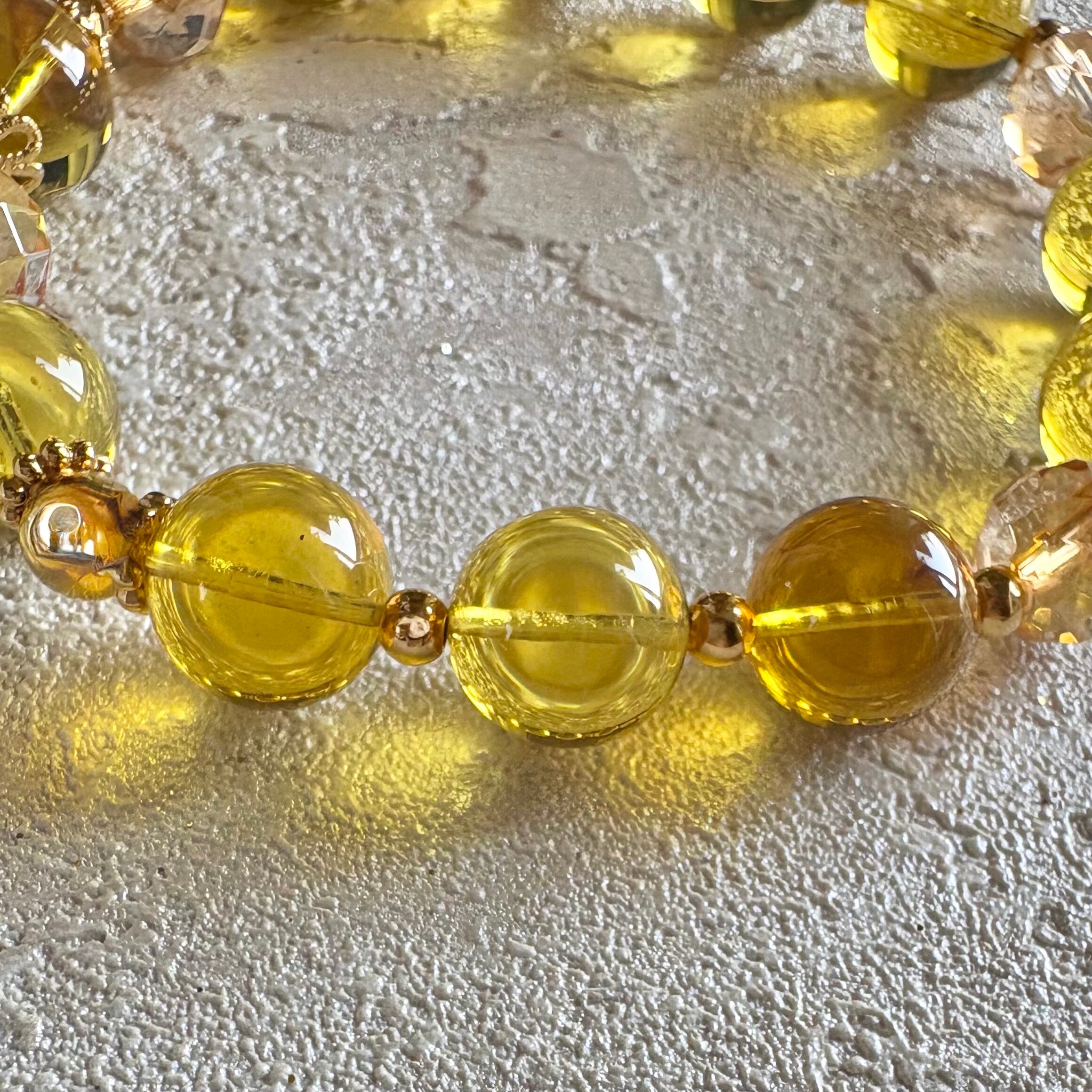 青い光が浮かび上がる天然琥珀✶ブルーアンバー×ゴールデンオーラクリスタルデザインブレスレット