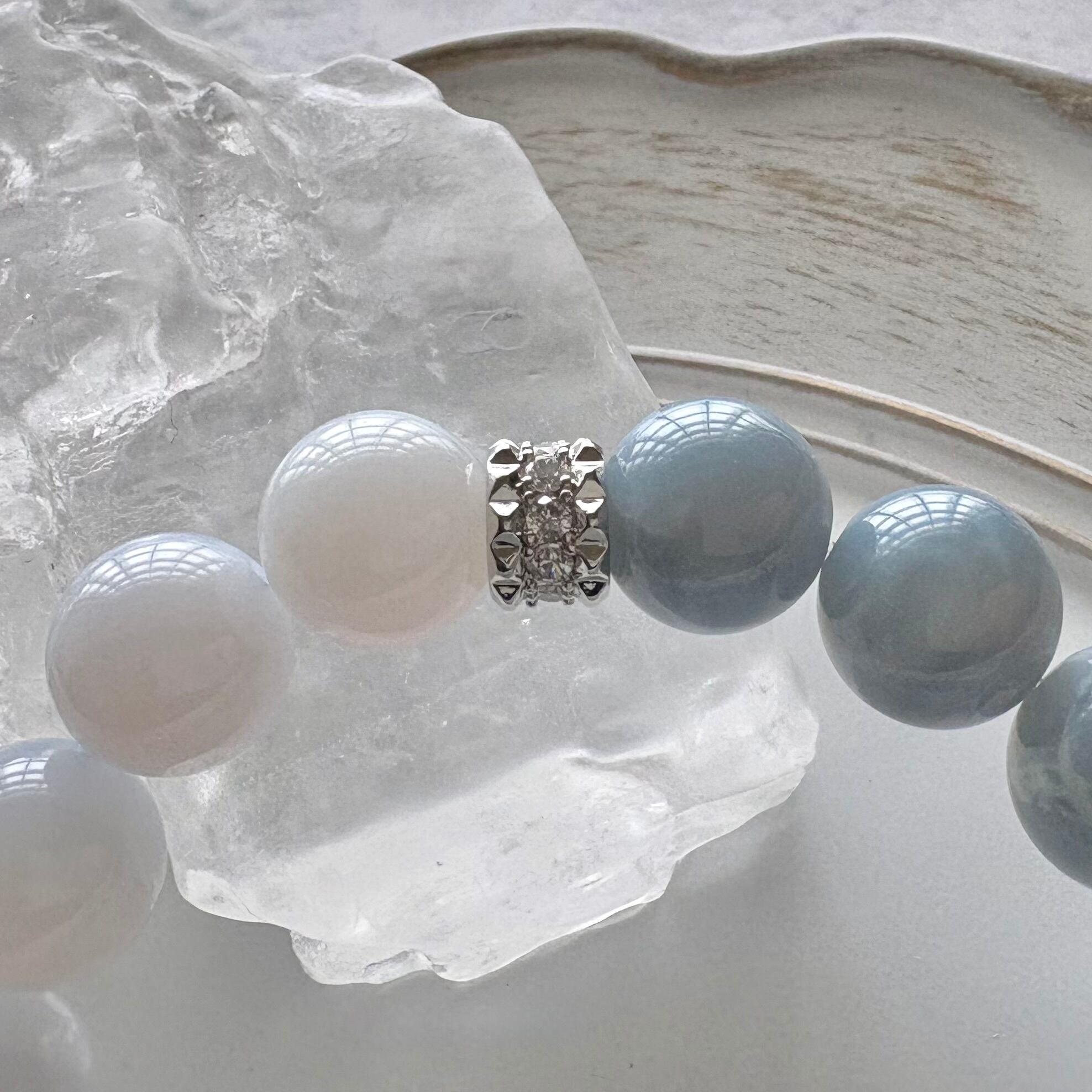 こちらの石はふんわりとしたミルキーなブルーレースアゲートです。心を落ち着かせる・コミュニケーションのサポート・穏やかな人間関係といった意味を持ち、優しい雰囲気を与える天然石です。ブルーオパールと並ぶことで、より清らかで柔らかな印象に。