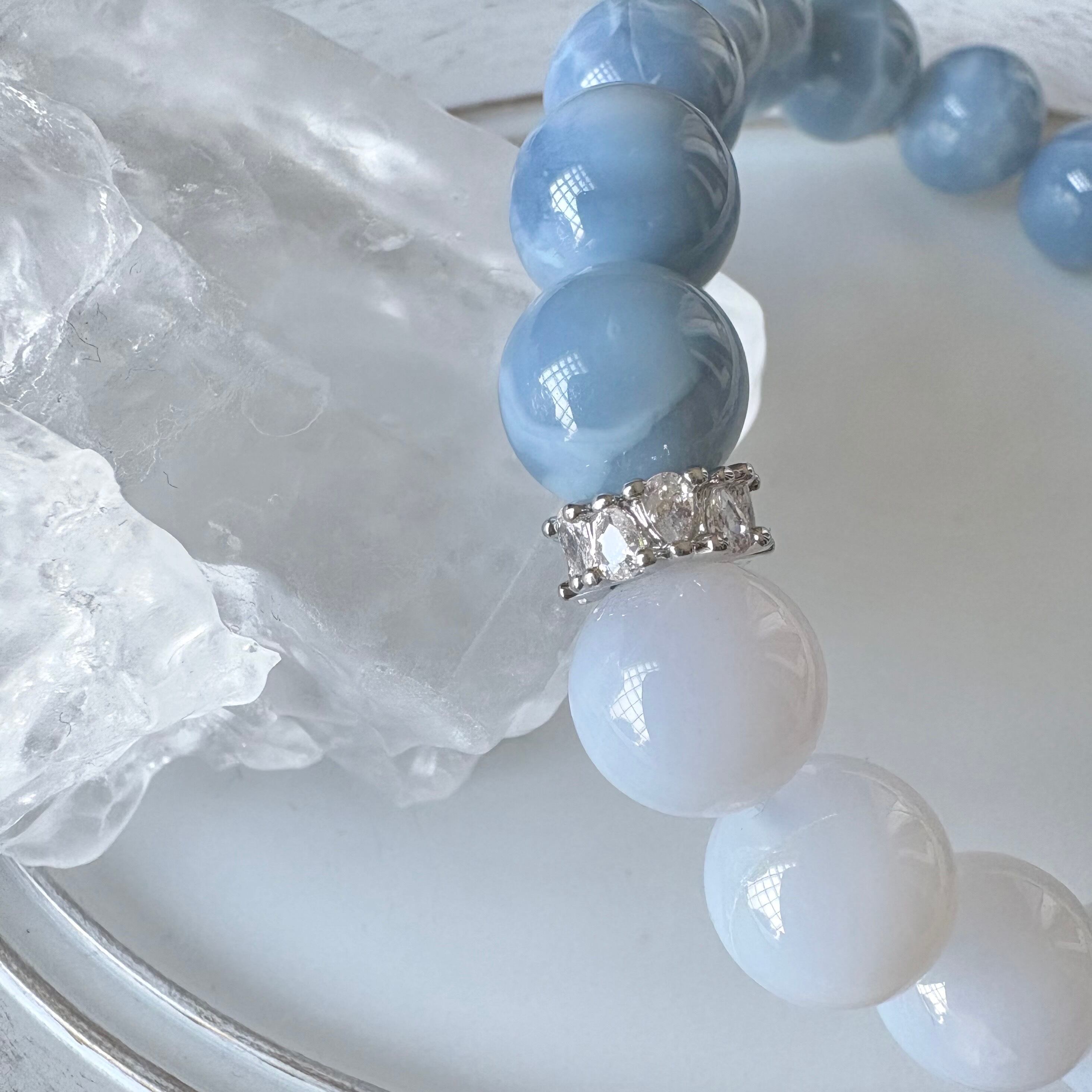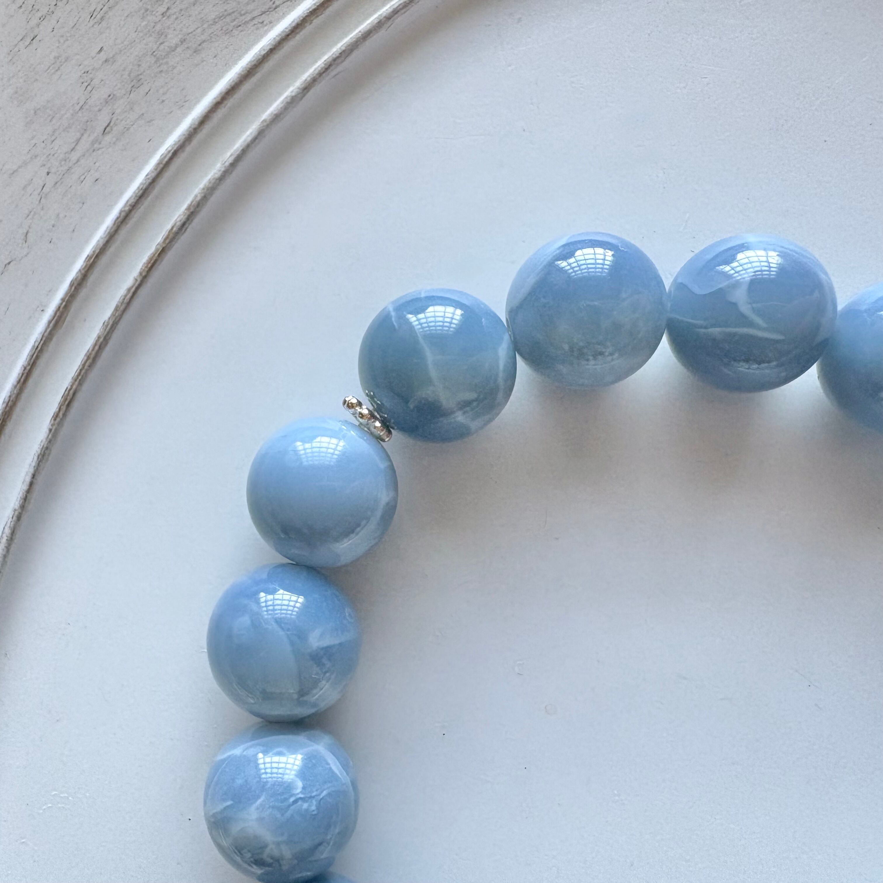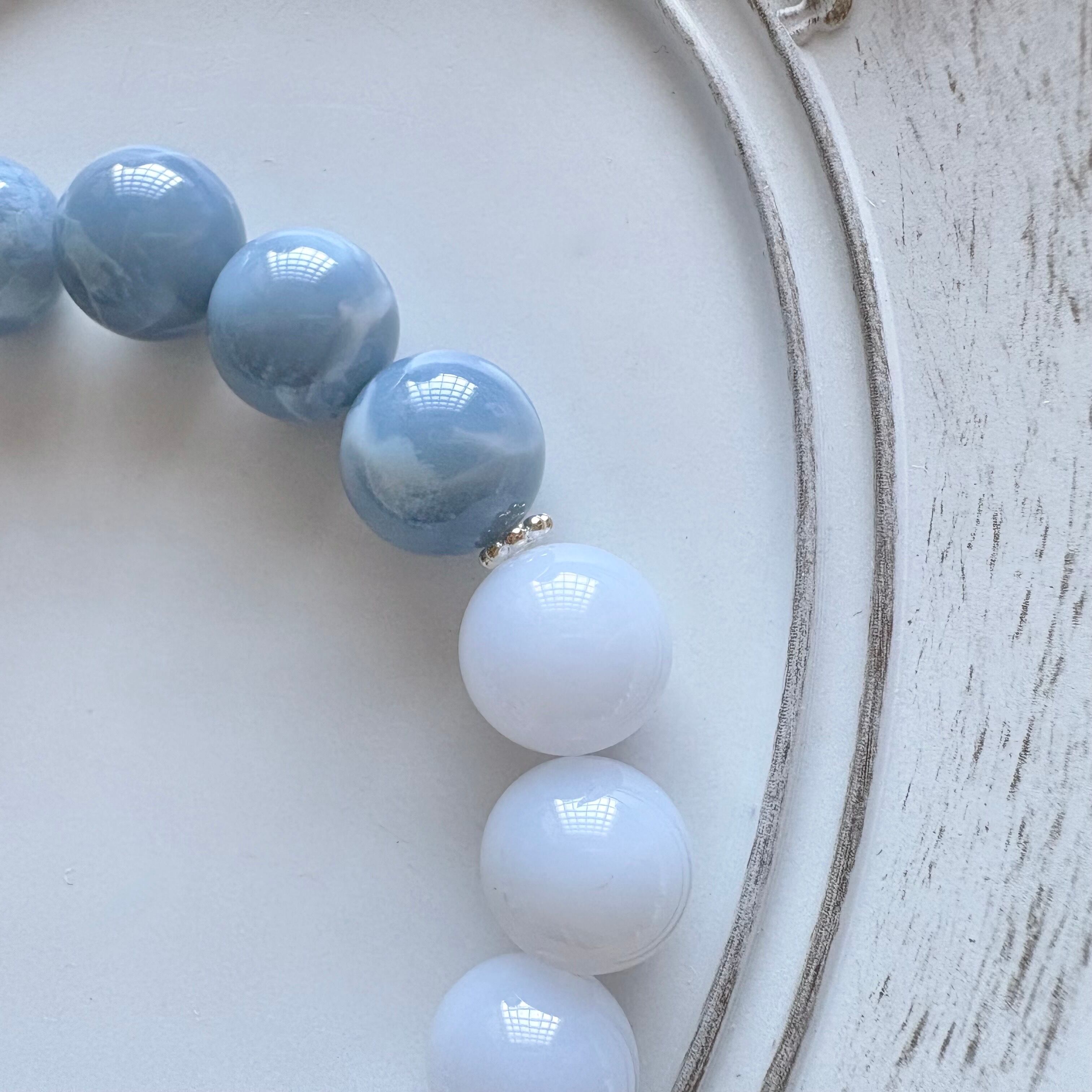 まるで“空色の陶器”を思わせる、なめらかな艶と優しいブルー。希少なオーストラリア産ブルーオパールに、上品でミルキーなブルーレースアゲートを組み合わせた、清らかさと柔らかさを併せもつブレスレットです。
