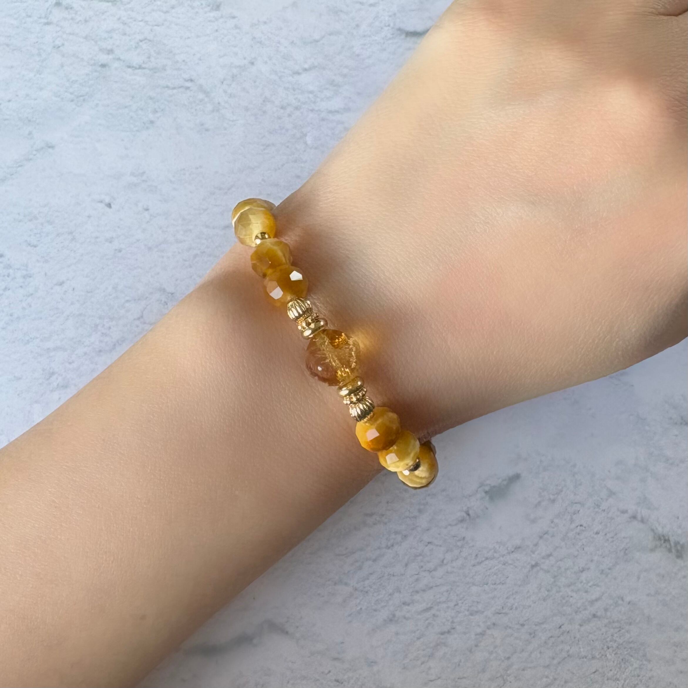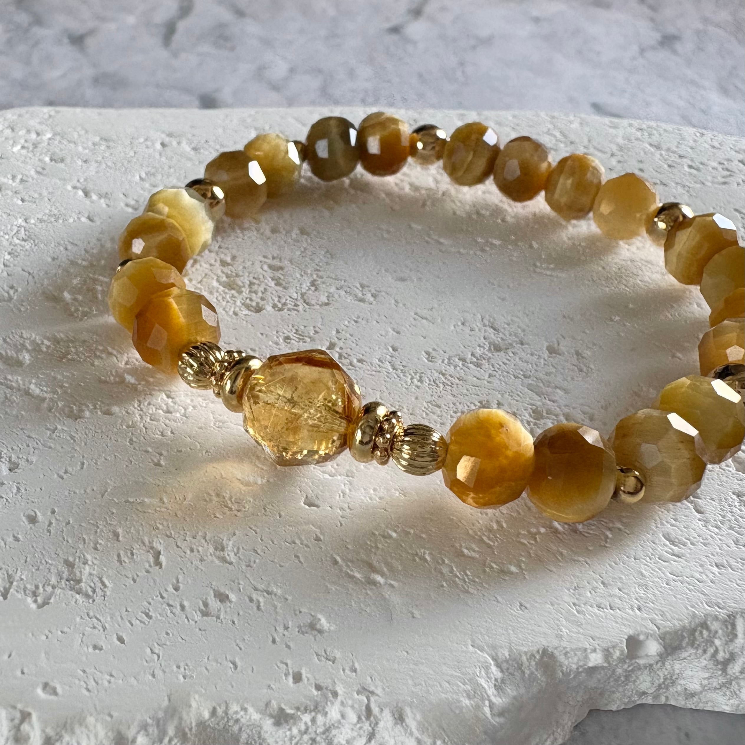 煌めきの美しいボタンカットのタイガーアイをベースに、トップにはブランデーカラーのシトリンをセレクト。品のある黄金色が手元にやさしく馴染む、エレガントな金運ブレスレットです。