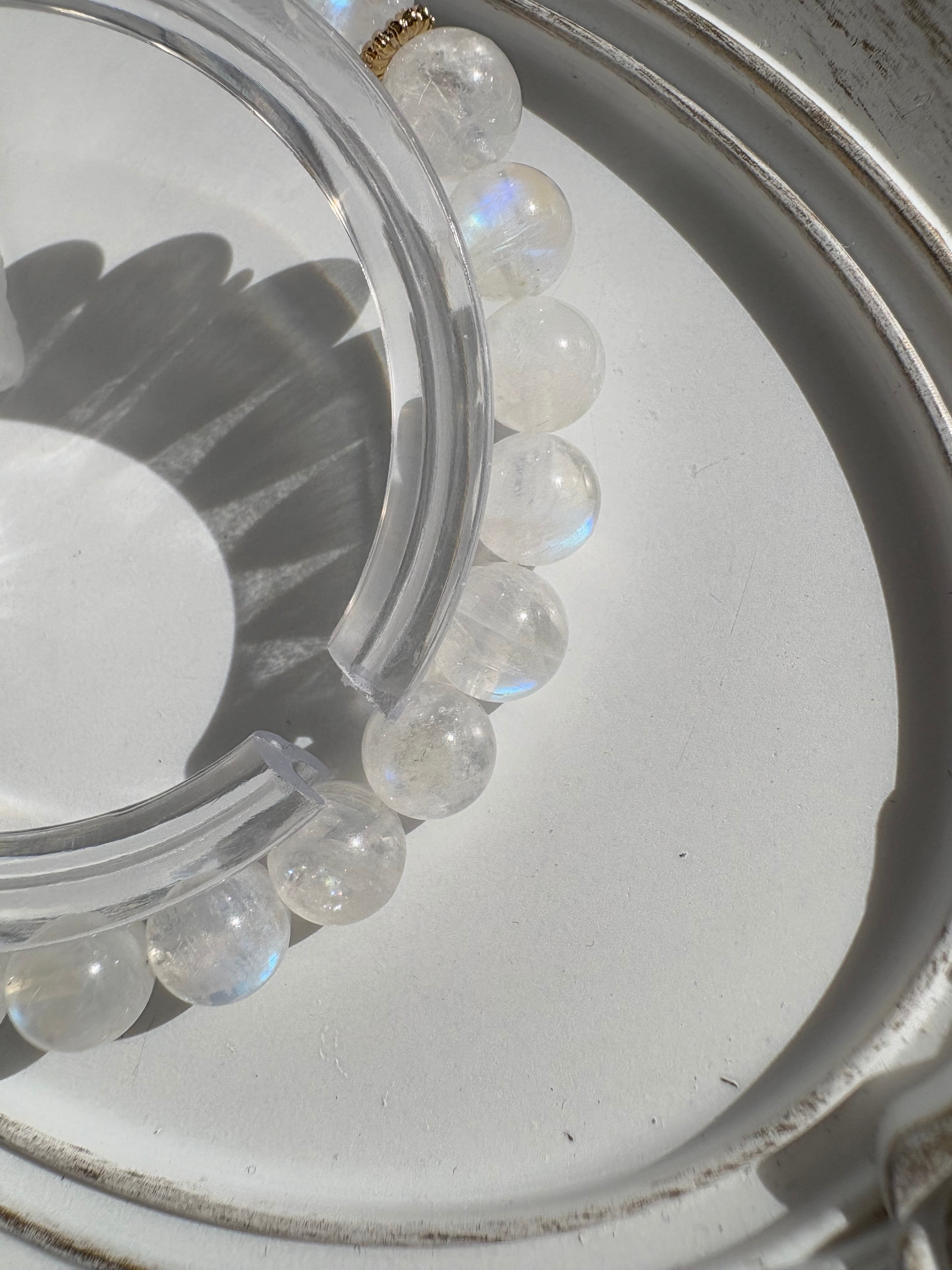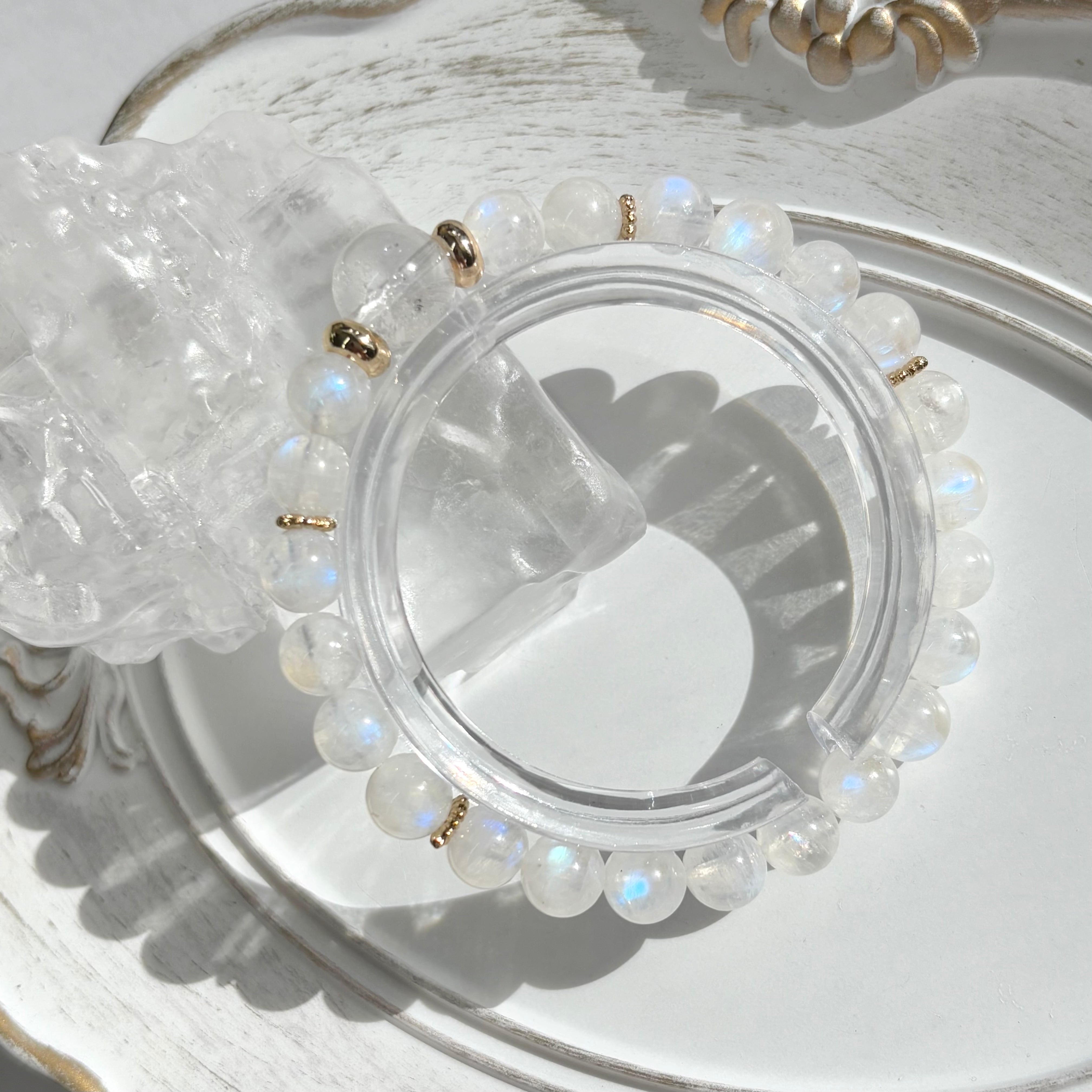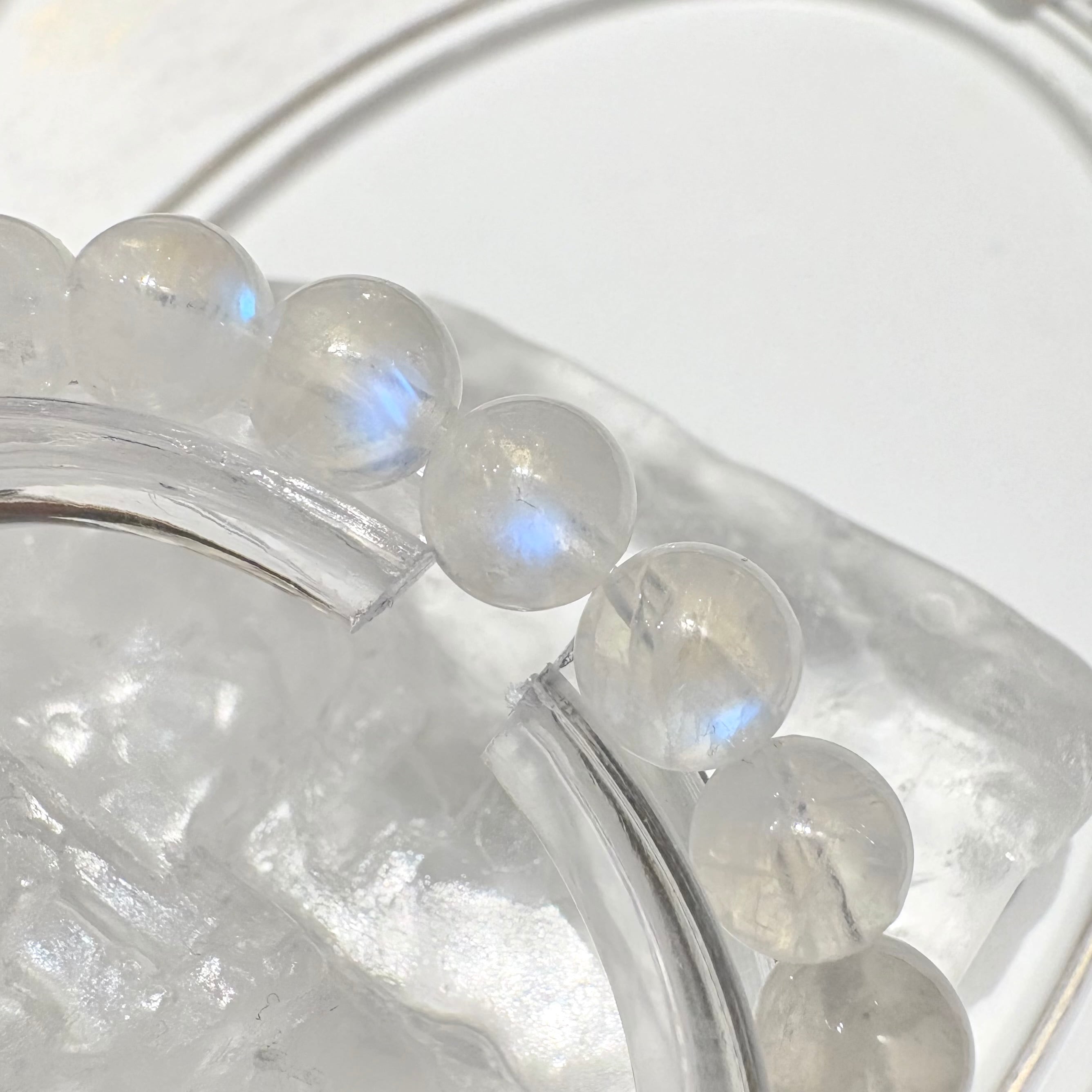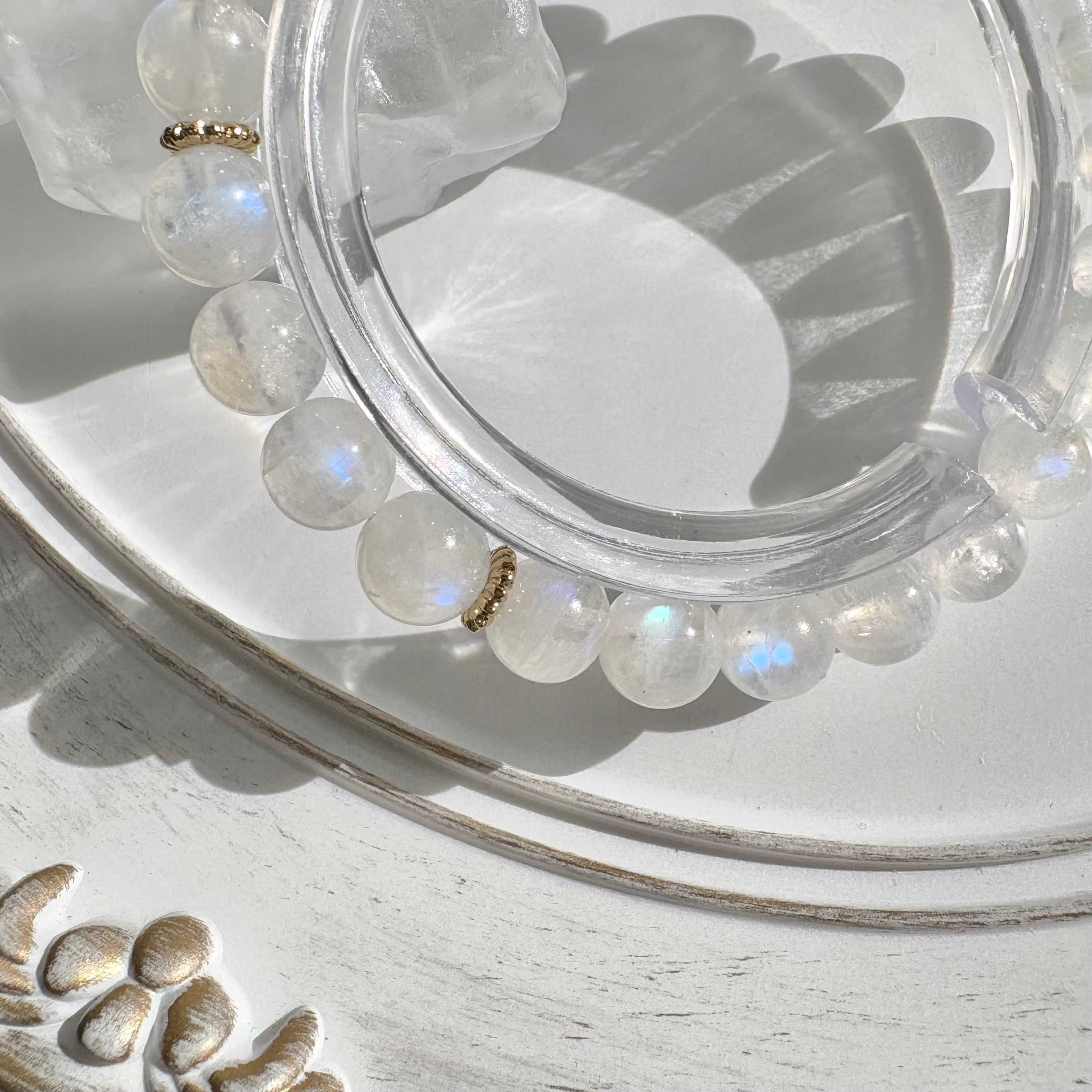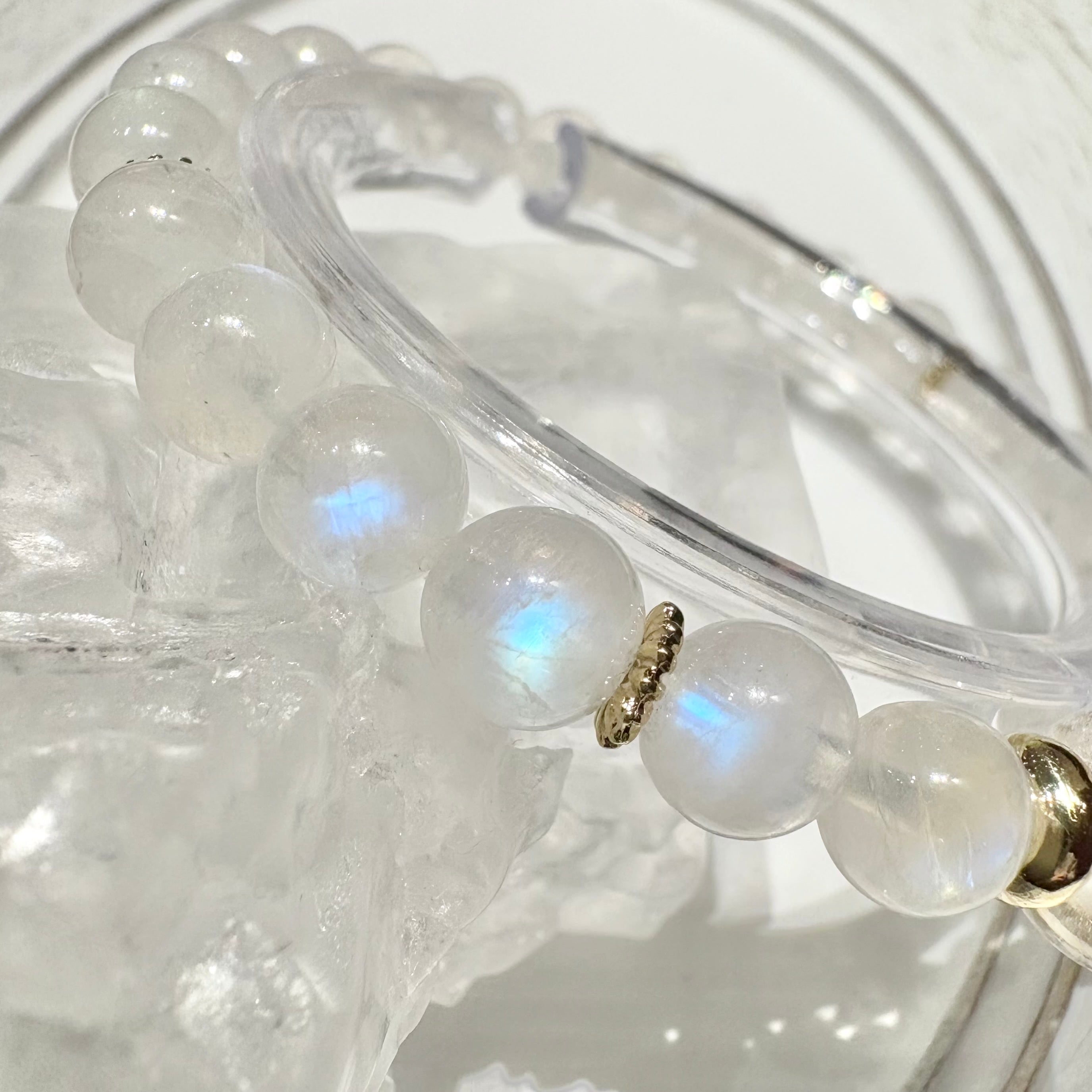 やわらかな月光をそのまま閉じ込めたような、神秘的な輝き。インド産ブルームーンストーンの、やさしく静かな光が手元にそっと寄り添うブレスレットです。