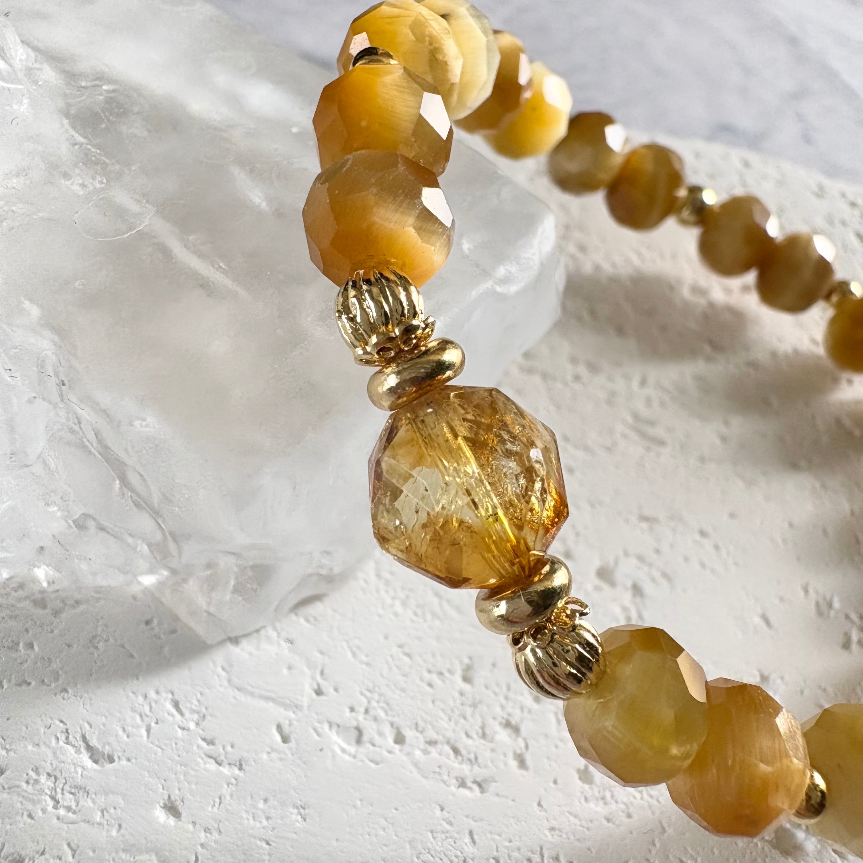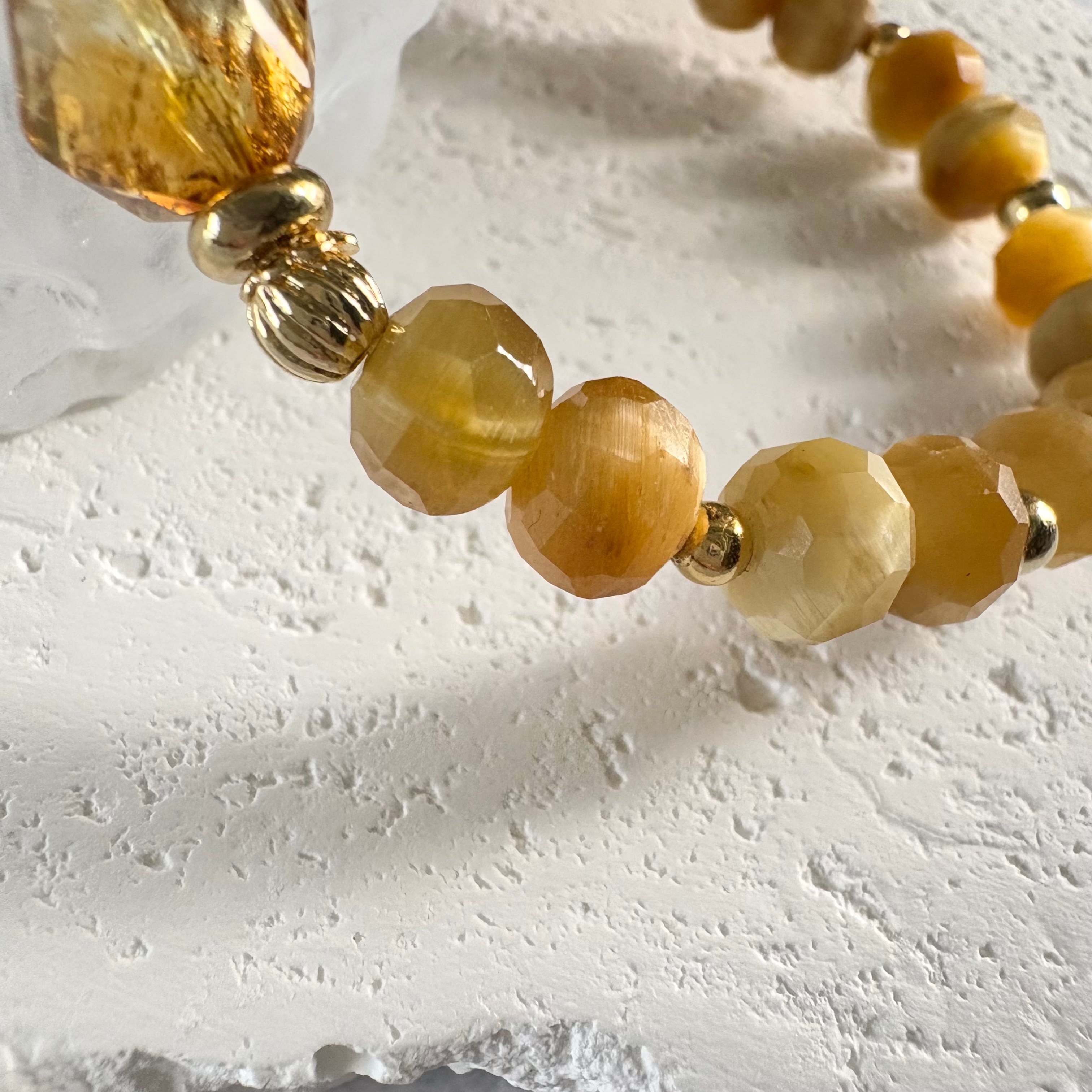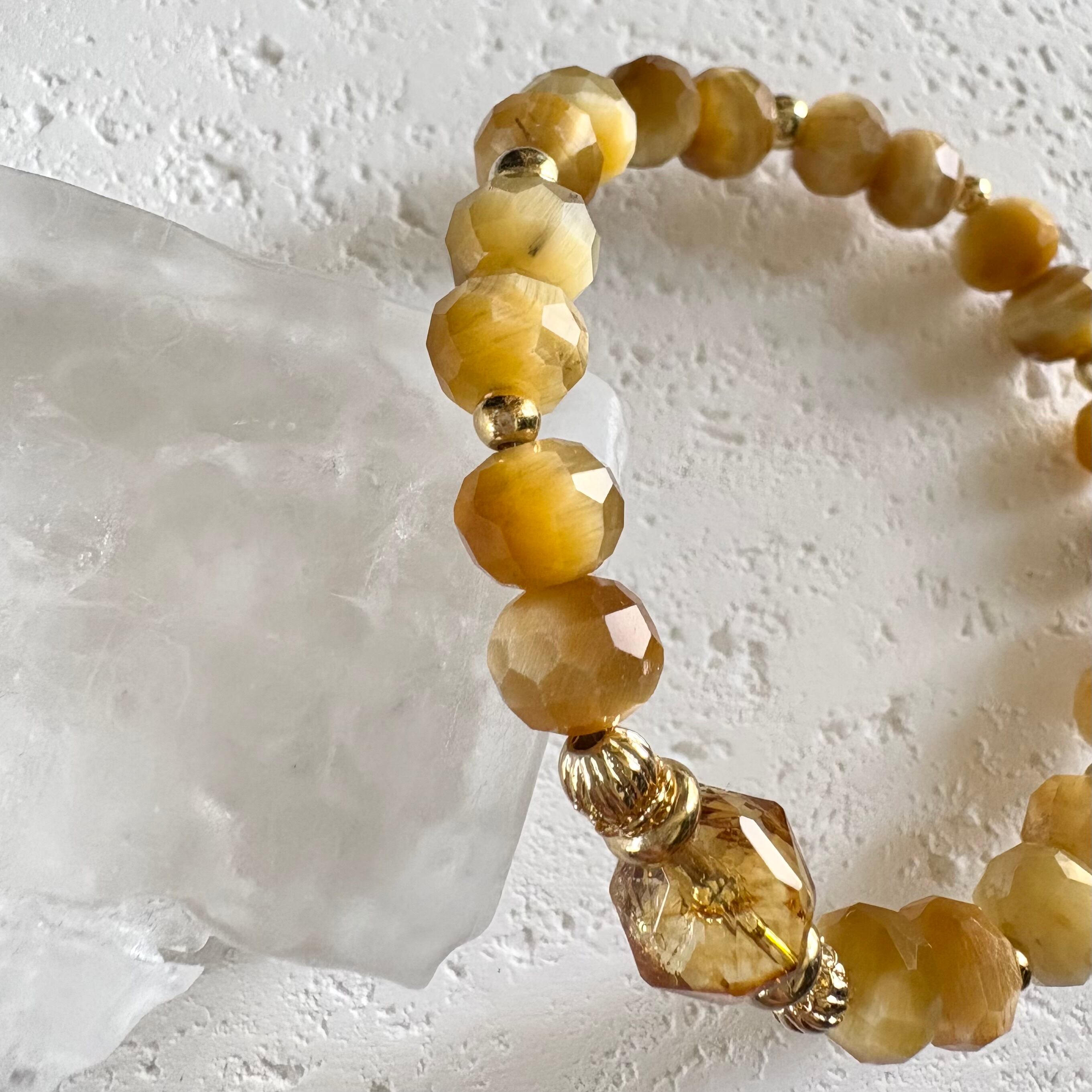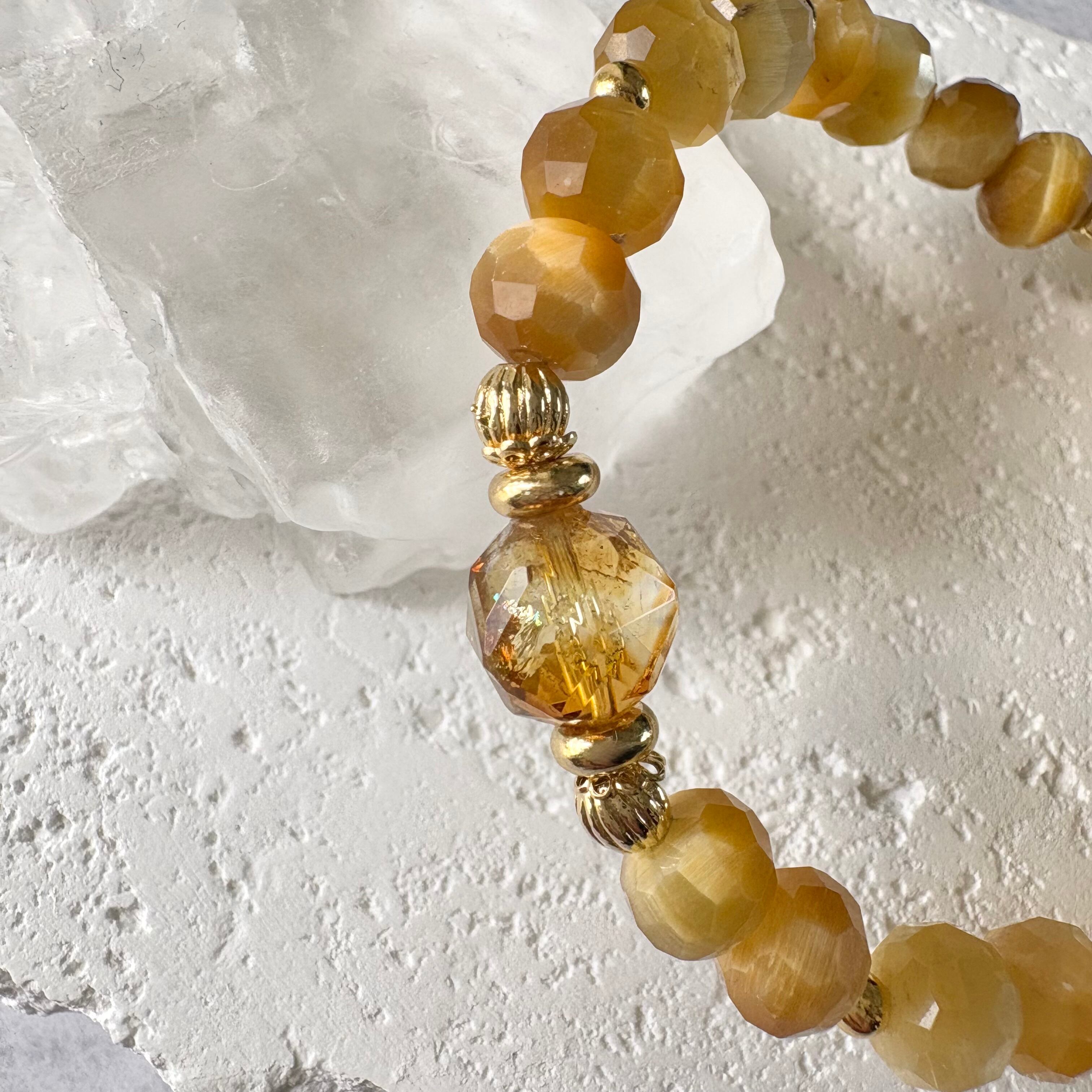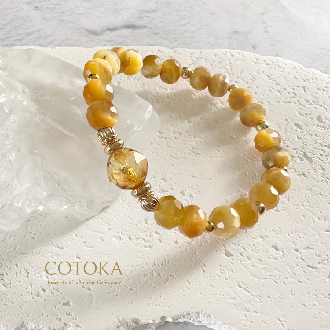 煌めきの美しいボタンカットのタイガーアイをベースに、トップにはブランデーカラーのシトリンをセレクト。品のある黄金色が手元にやさしく馴染む、エレガントな金運ブレスレットです。