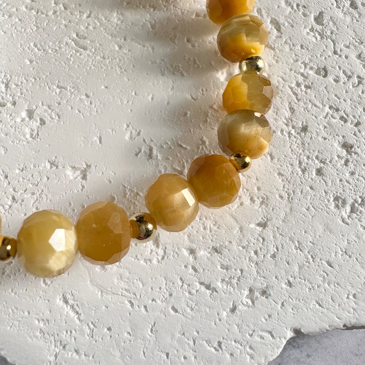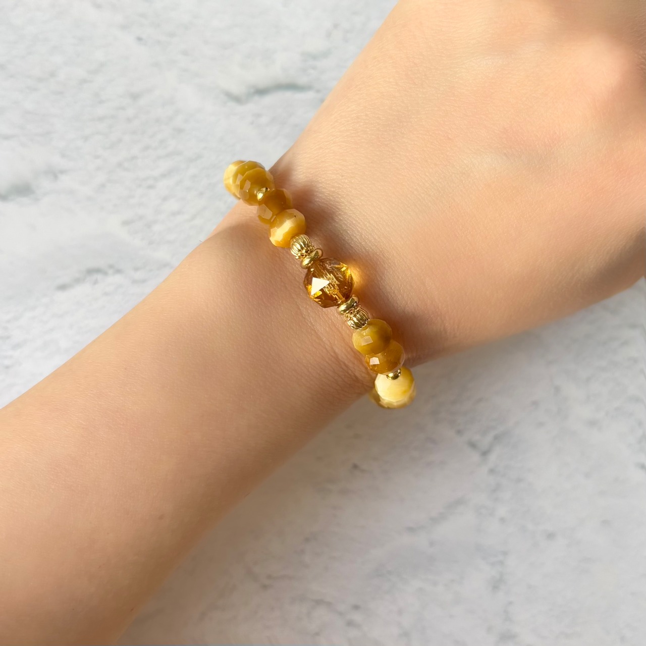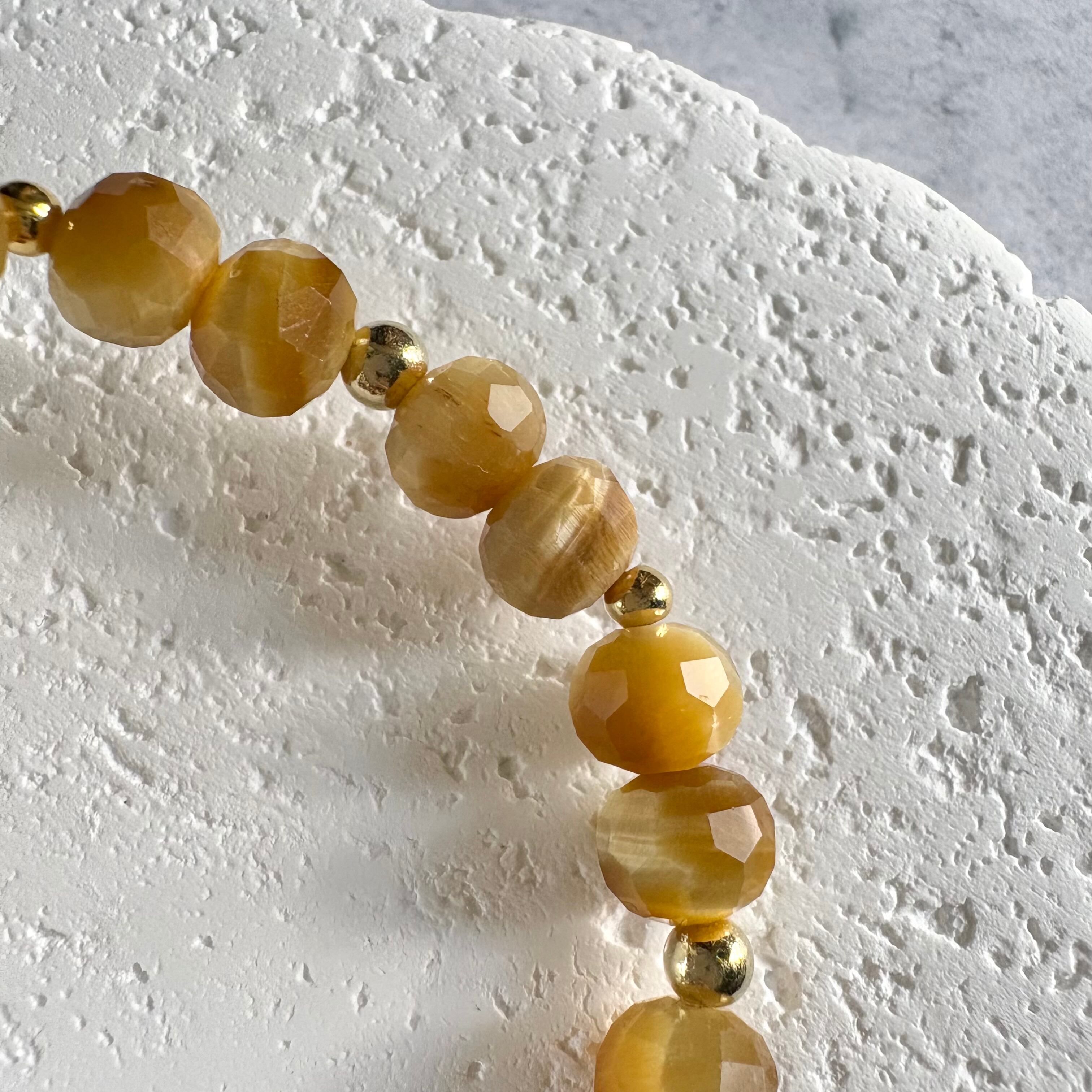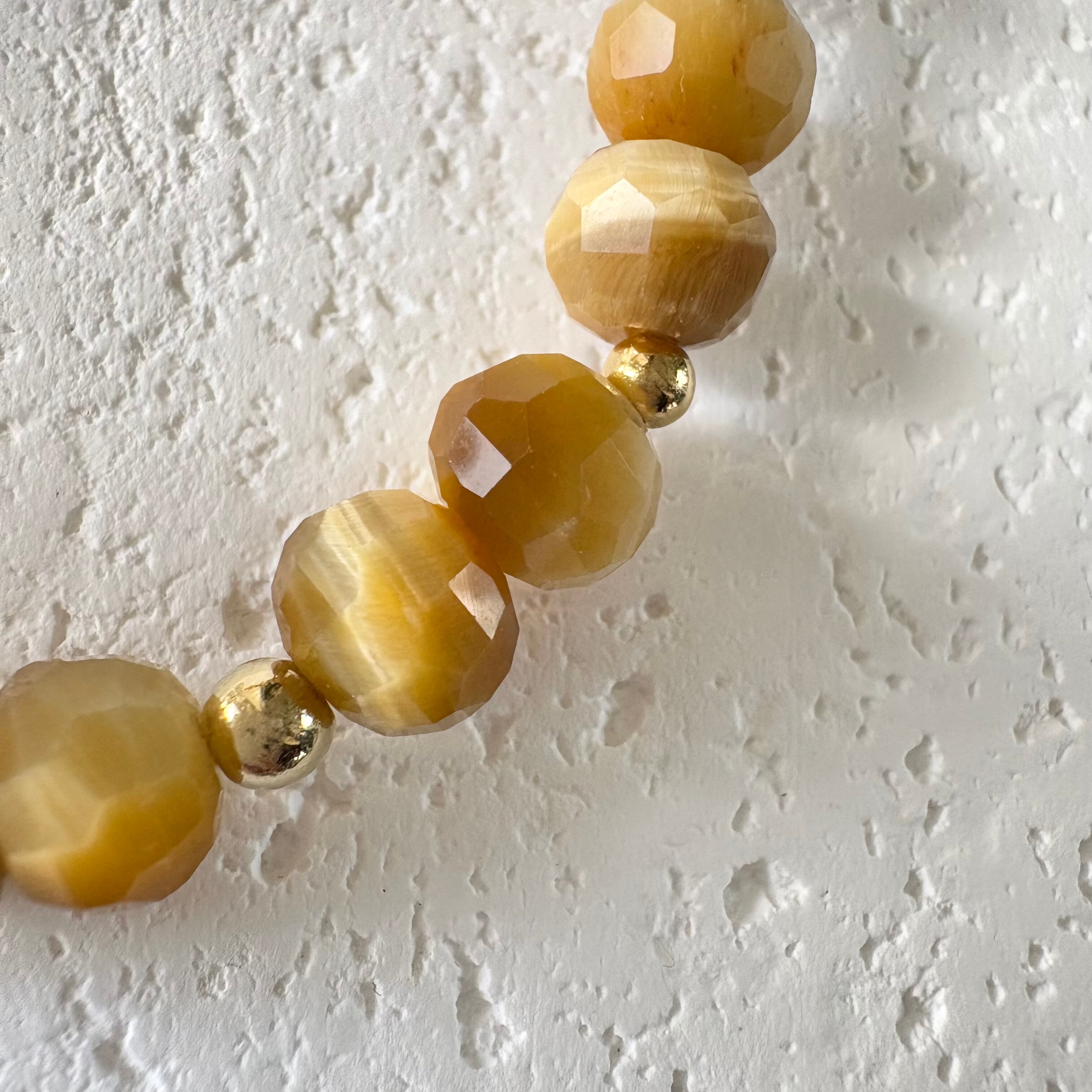 煌めきの美しいボタンカットのタイガーアイをベースに、トップにはブランデーカラーのシトリンをセレクト。品のある黄金色が手元にやさしく馴染む、エレガントな金運ブレスレットです。