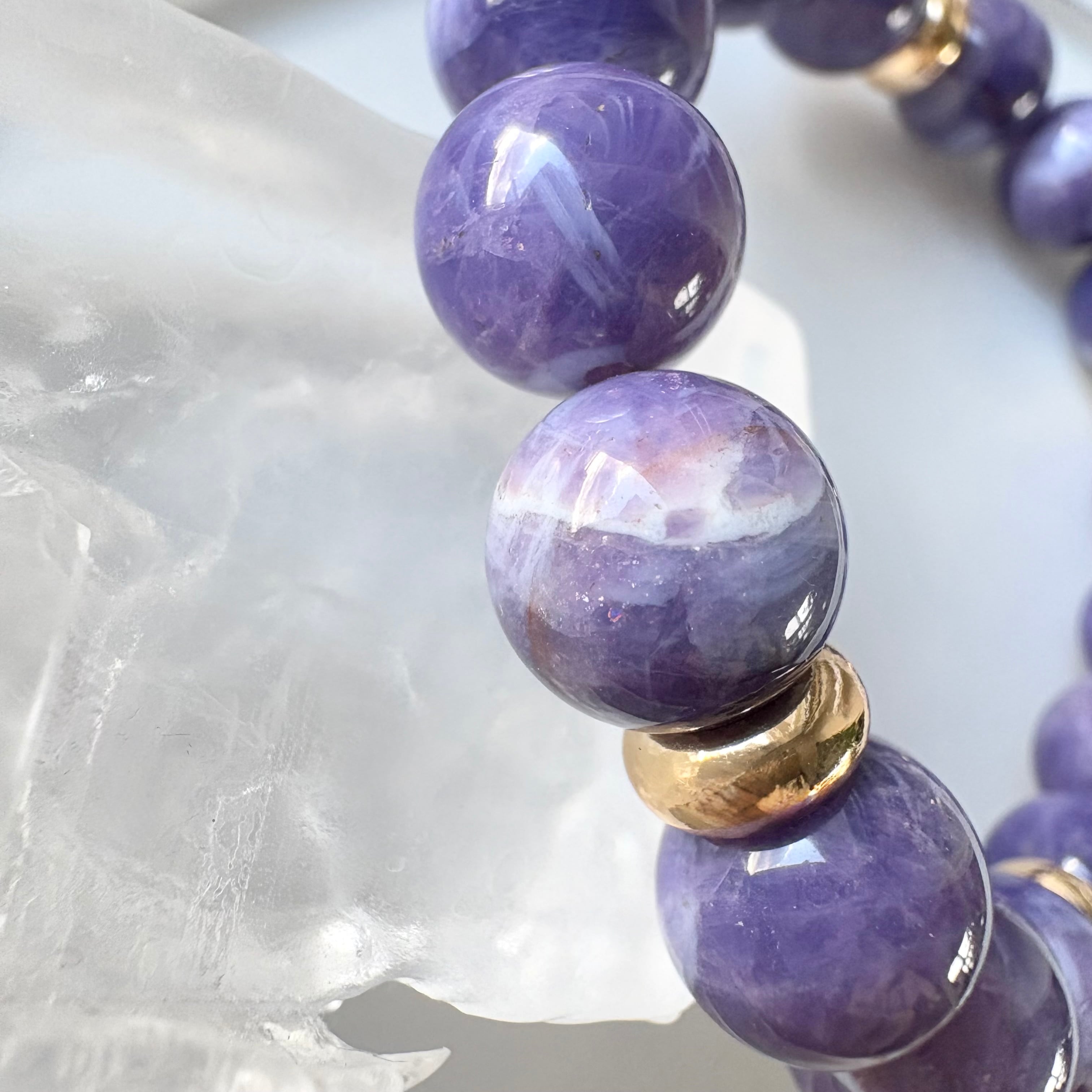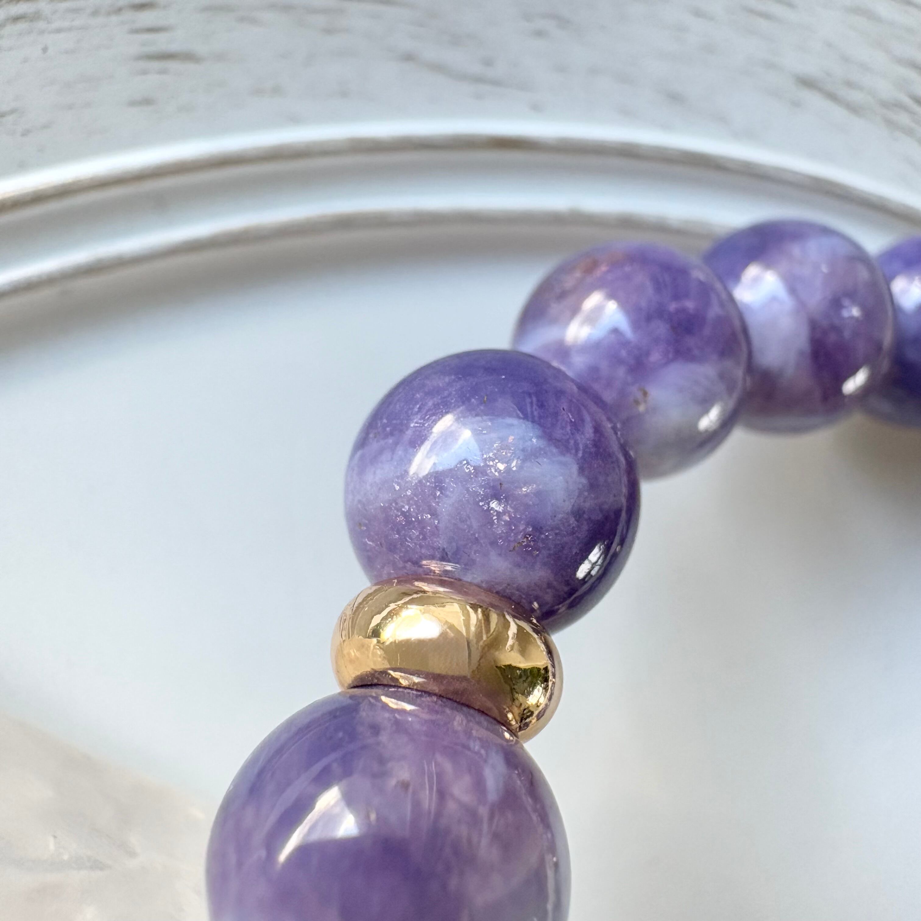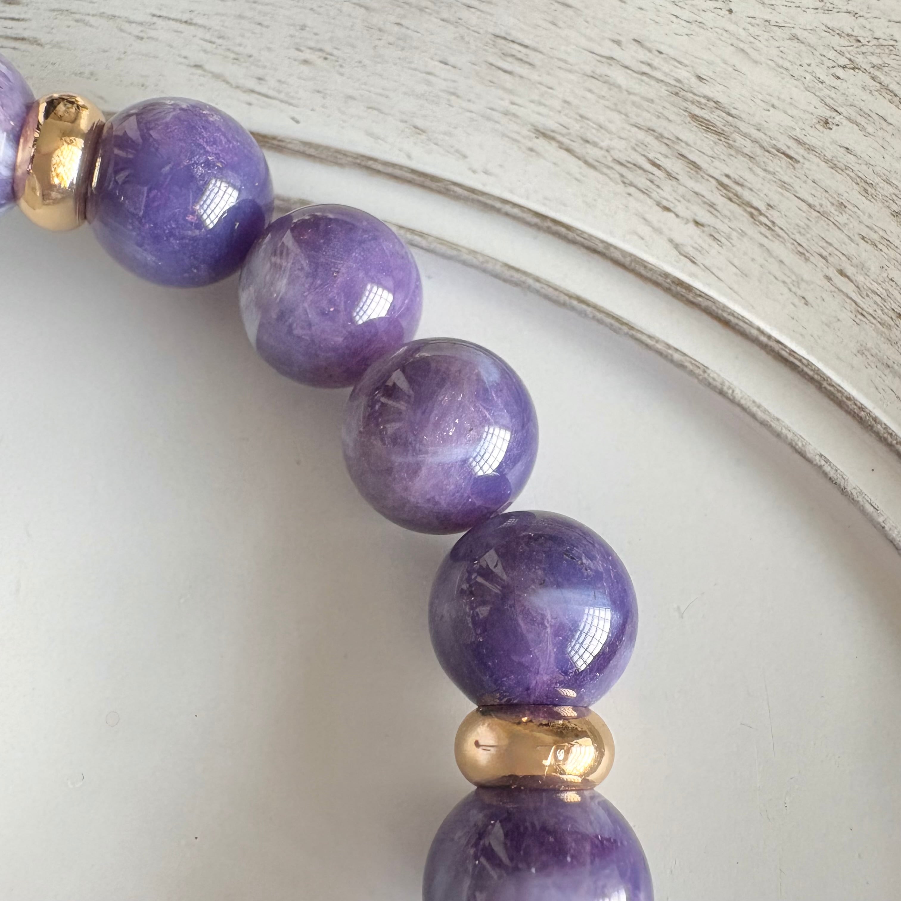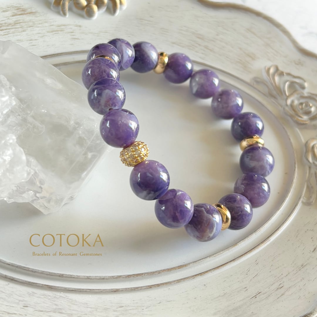 やわらかなミルキーパープルにきらりと瞬く小さな煌めき。希少なトゥインクルアメジストだけを贅沢に使用した、シンプルで上品なブレスレットです。