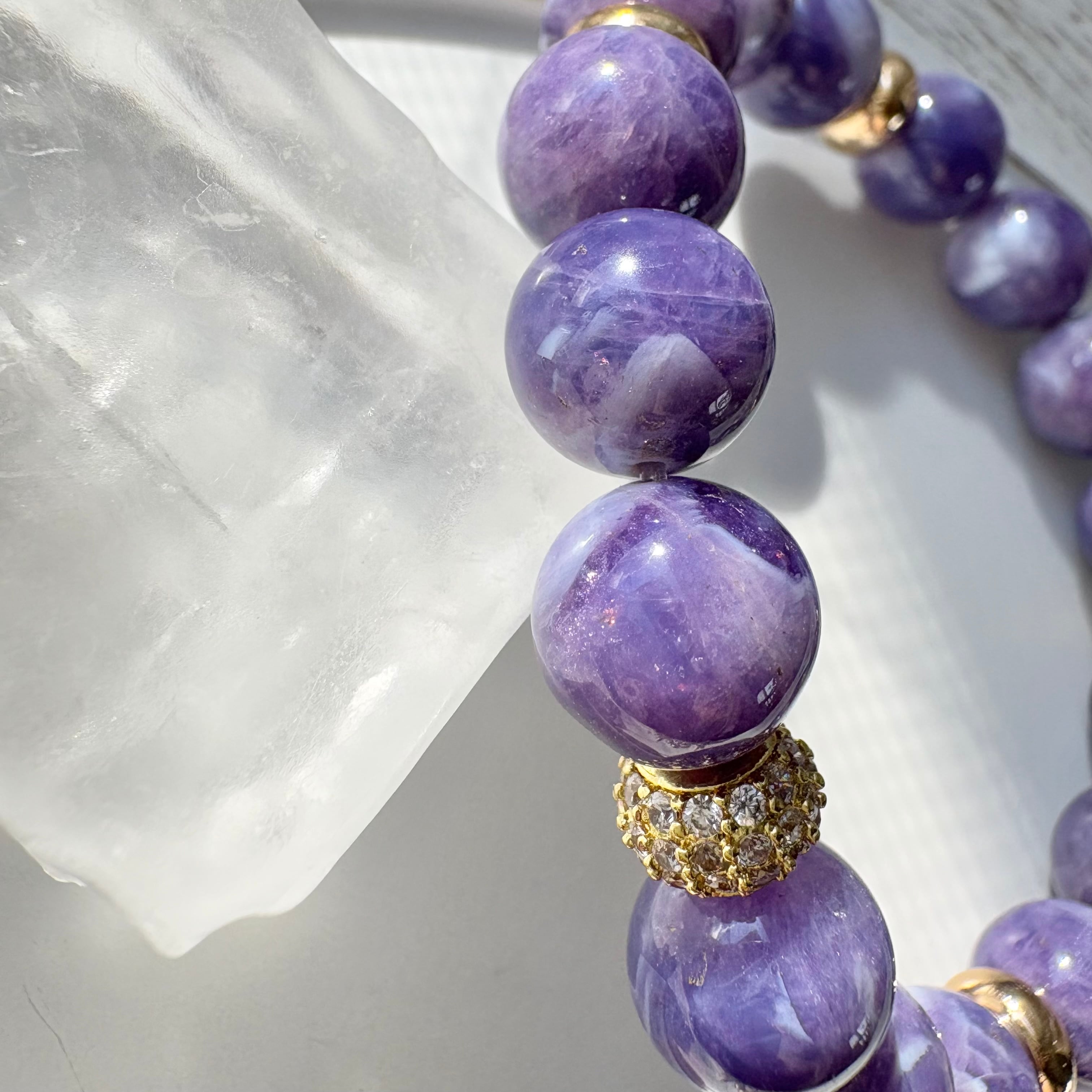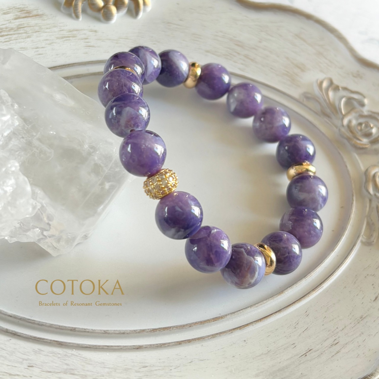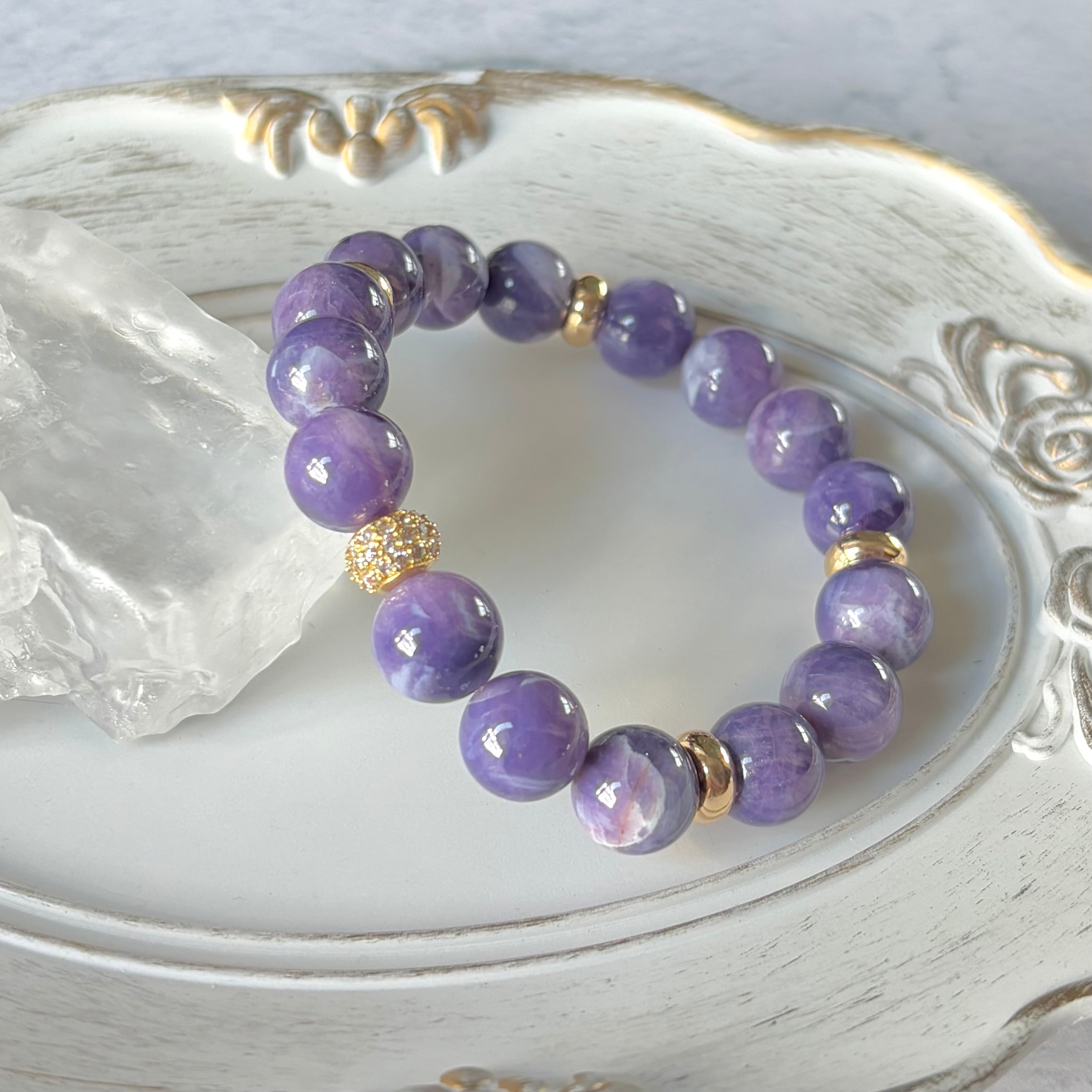 やわらかなミルキーパープルにきらりと瞬く小さな煌めき。希少なトゥインクルアメジストだけを贅沢に使用した、シンプルで上品なブレスレットです。