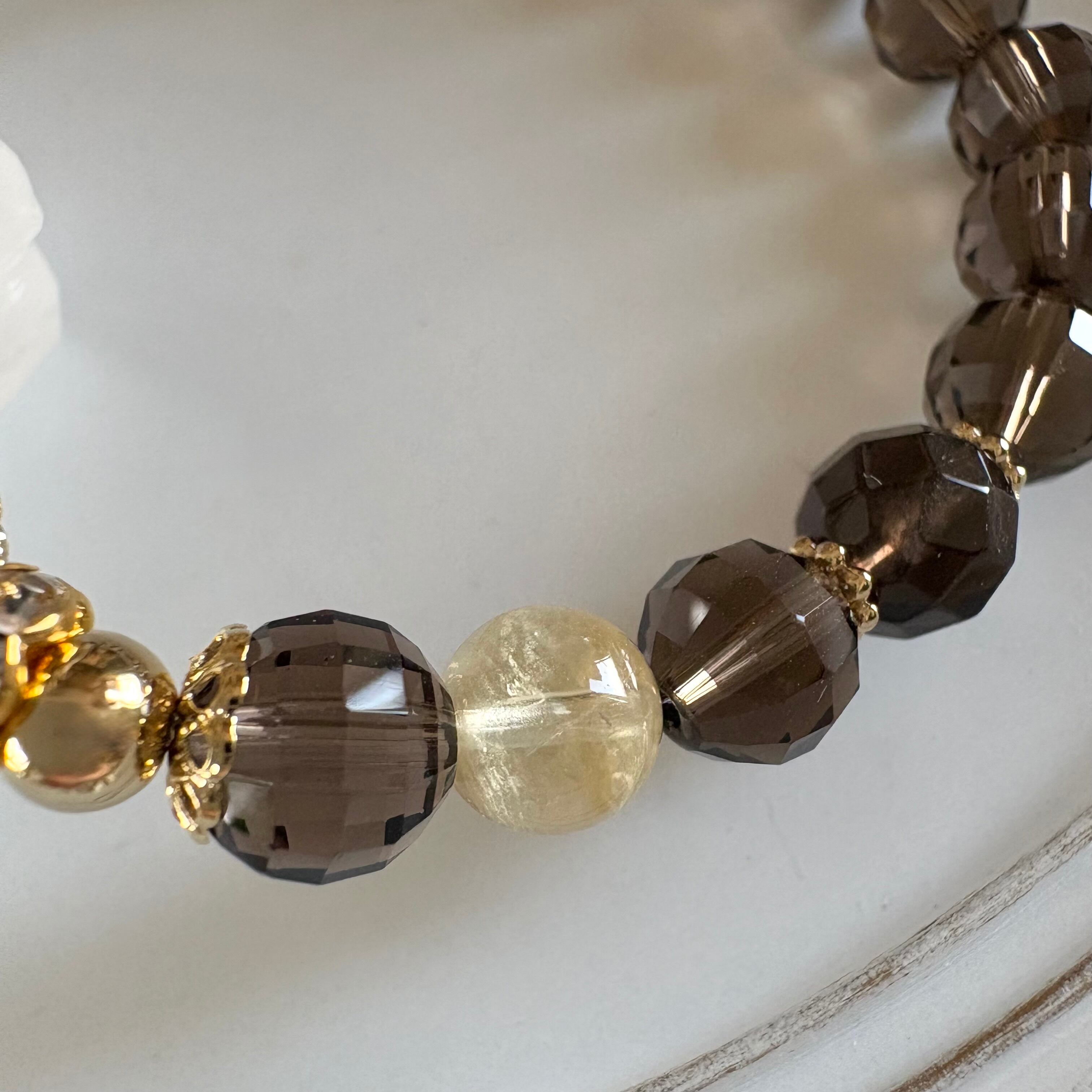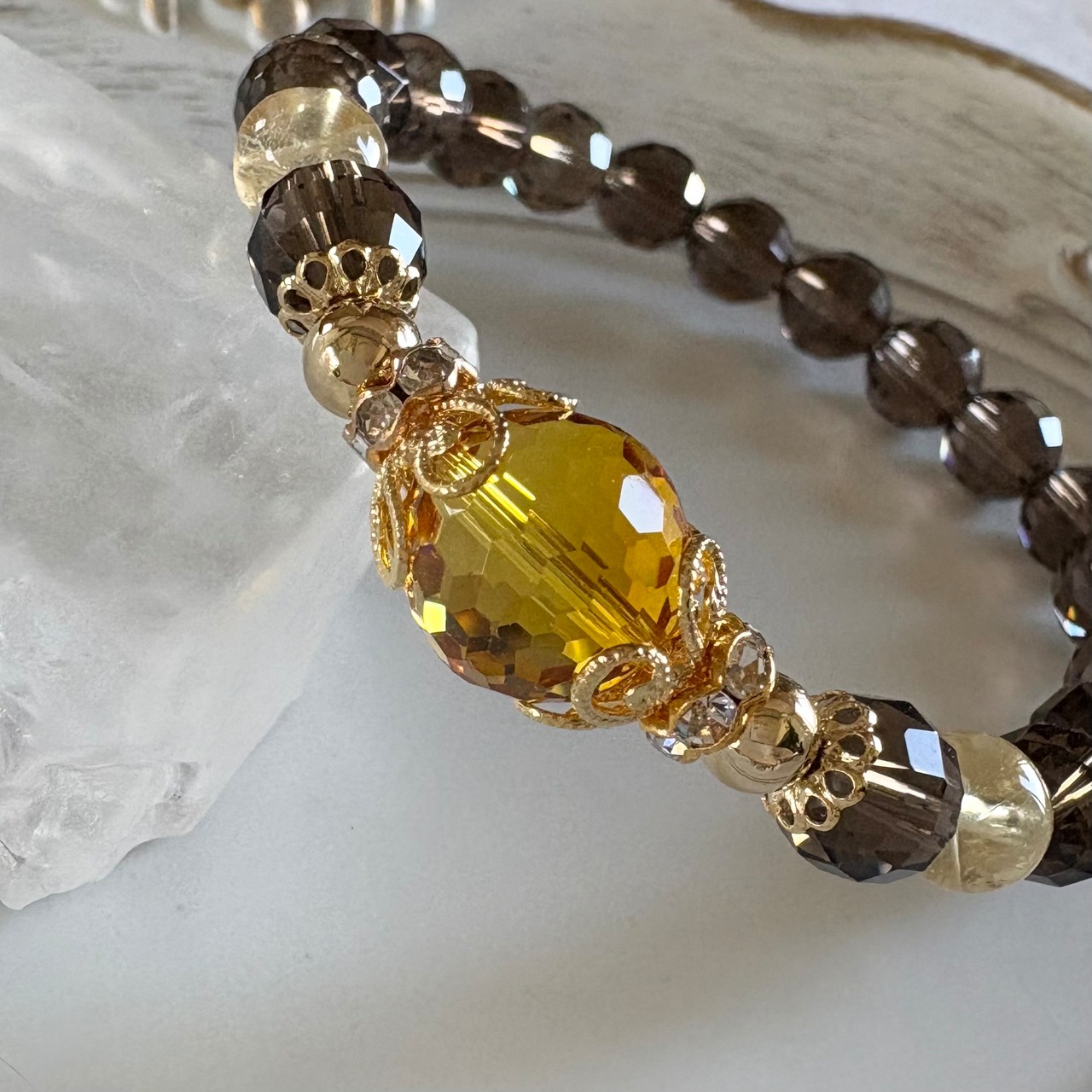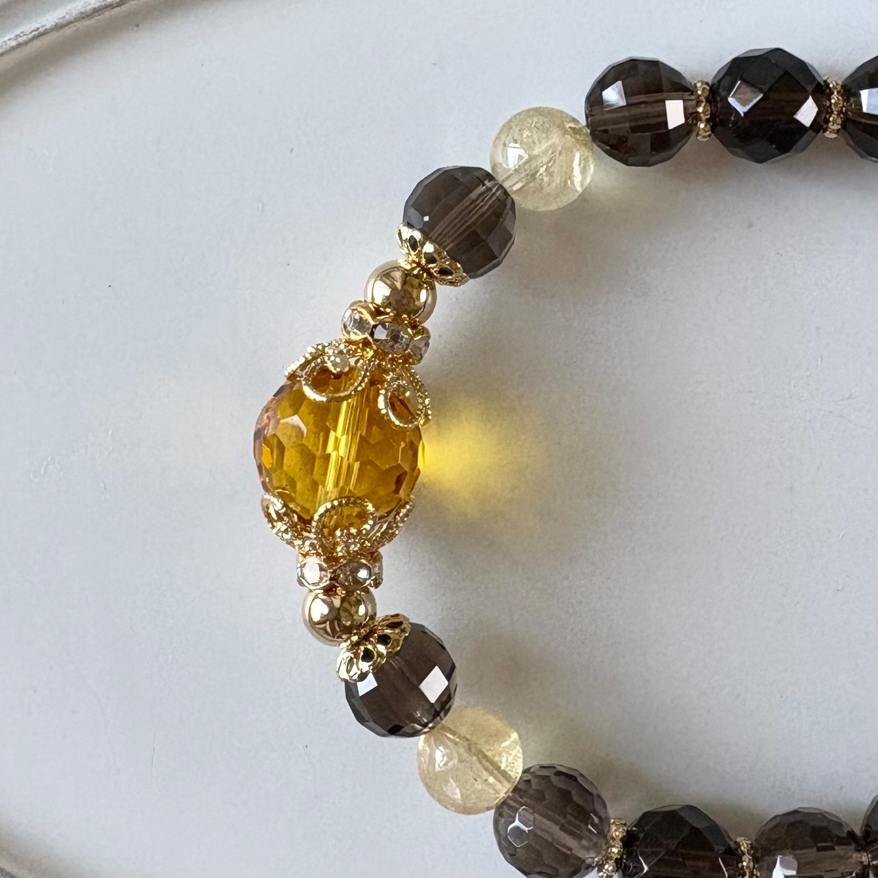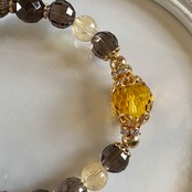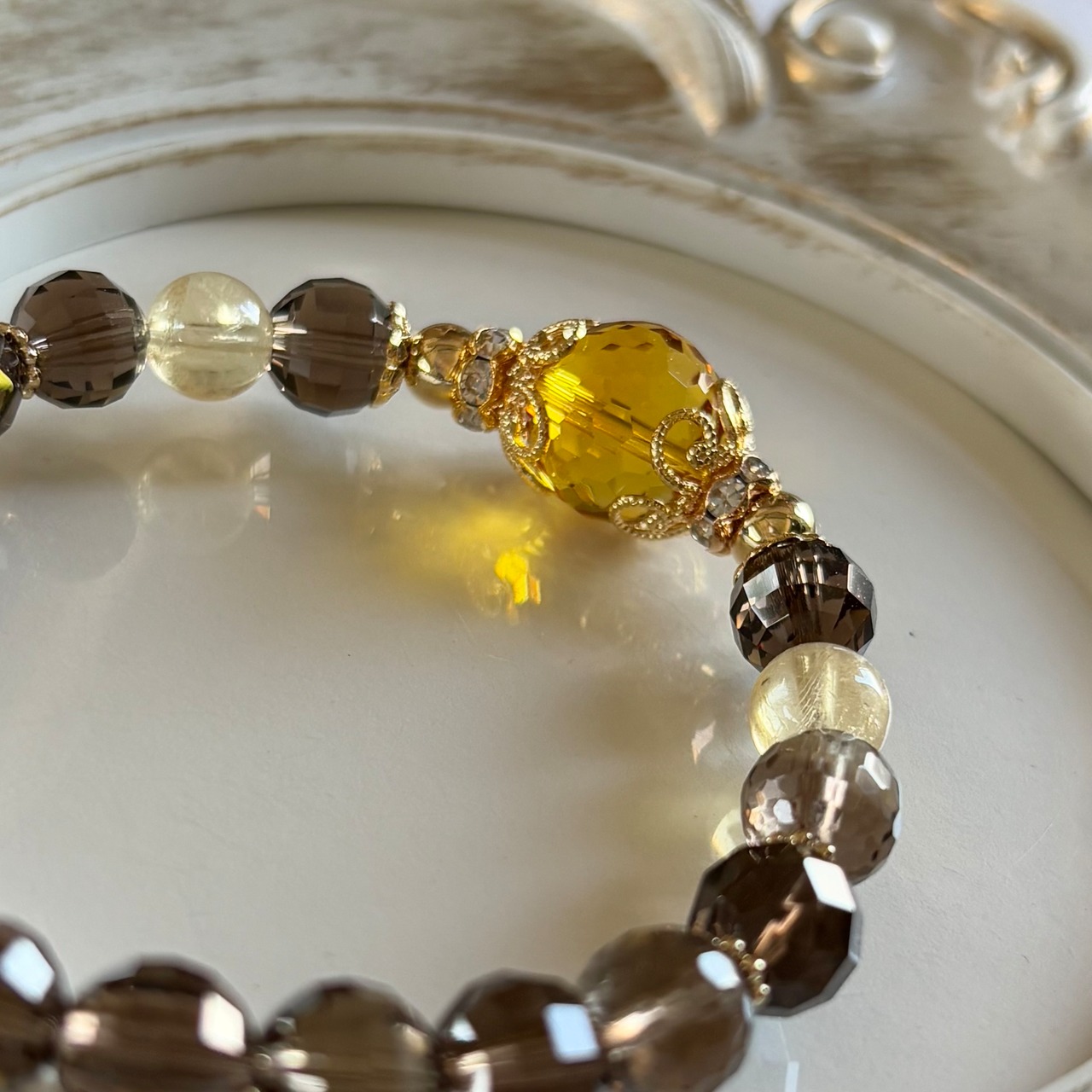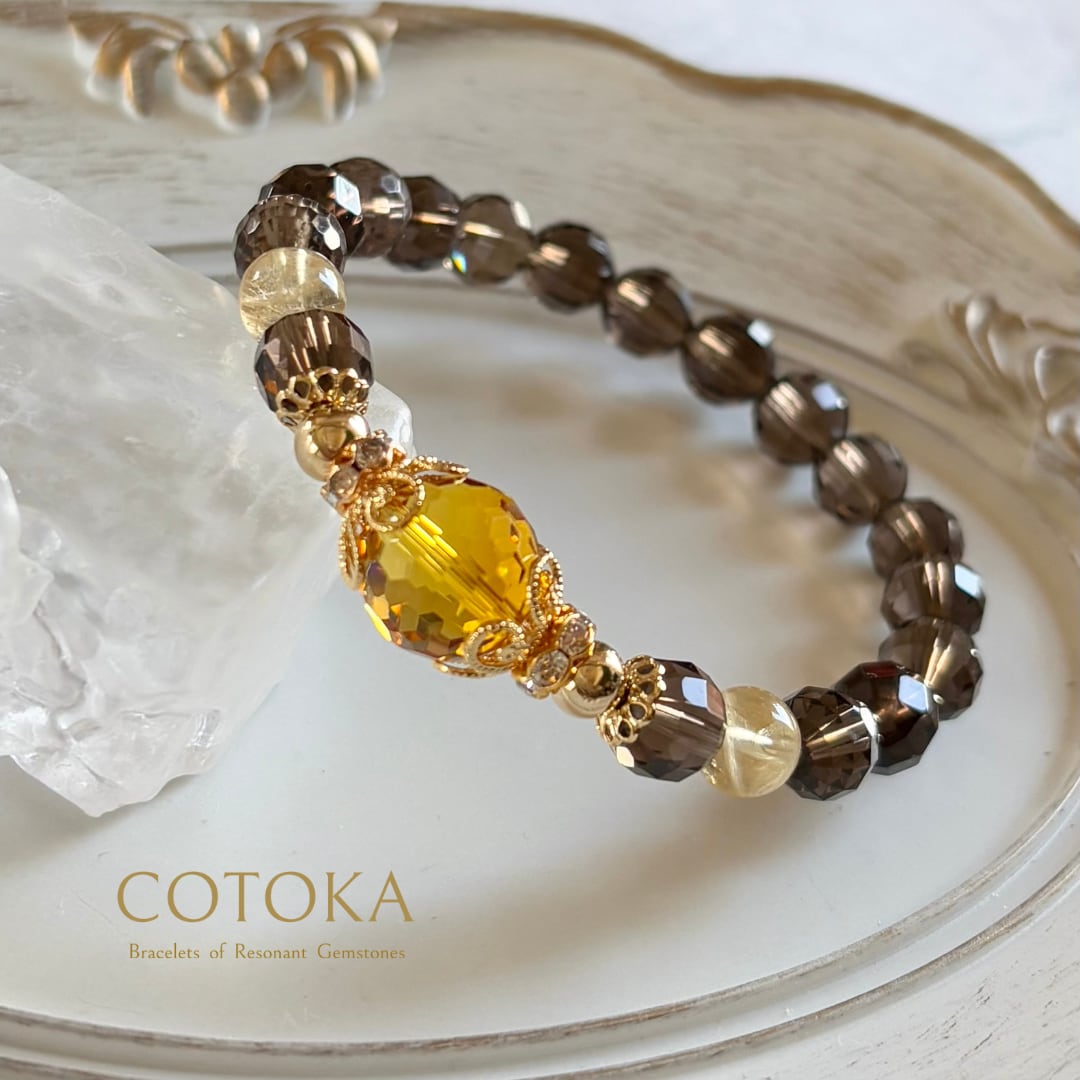イエローゴールドの輝きを放つ12mmカットシトリンをトップに据え、ベースには上品な透明感をもつライトカラーのスモーキークォーツを組み合わせた、落ち着きと華やかさを併せ持つブレスレットです。