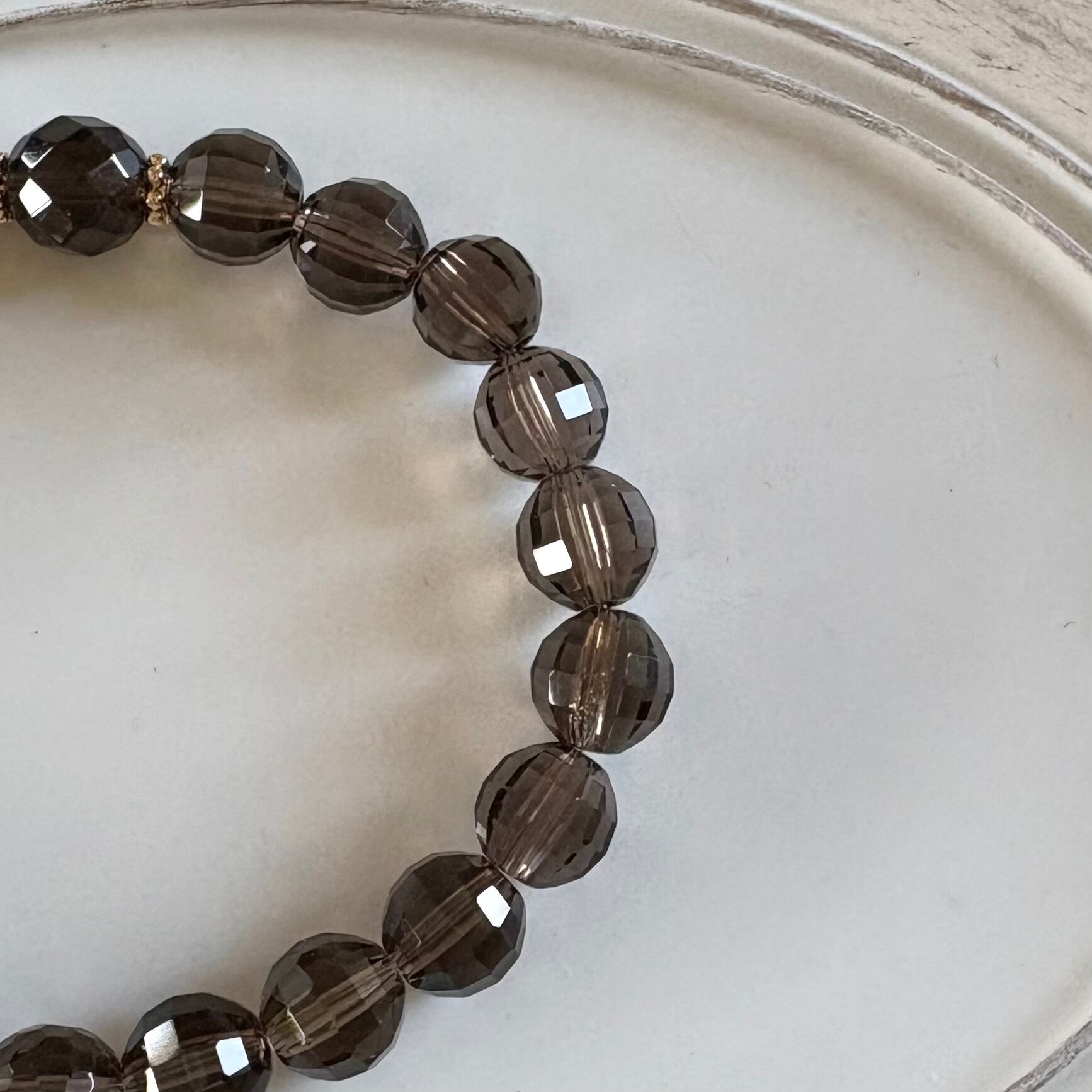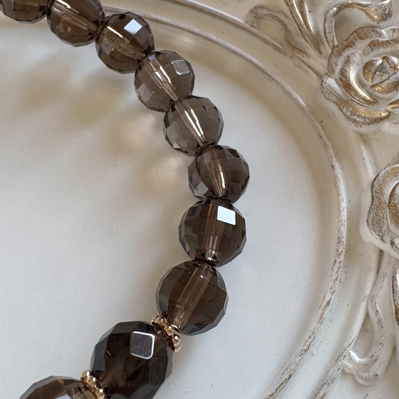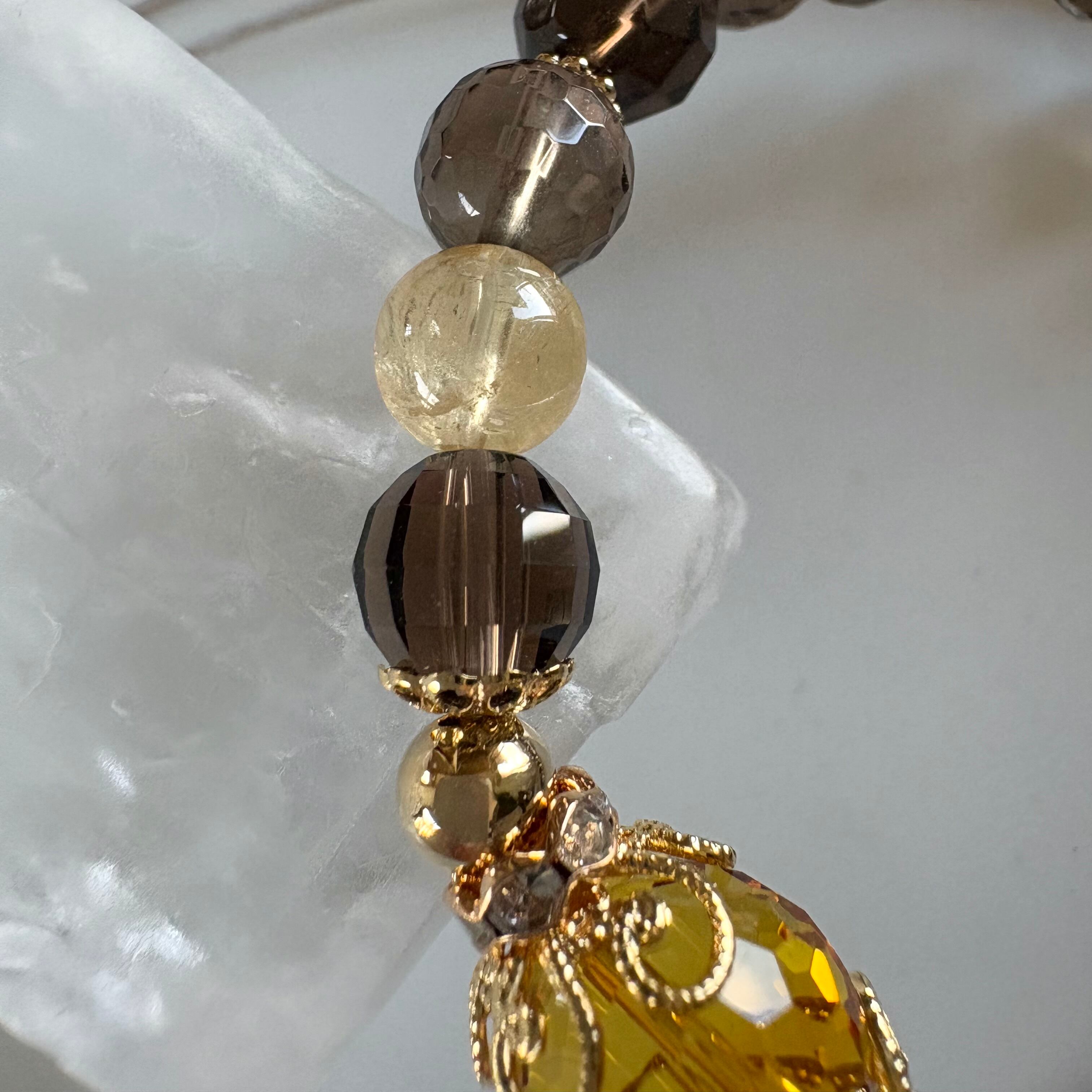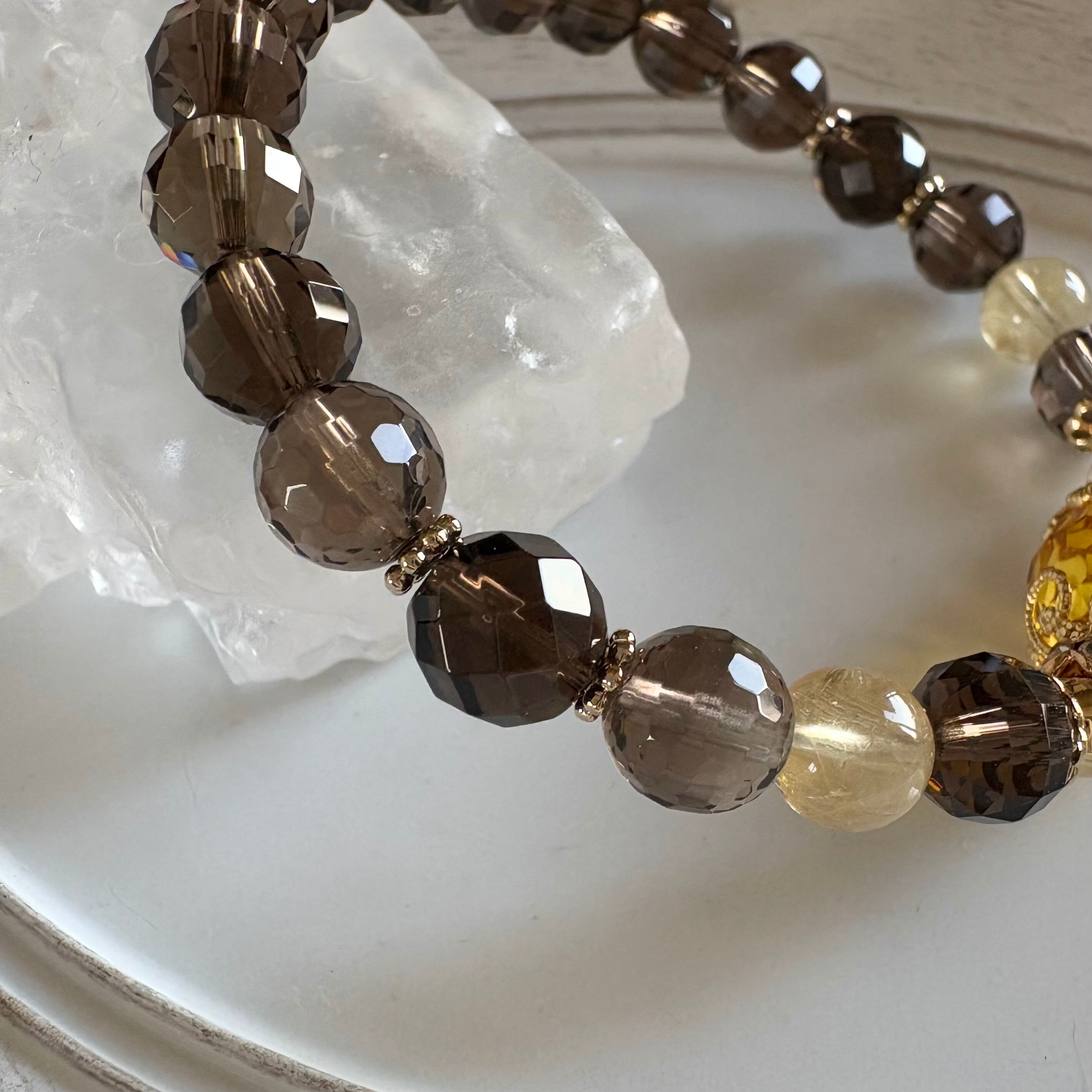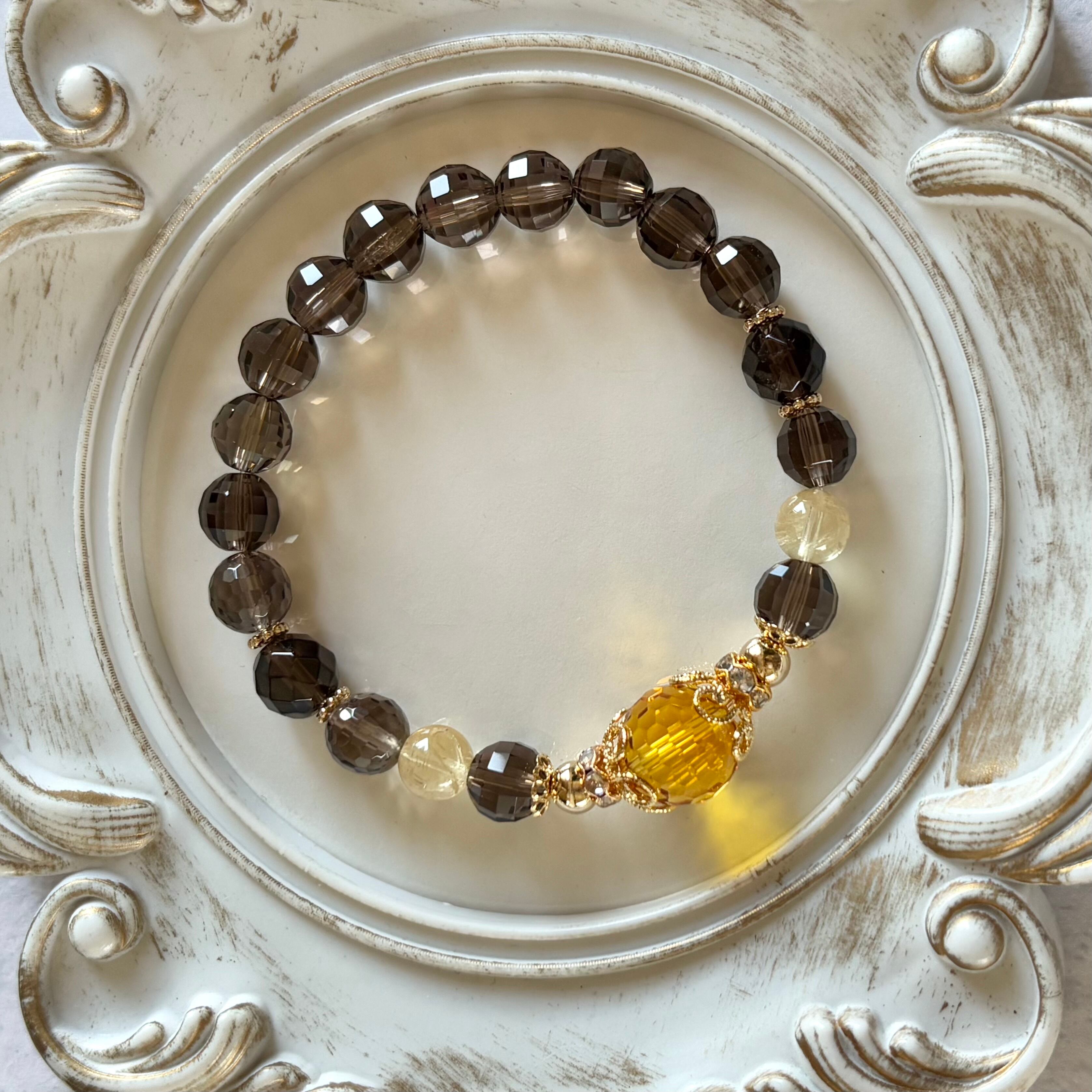 イエローゴールドの輝きを放つ12mmカットシトリンをトップに据え、ベースには上品な透明感をもつライトカラーのスモーキークォーツを組み合わせた、落ち着きと華やかさを併せ持つブレスレットです。