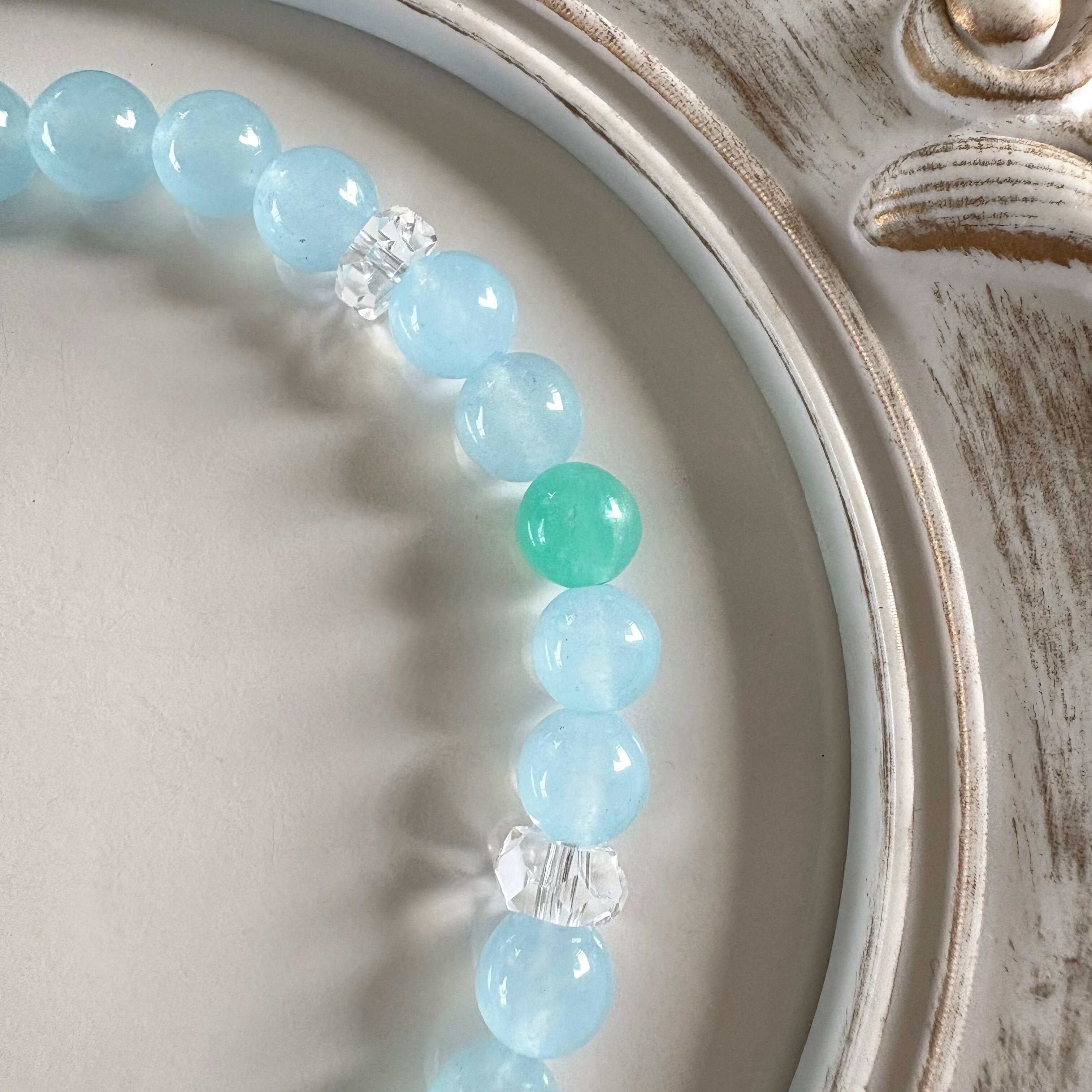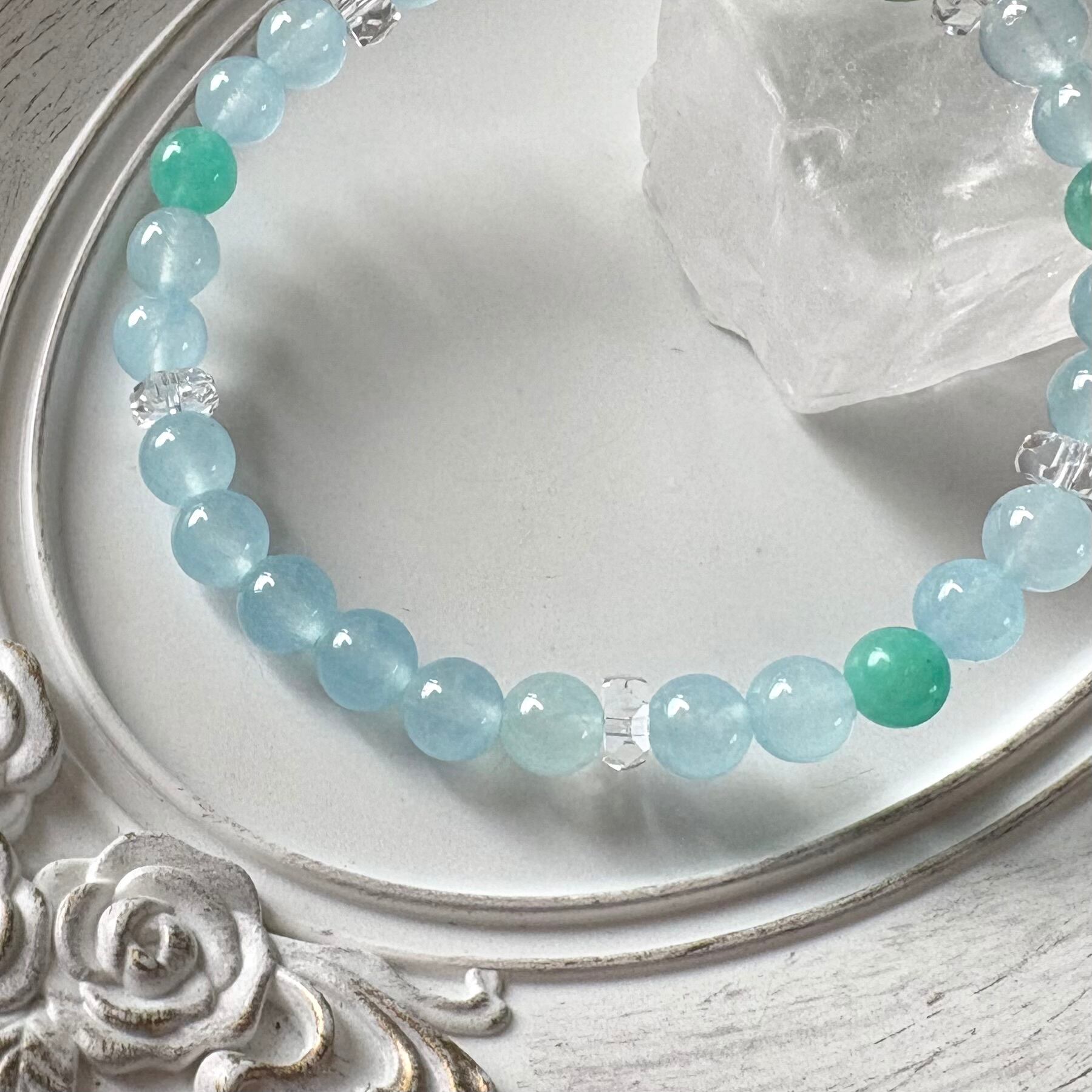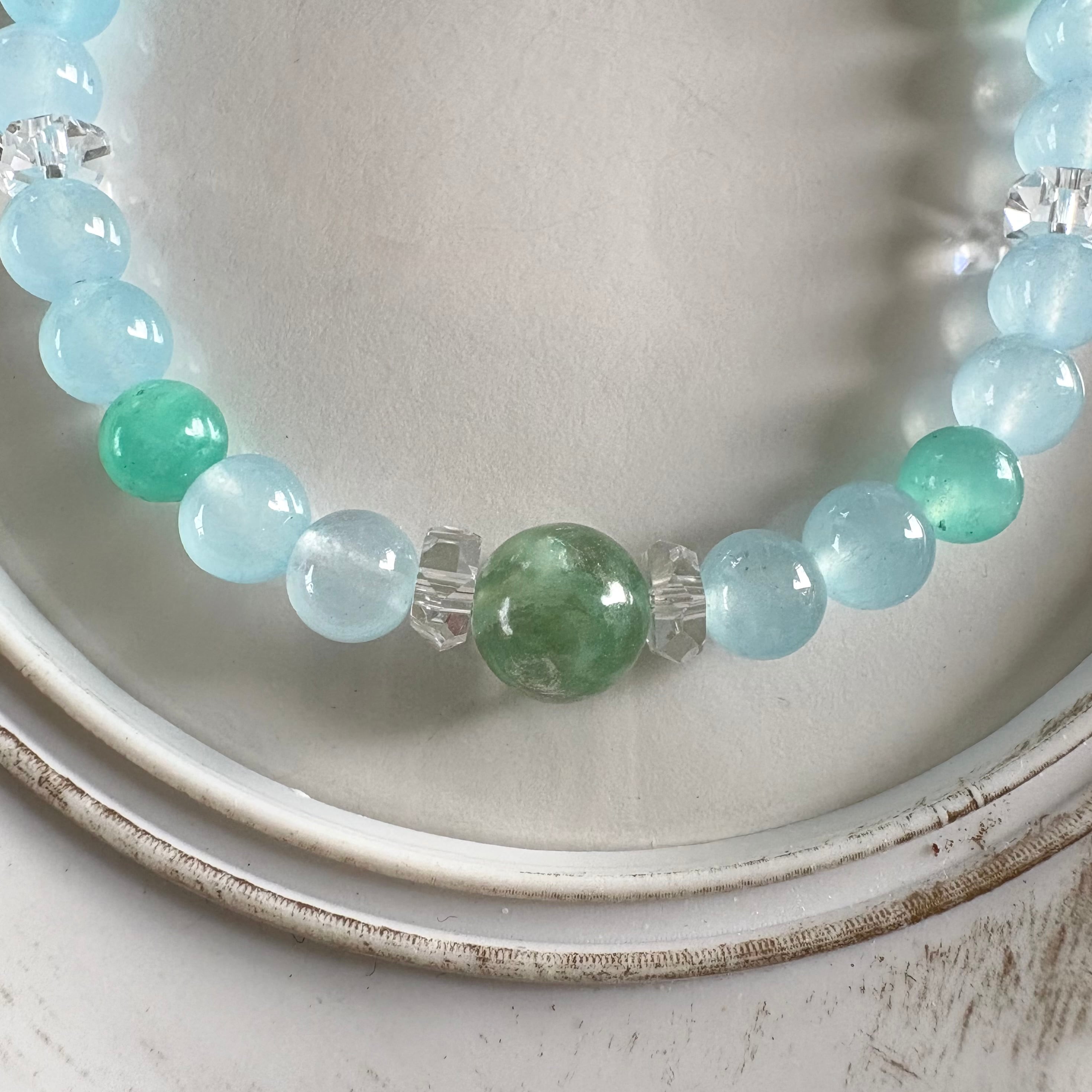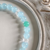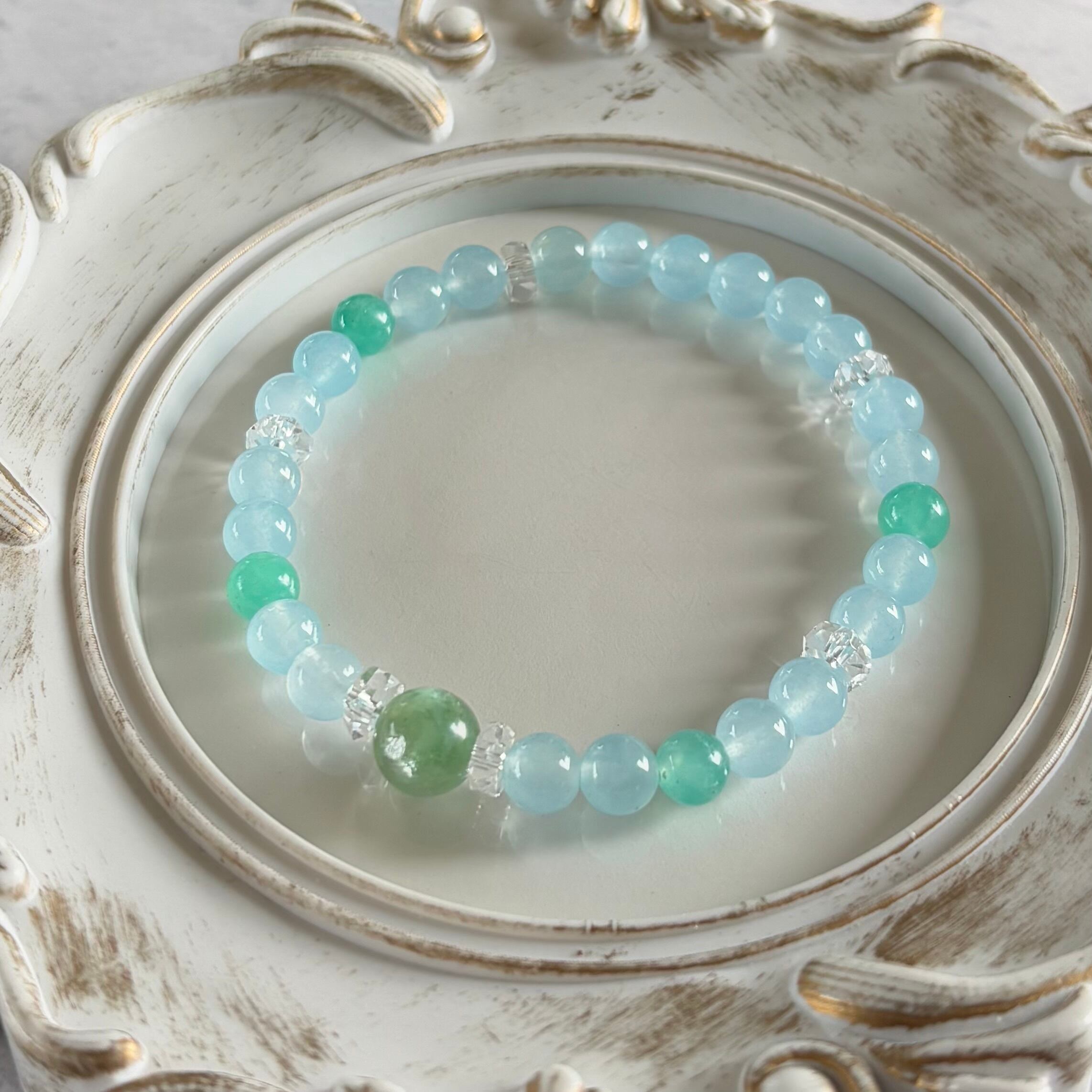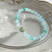 爽やかなシーブルーとポイントにグリーンをプラスした、清涼感のあるデザインブレスレットです。安らぎ・癒し・ストレスからの解放・ヒーリングの効果がある石の組み合わせとなっています。