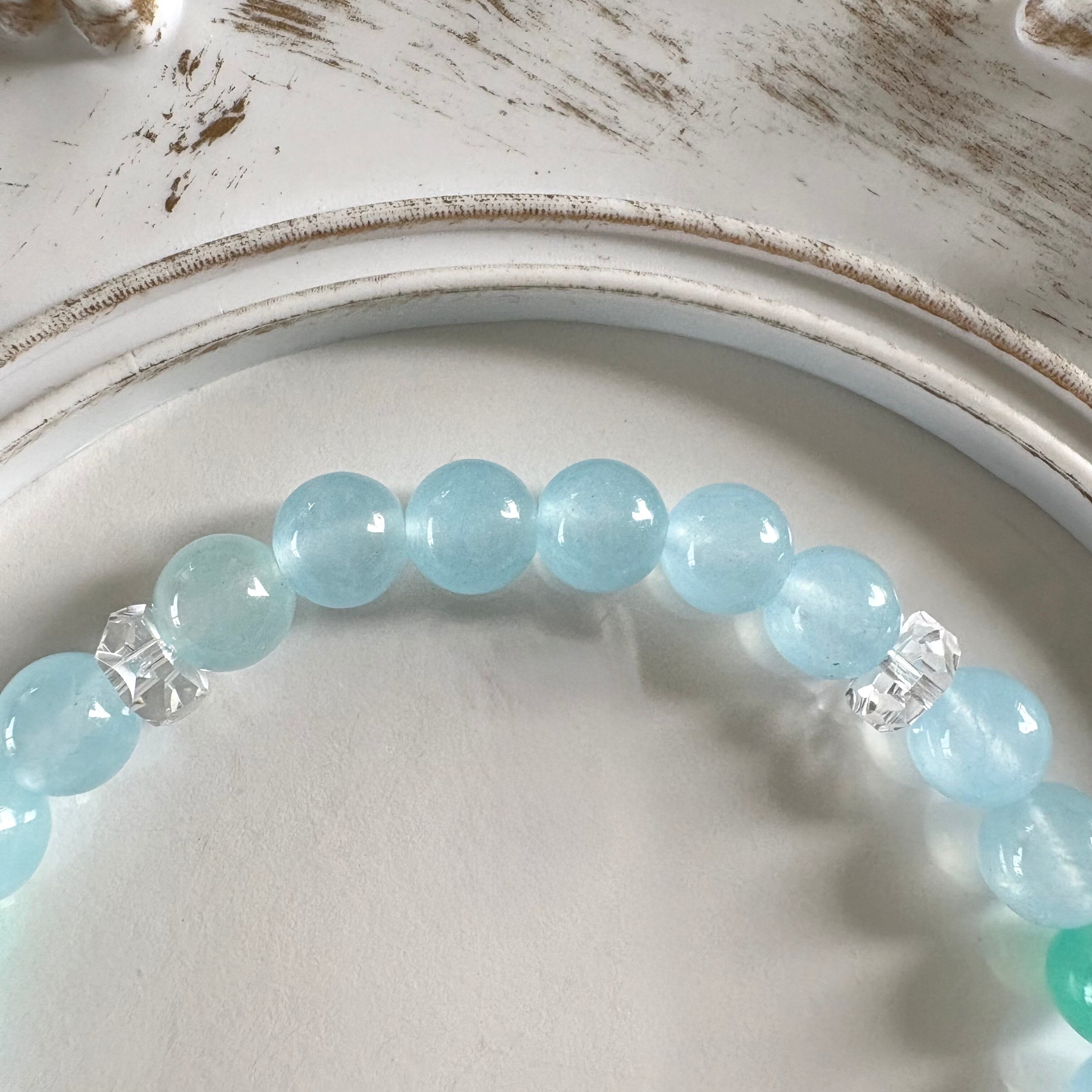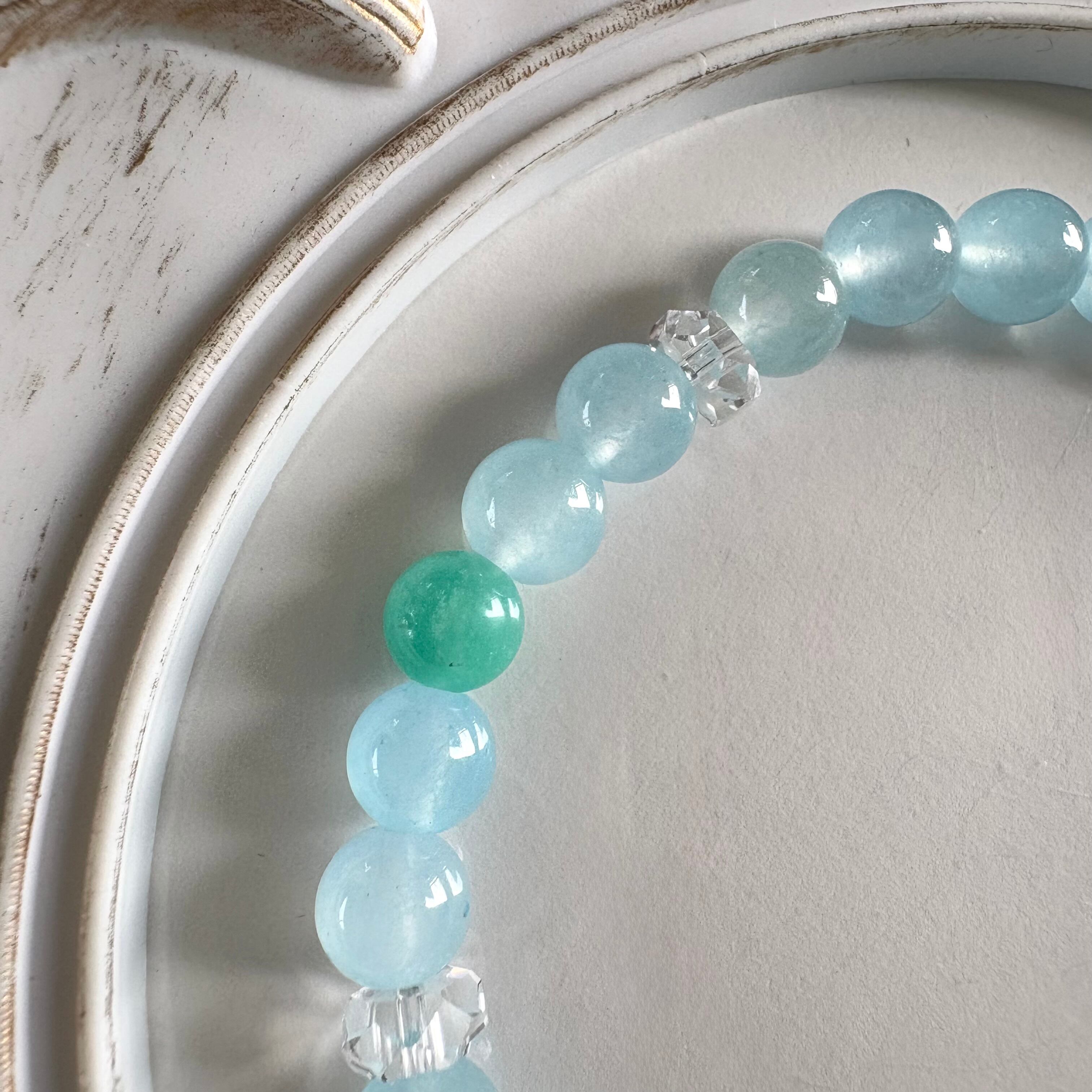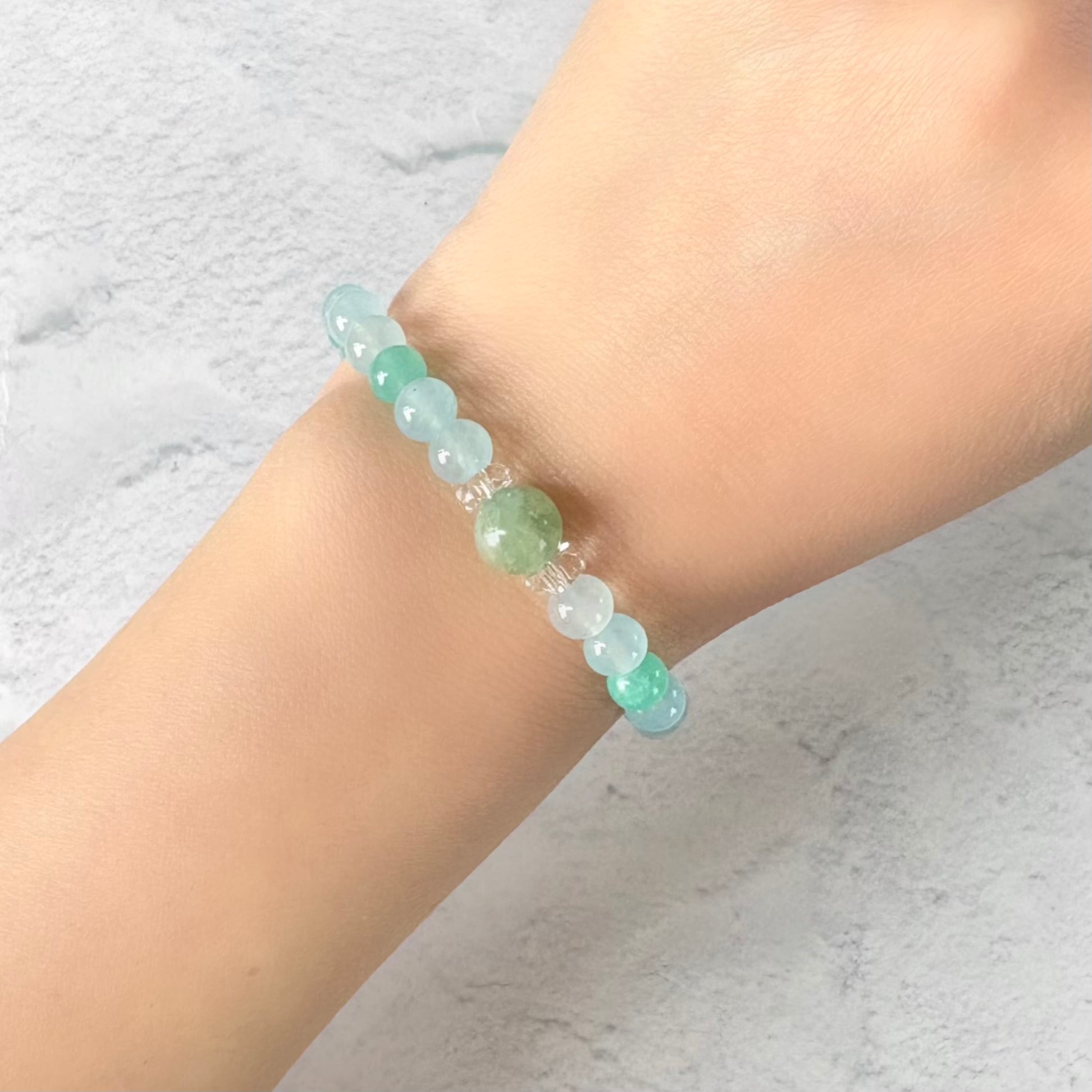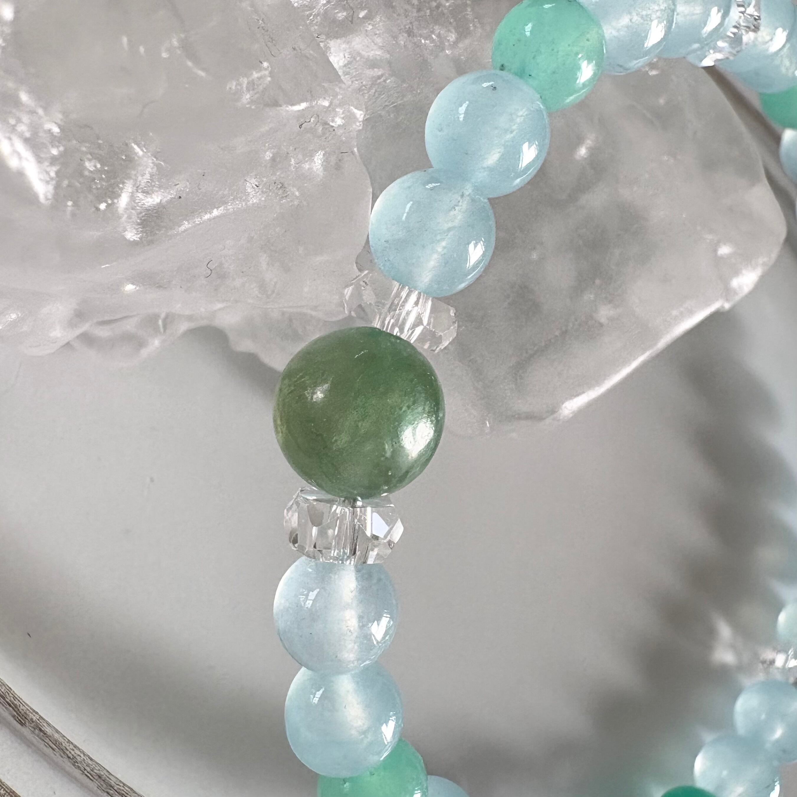 爽やかなシーブルーとポイントにグリーンをプラスした、清涼感のあるデザインブレスレットです。安らぎ・癒し・ストレスからの解放・ヒーリングの効果がある石の組み合わせとなっています。