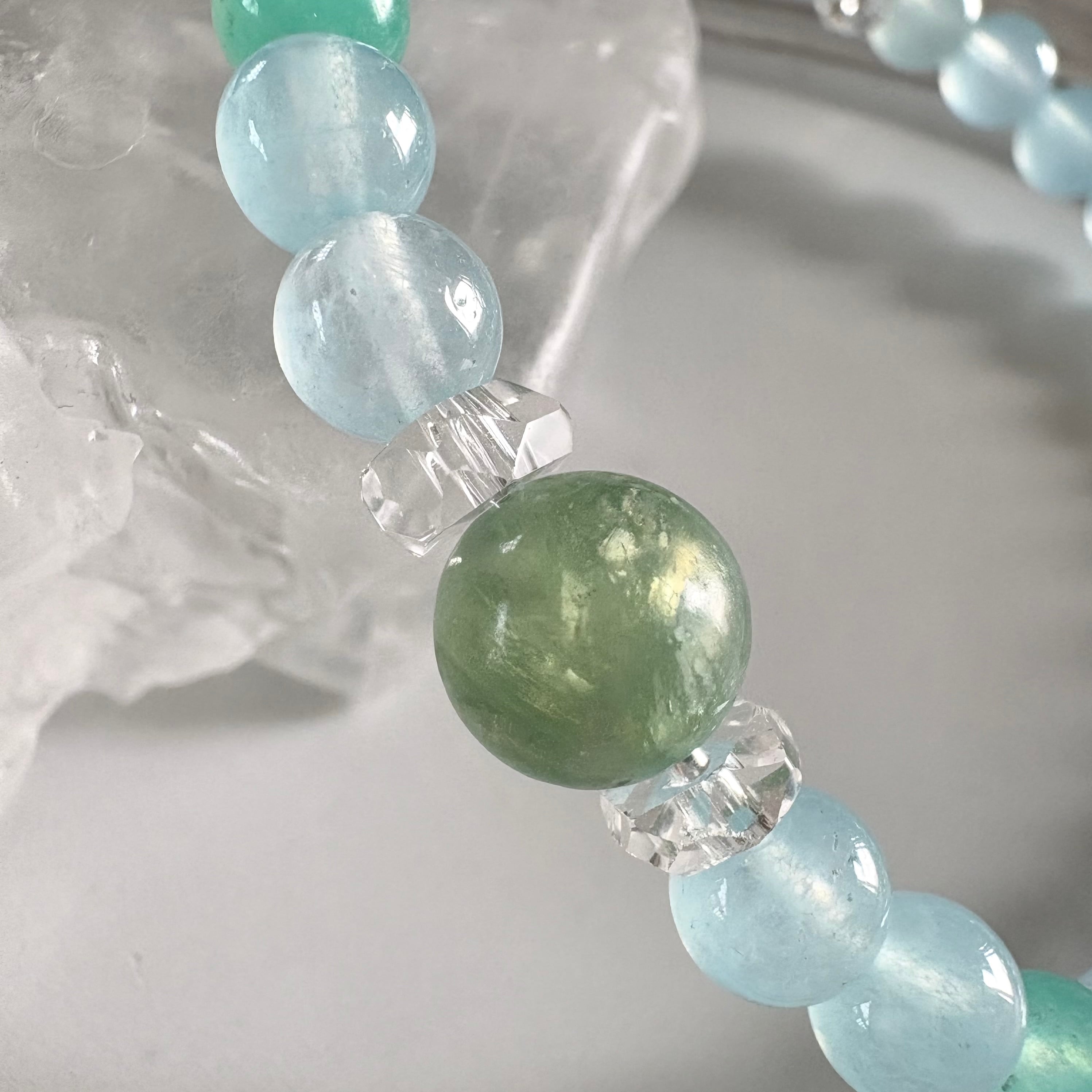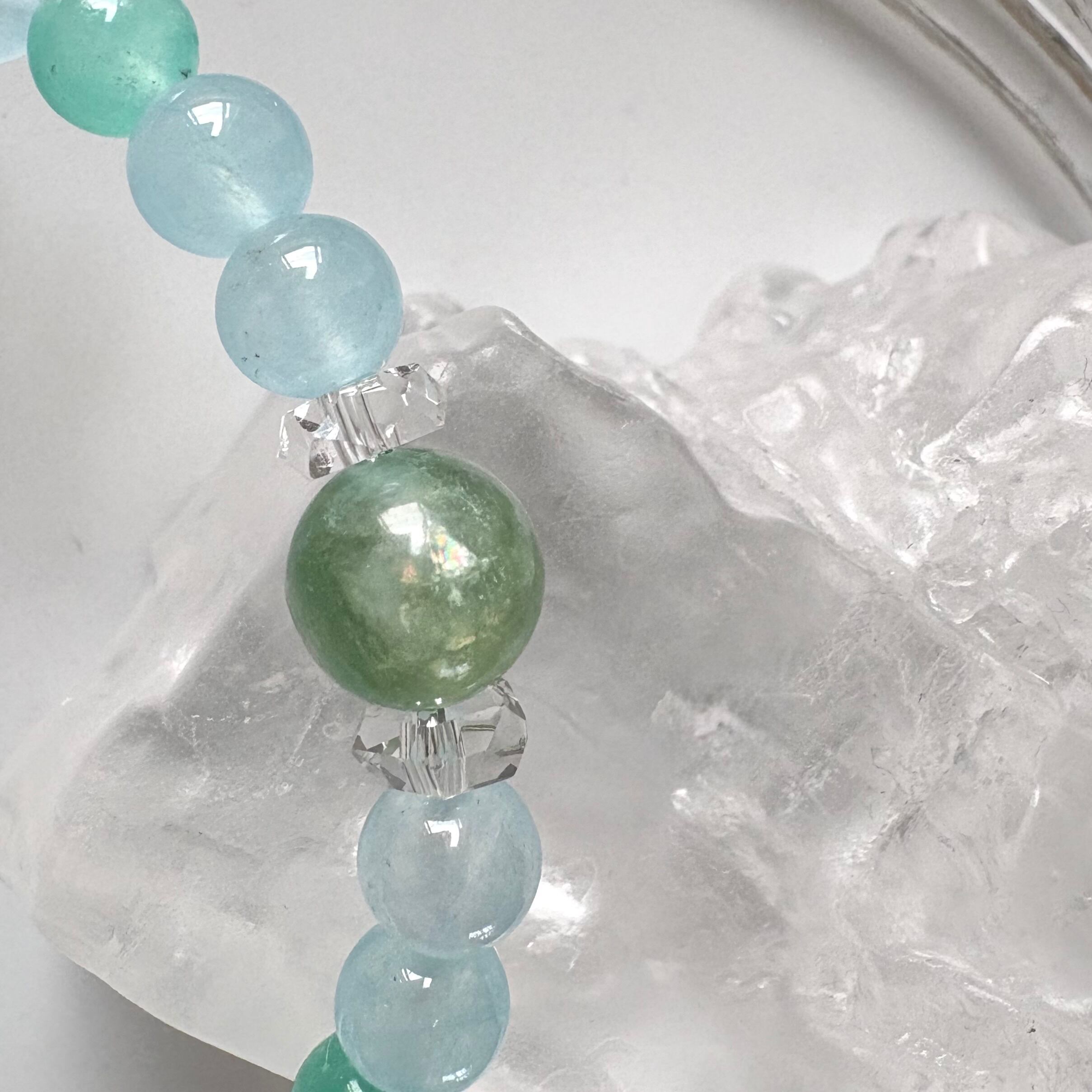 瑞々しいブルーグリーンの色合いが、見るだけで心地よい清涼感があり、癒されるブレスレット。メインのグリーンマイカは透明感あるグリーンにキラキラとした雲母の輝きが見られます。見る角度により異なる煌めきを楽しめる天然石ならではの美しさが特徴的です。