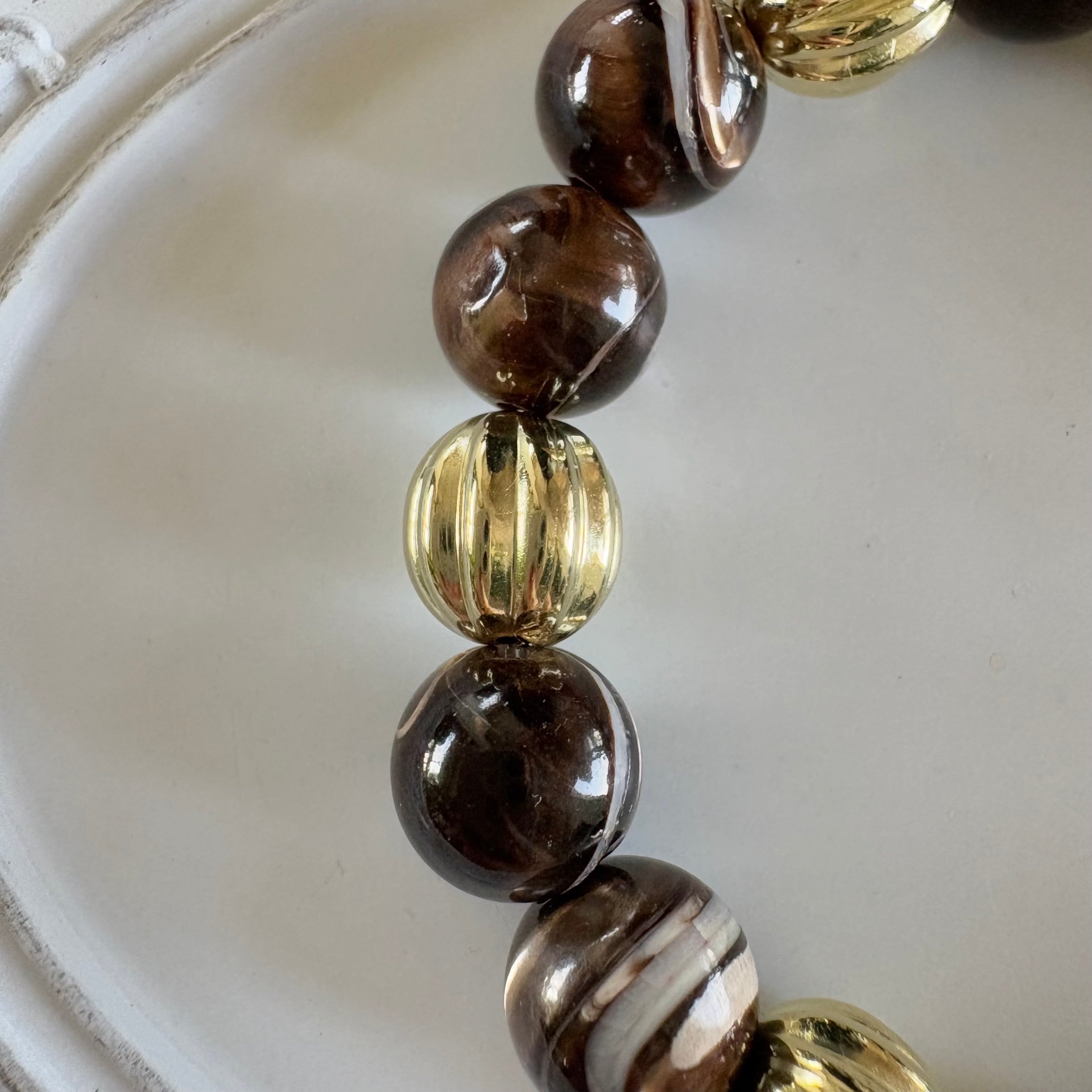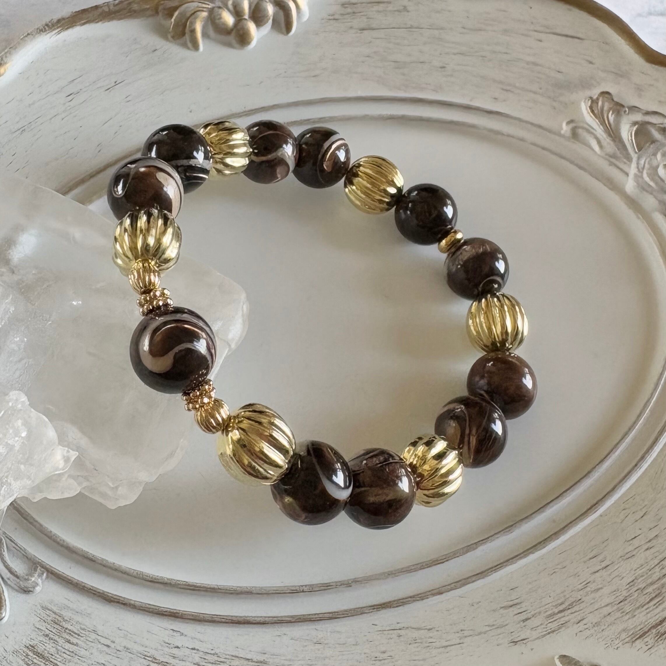 深みのあるブラウンと、しっとり艶めくゴールド。まるで高級コーヒーチョコレートをそのままアクセサリーにしたような、華やかでリッチな印象のブレスレットです。