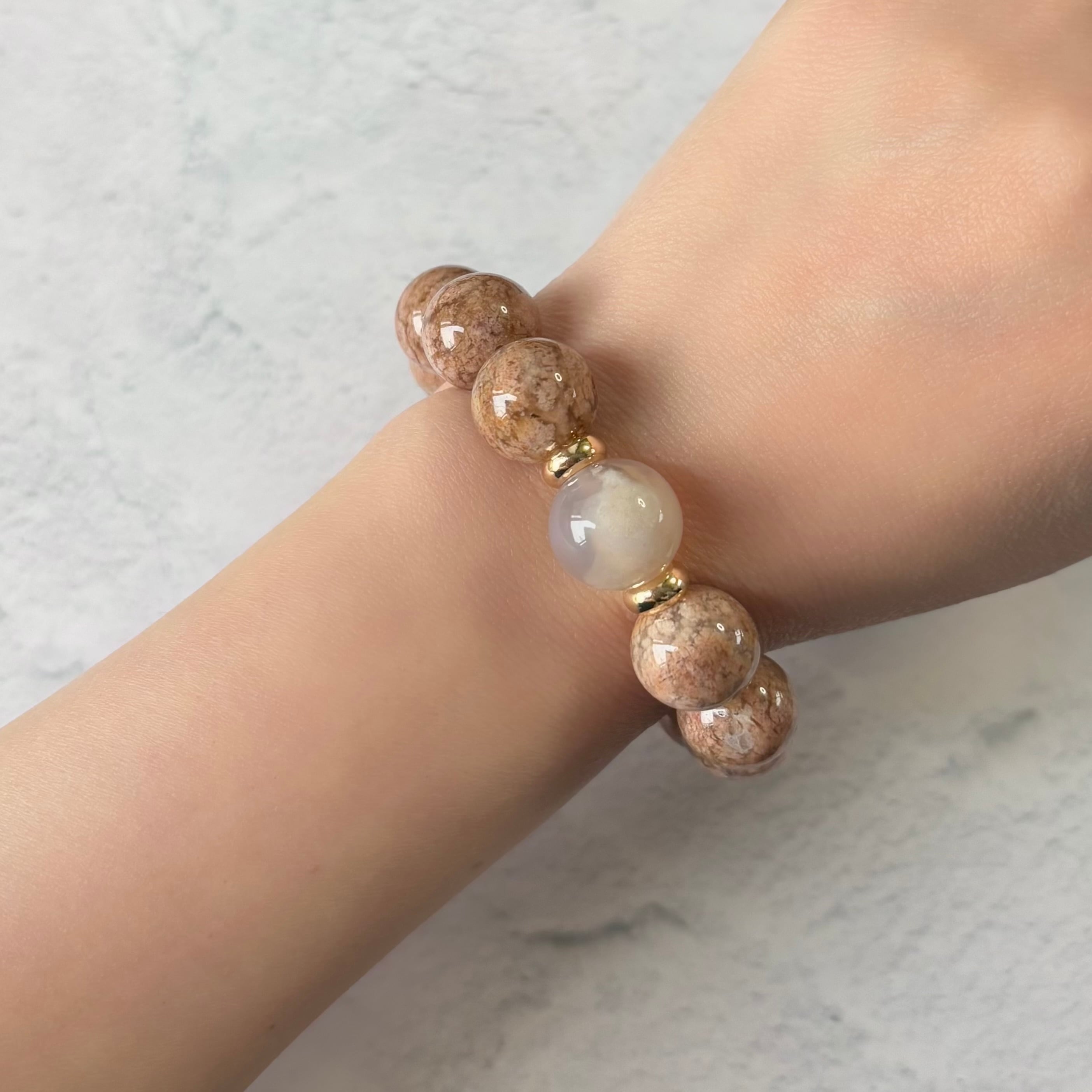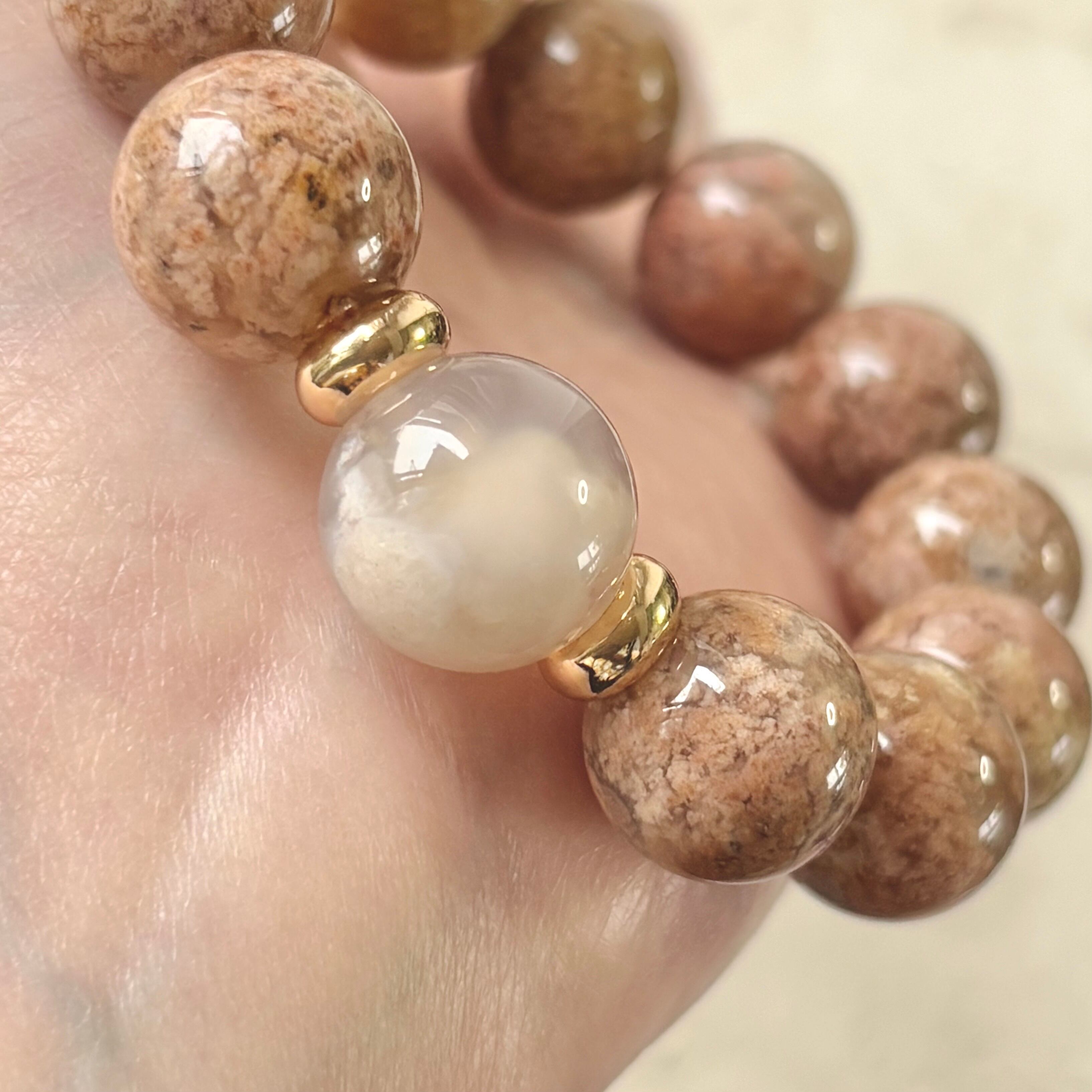14mmの大玉アラシャンアゲートインクォーツを贅沢に使用した一点もののブレスレットです。複雑に重なり合う模様は、大地や岩肌など自然の風景を思わせ、ひと粒ごとに異なる表情を楽しめます。