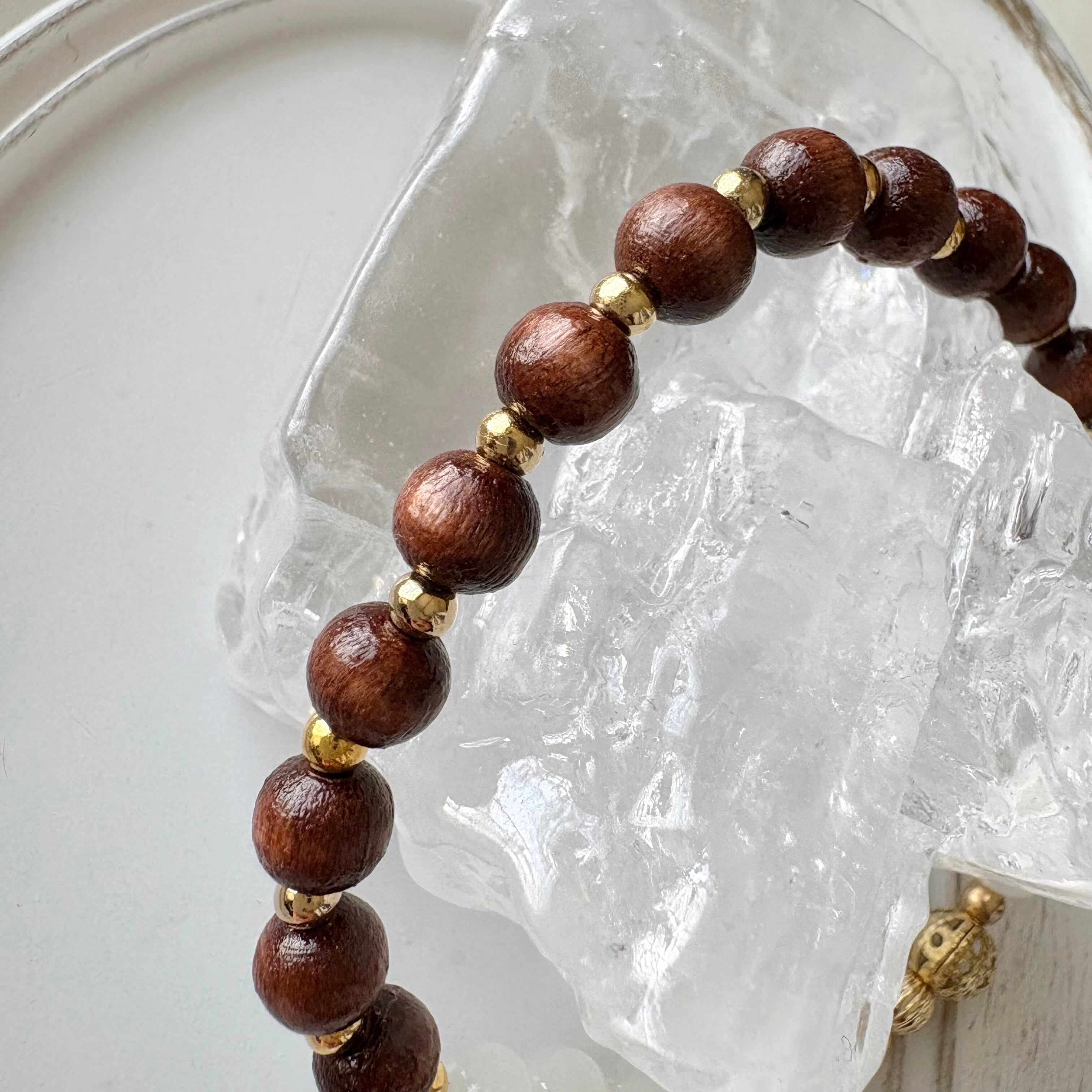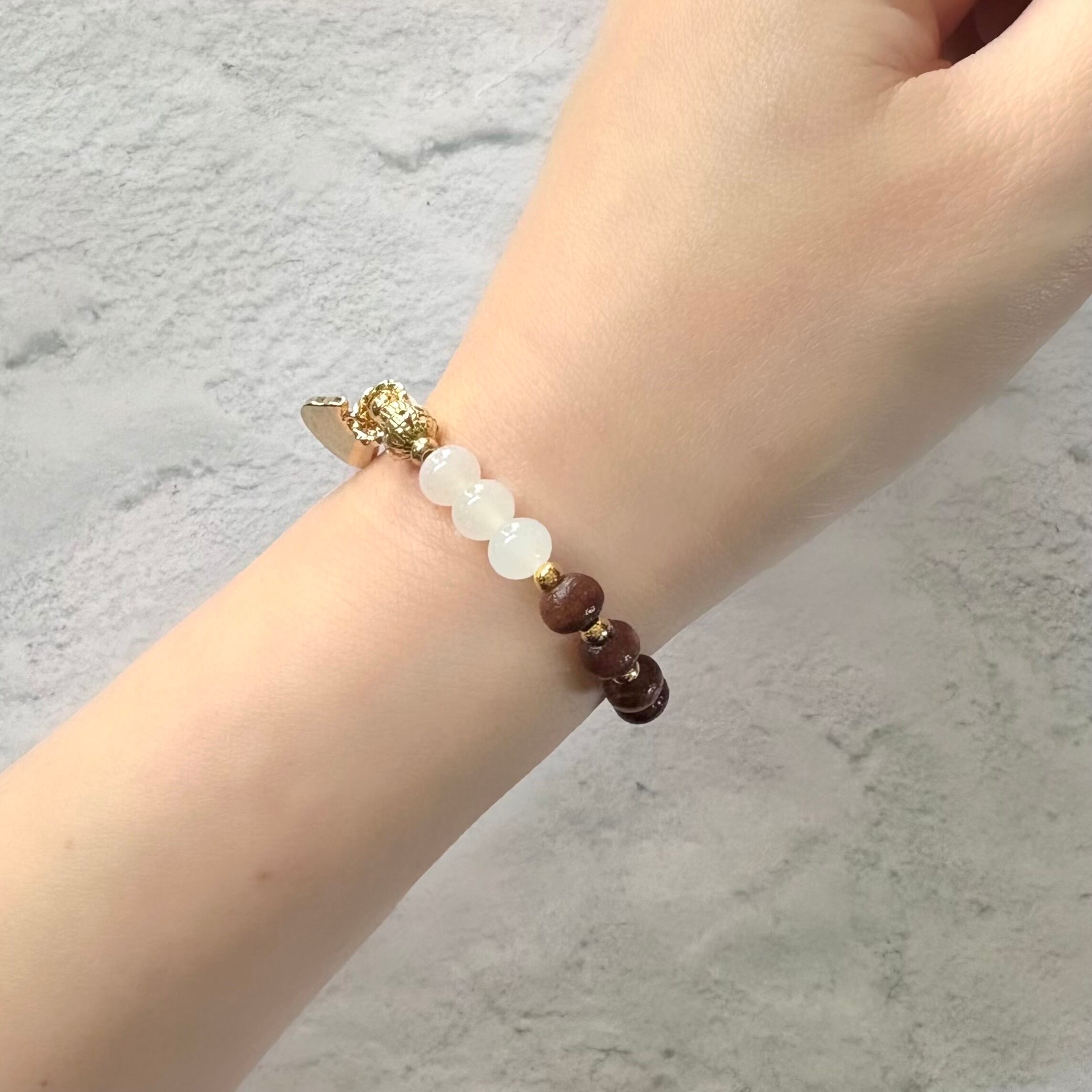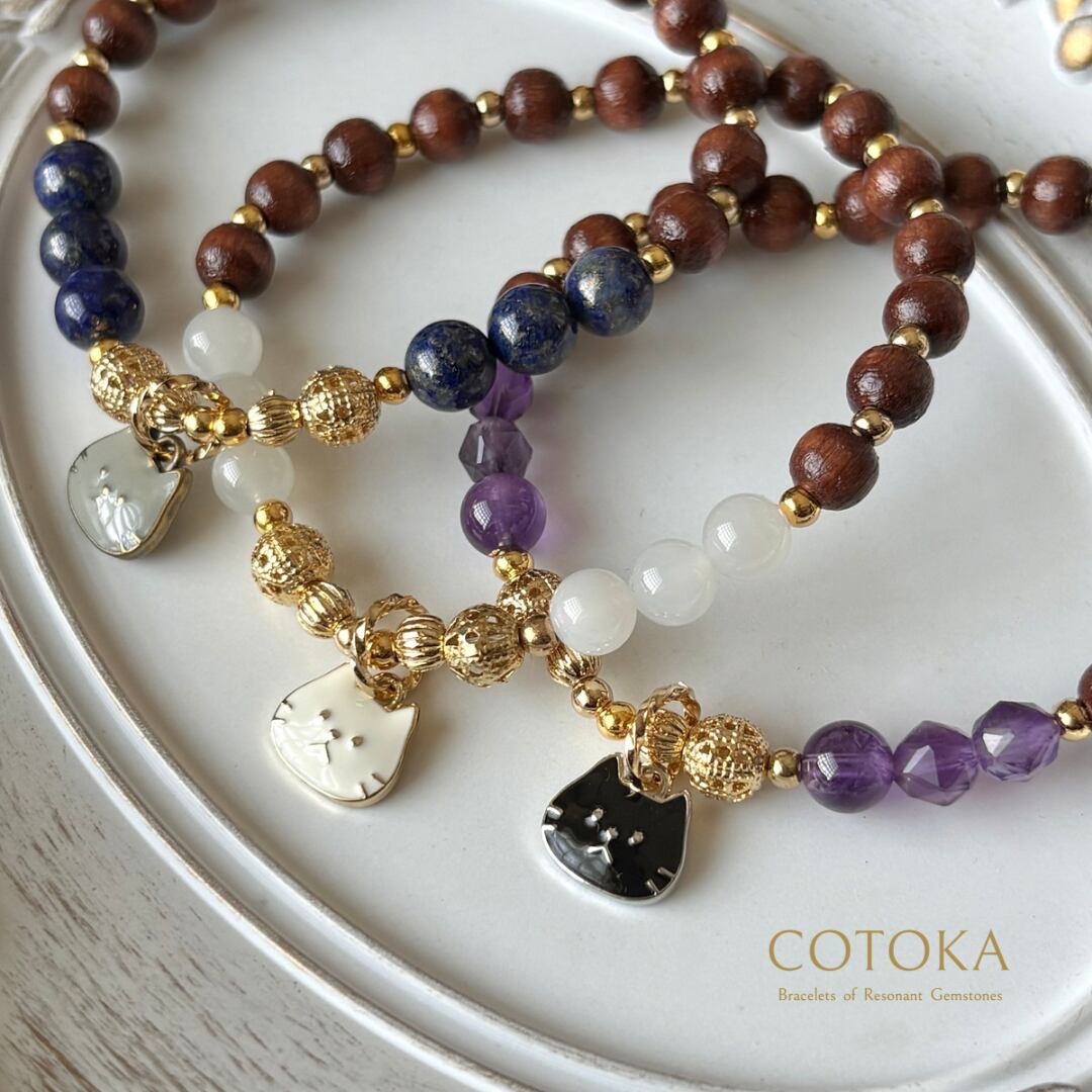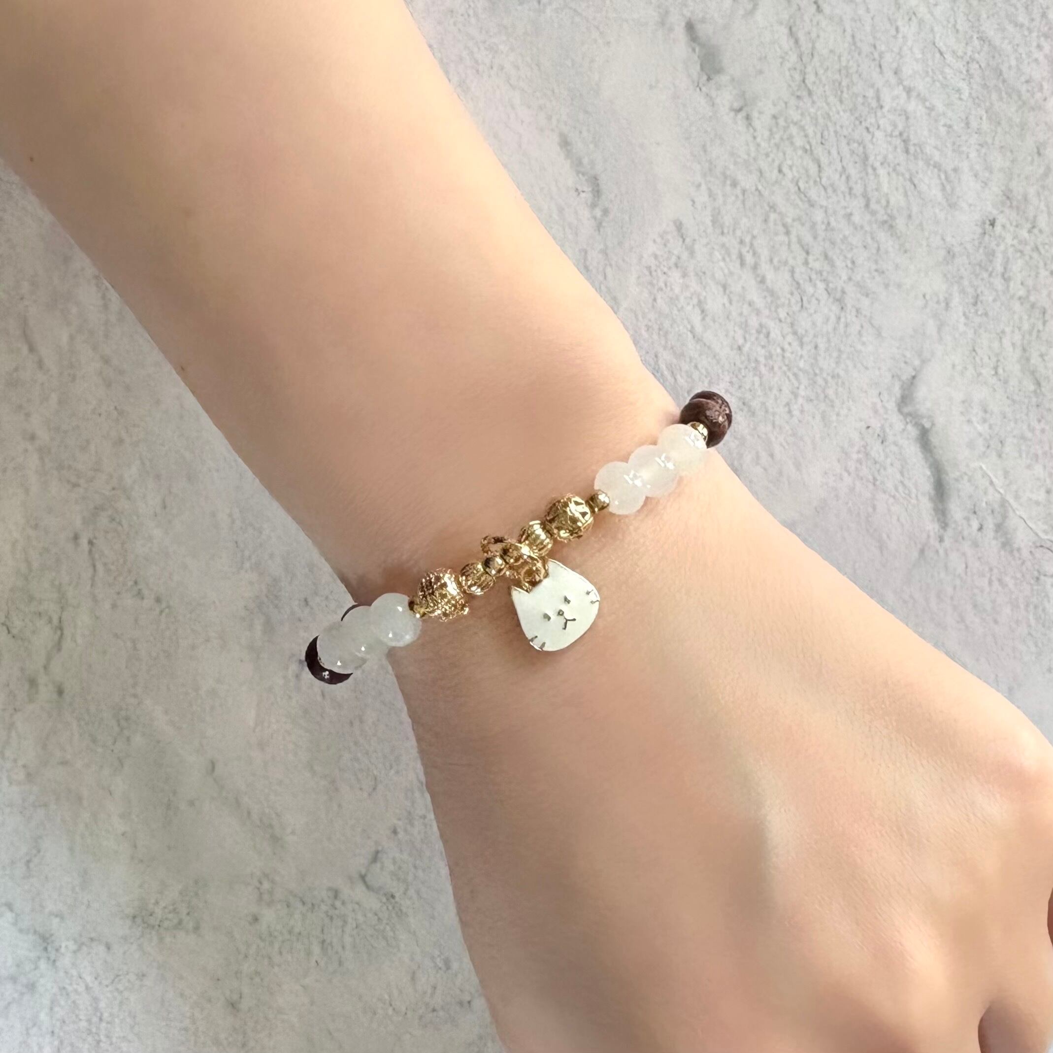 ゆれる白猫チャーム付きブレスレット✶ムーンストーン×ウッドのデザインブレスレット