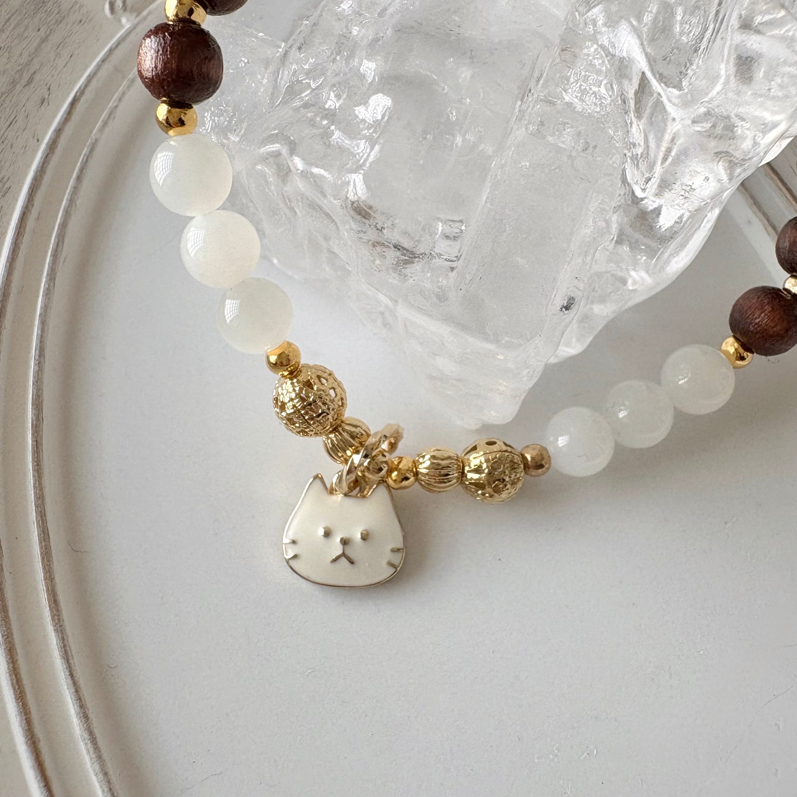 白猫チャーム付きムーンストーンとウッドビーズを組み合わせたデザインブレスレット。