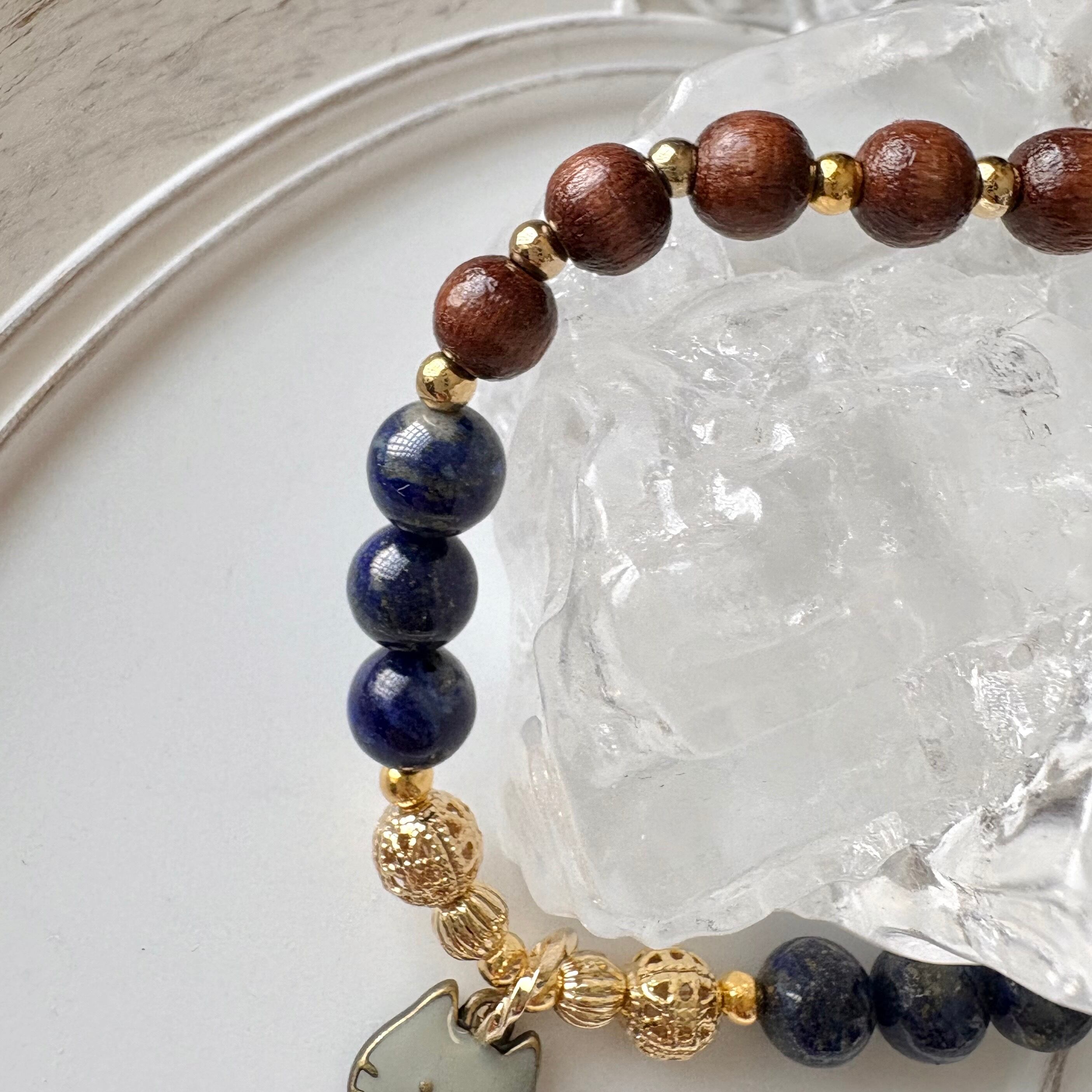 グレー猫チャーム付きラピスラズリとウッドビーズを組み合わせたデザインブレスレット。