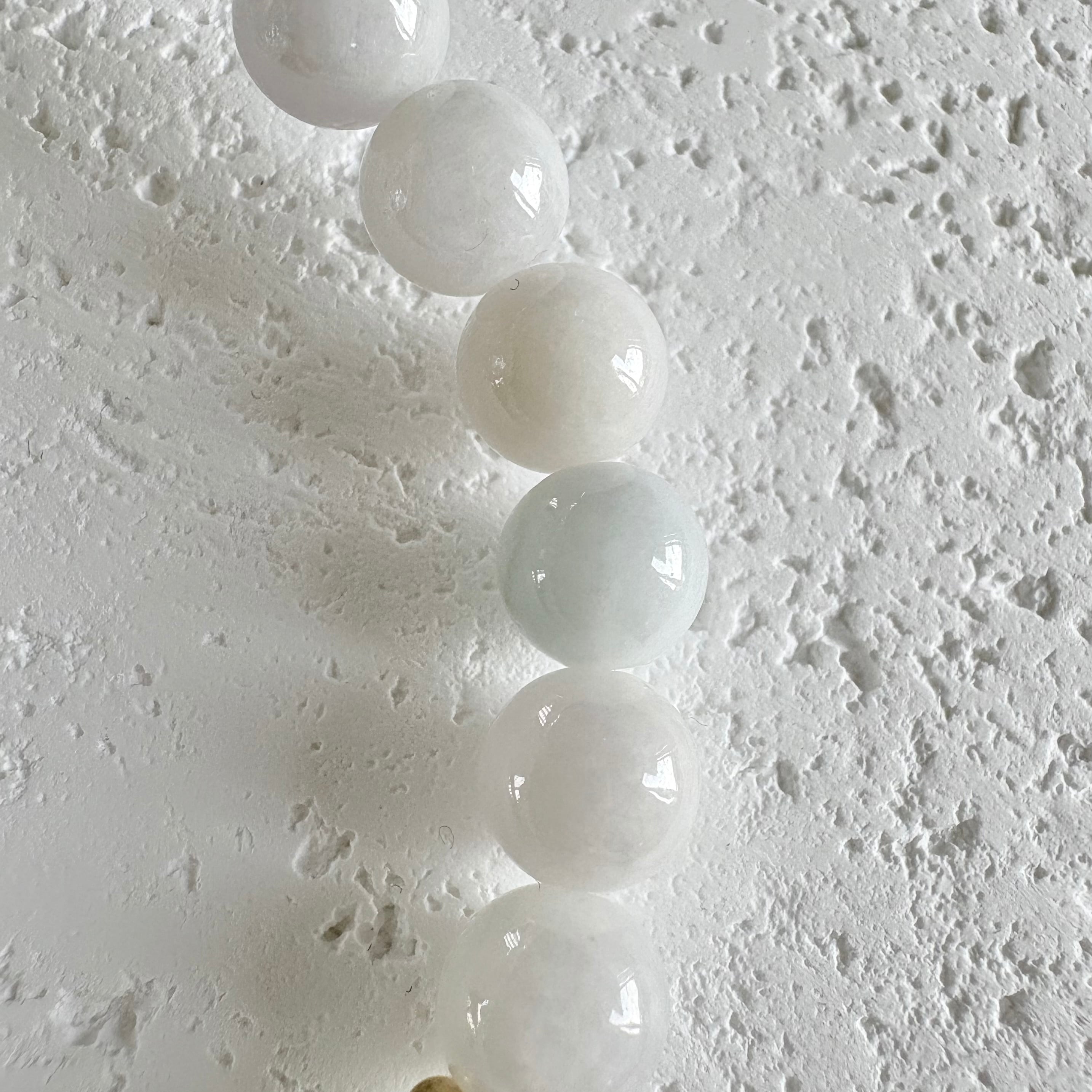 10mmの糸魚川翡翠は、静かな力強さを感じさせる佇まい。そこに8mmの白翡翠を合わせることで、重厚になりすぎない、清楚でやさしい印象に仕上げました。