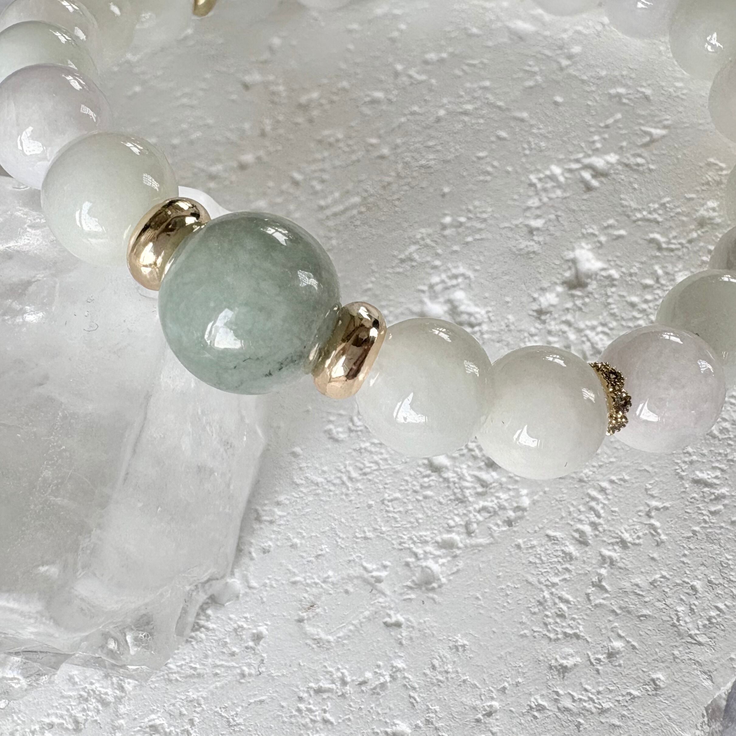 凛とした存在感を放つ糸魚川翡翠を主役に、やわらかな白翡翠を添えた上品な翡翠ブレスレットです。