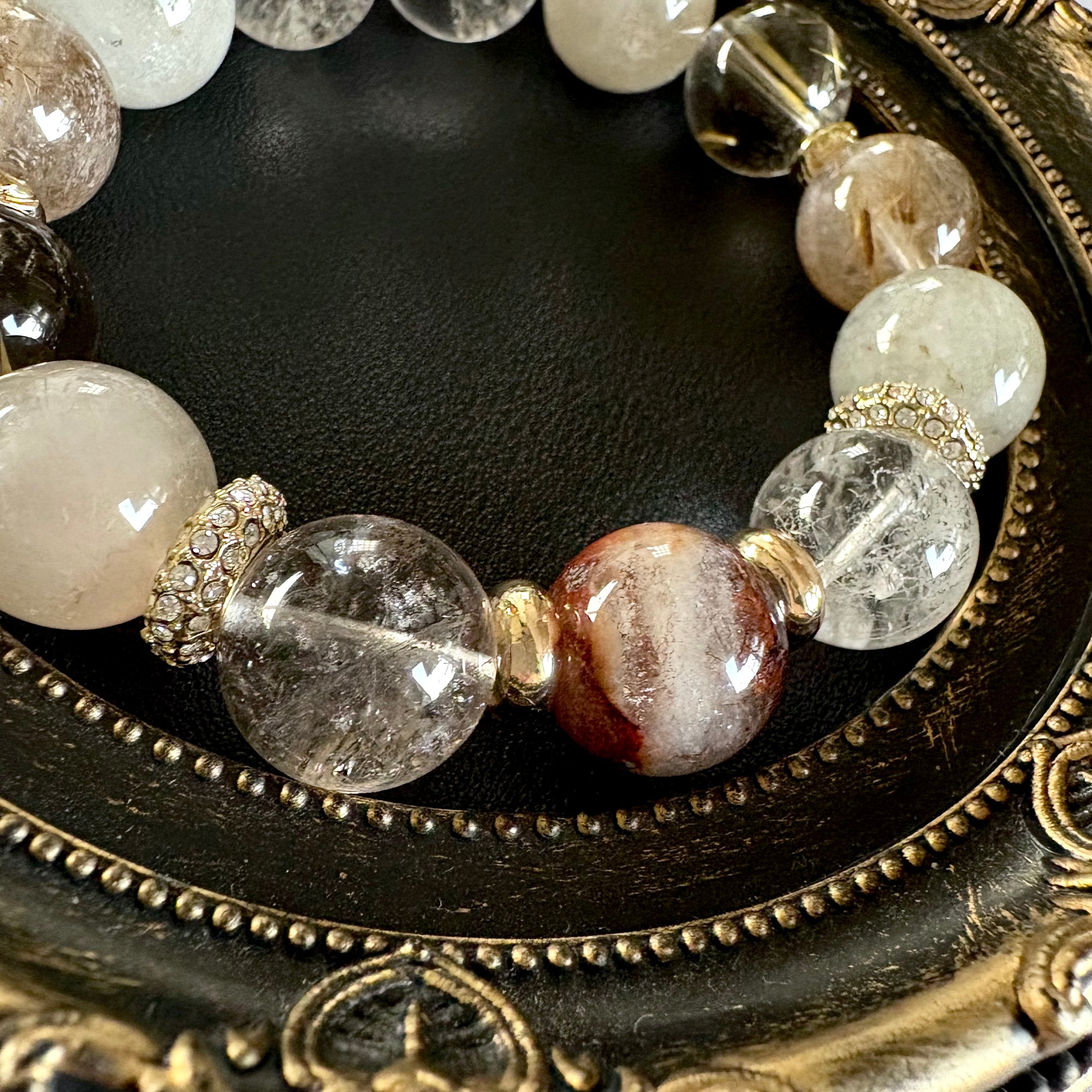 それぞれが持つ深い個性を調和させ、力強くも落ち着いた存在感を放つ大玉の開運ブレスレットに仕立てました。