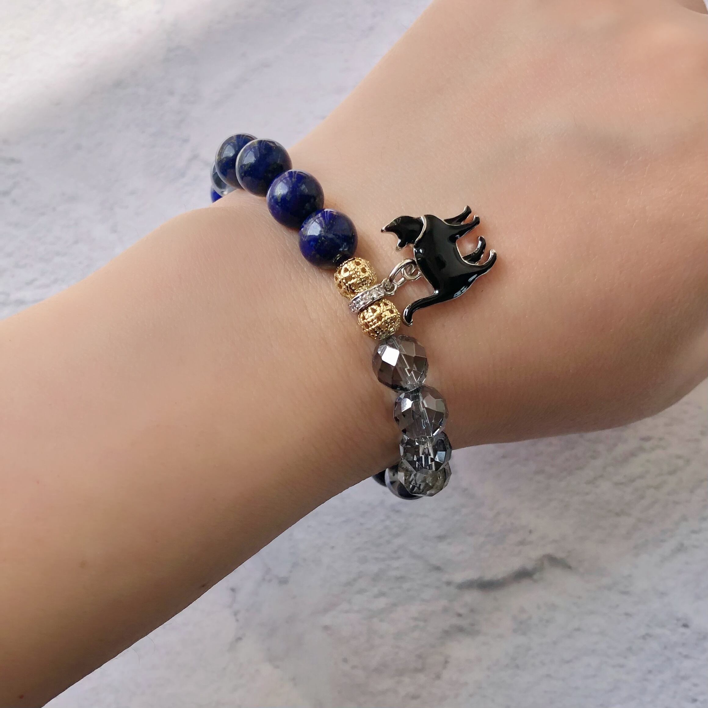 ラピスラズリの深い紺色と輝くシルバーフラッシュの組み合わせが美しく、黒猫チャームがアクセントとなってとても神秘的なブレスレットです。