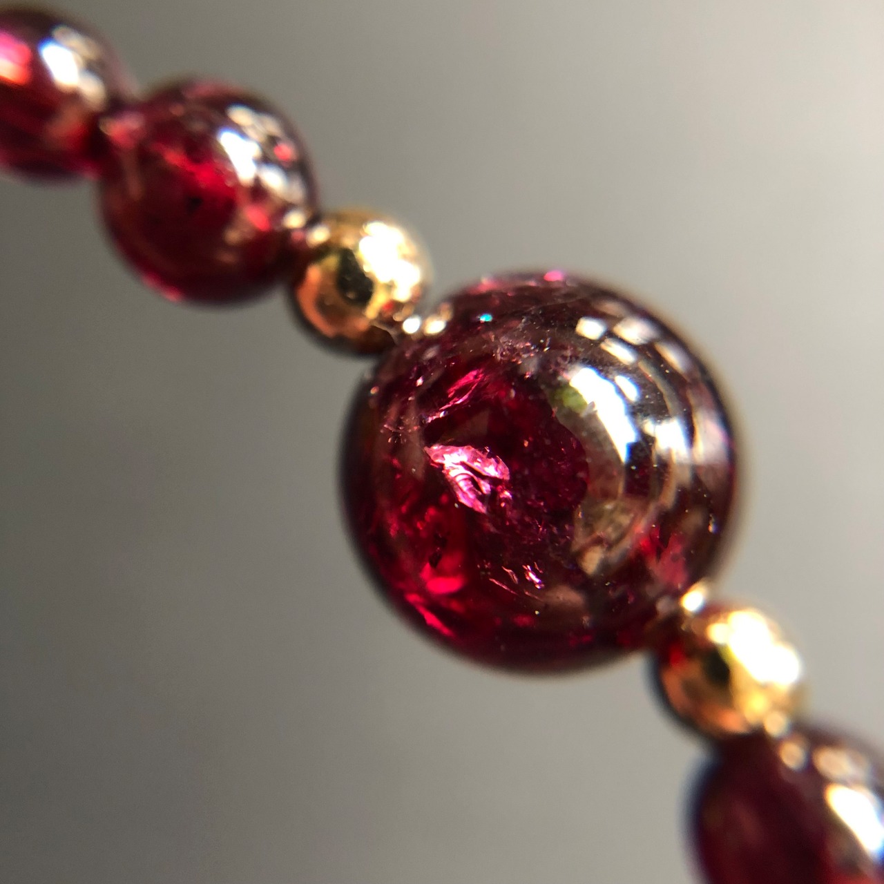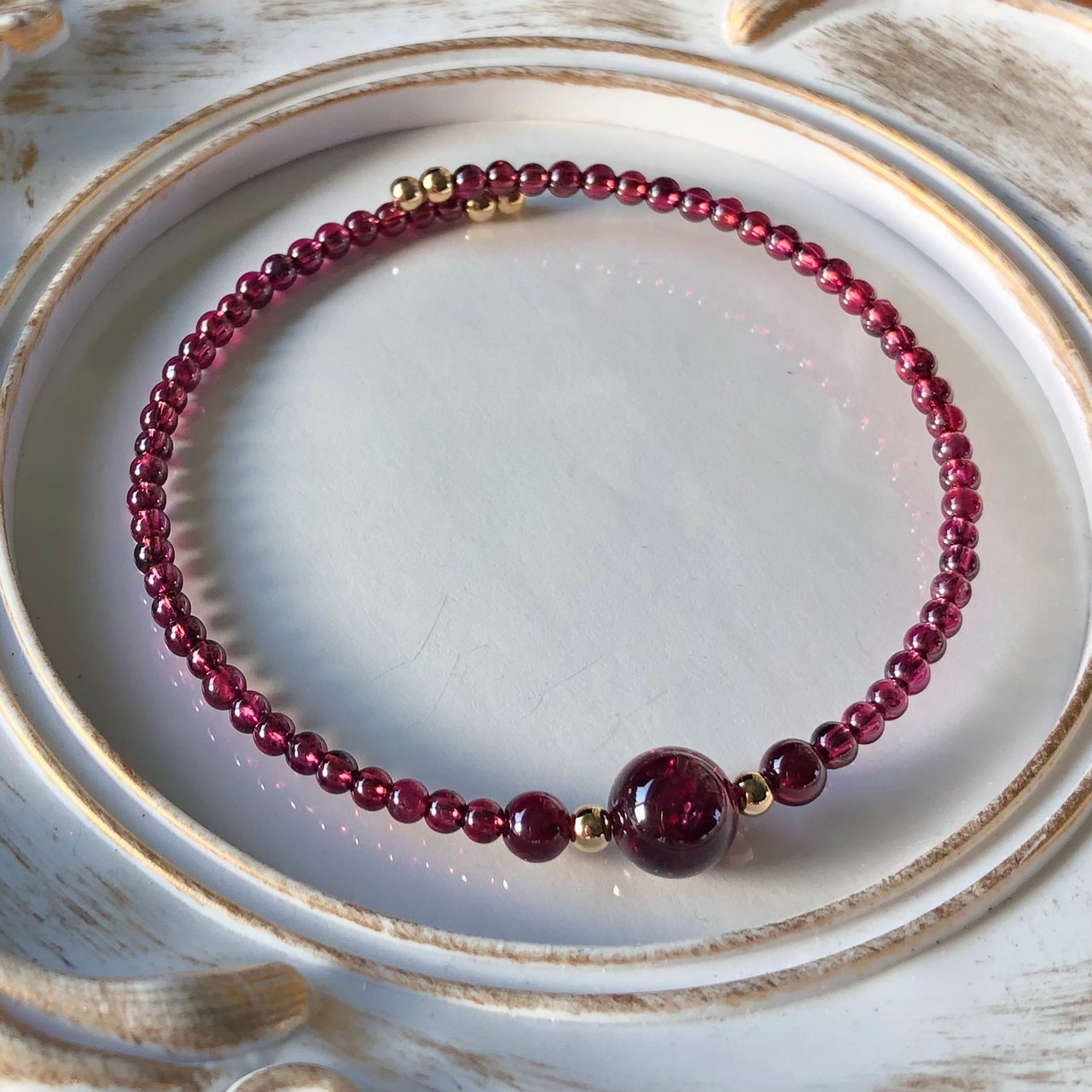 このブレスレットは、ベースには2mmのガーネットを使用し、ワイヤーブレスレットとして組み上げました。中央には8.5mmのガーネットを配置し、その両サイドには6mmのガーネットを組んでいます。全ての石がガーネットで構成された、シンプルでありながら存在感のあるデザインです。