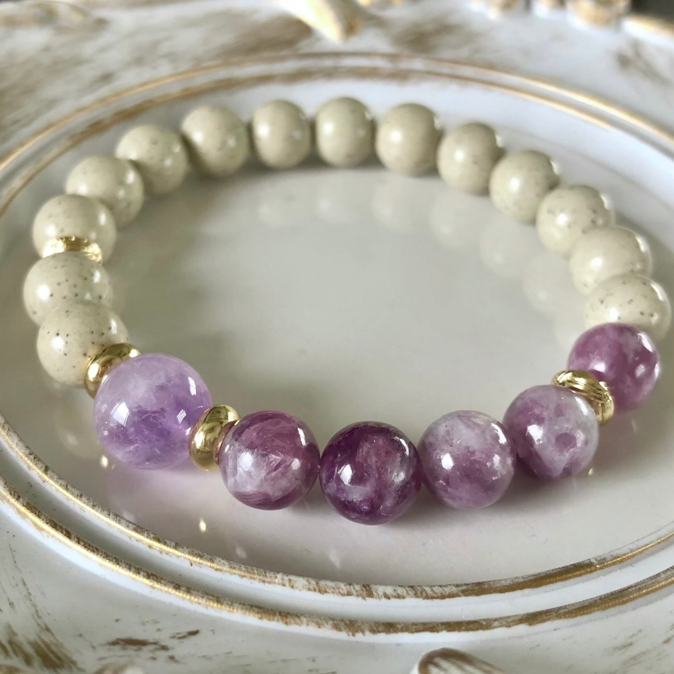 自然治癒・免疫力アップ・健康増進といわれている薬石の北投石とレピドライト・ラベンダーアメジストを組み合わせたデザインブレスレットです。