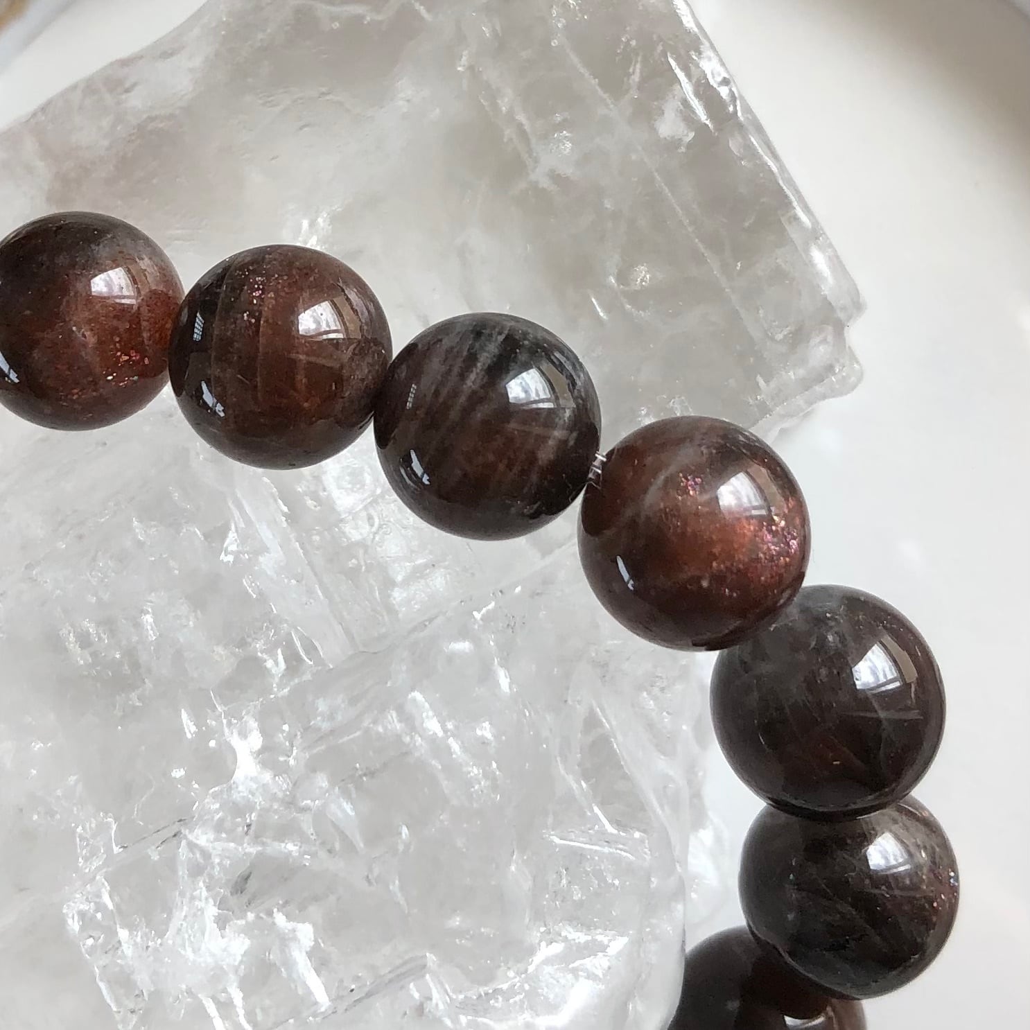 また、レッドブロンズサンストーンは色とりどりの宝石を散りばめたようなアベンチュレッセンスの輝きを持つ高品質で希少な石です。見とれてしまうほど、石の中の世界に引き込まれるような不思議な魅力があります。