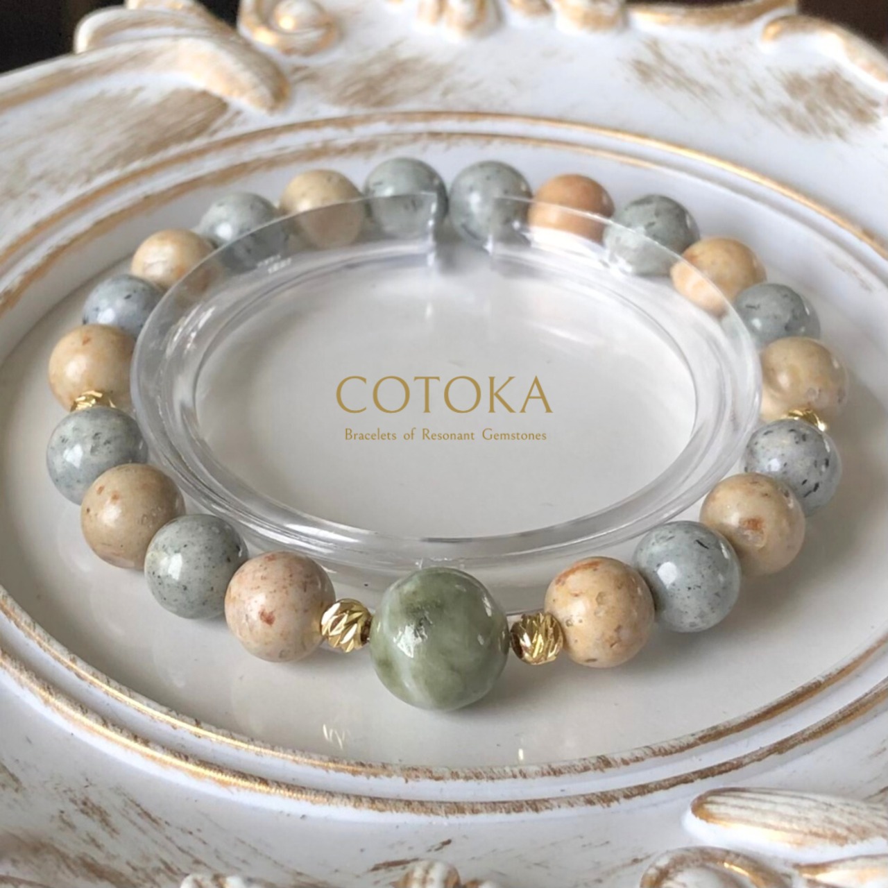 14金ゴールドフィルドのパーツを使用し、アクセサリーとして日常的に身に着けられるデザインに仕上げました。淡く落ち着いた色合いが優しい雰囲気を演出し、健康ブレスレットとは思えない可愛らしいデザインとなっています。