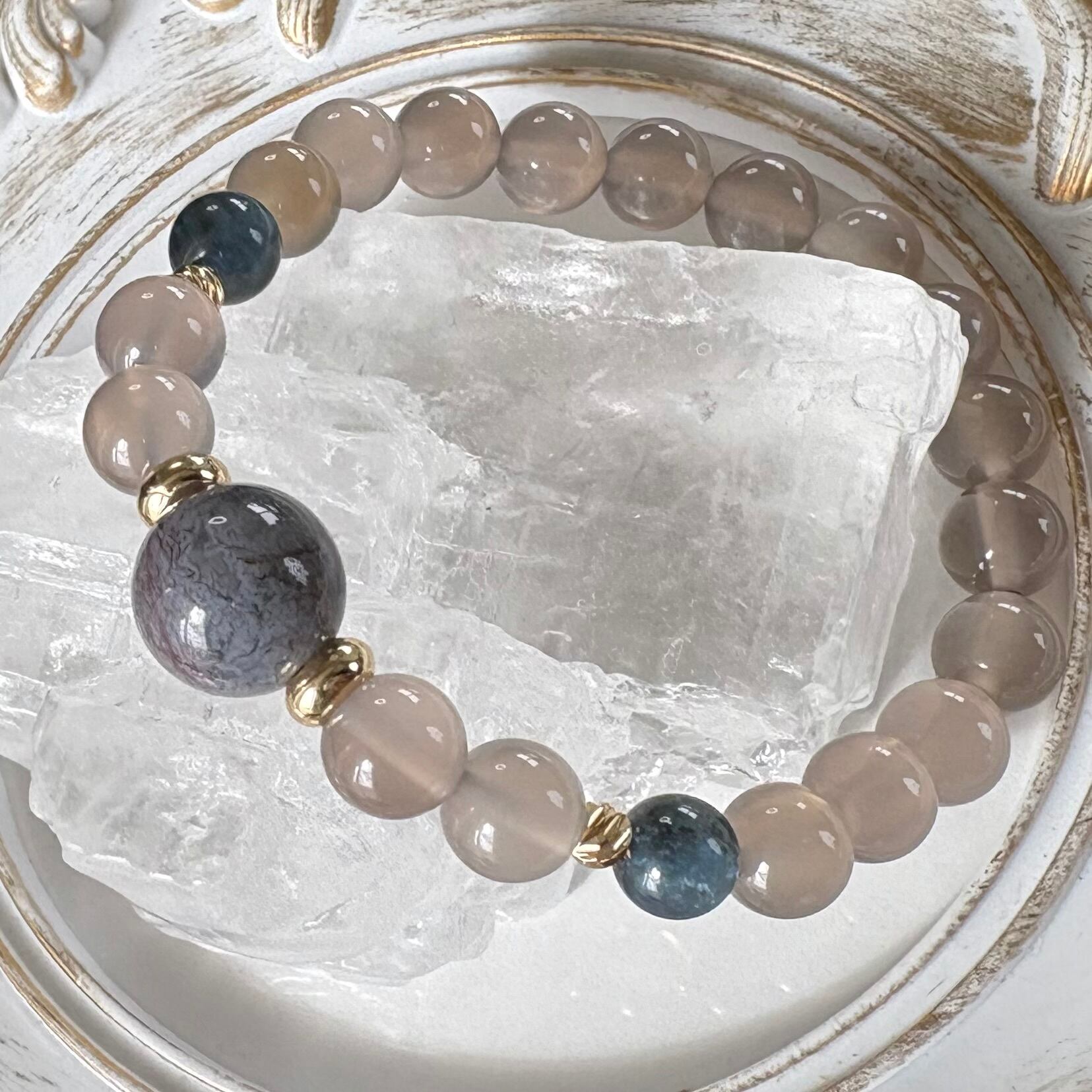 メインには、12mm珠のブルーグレーを基調とし、ほんのり赤紫が混じったモスアゲートをセレクトしました。この珍しい色合いがアクセントとなり、個性を引き立てています。