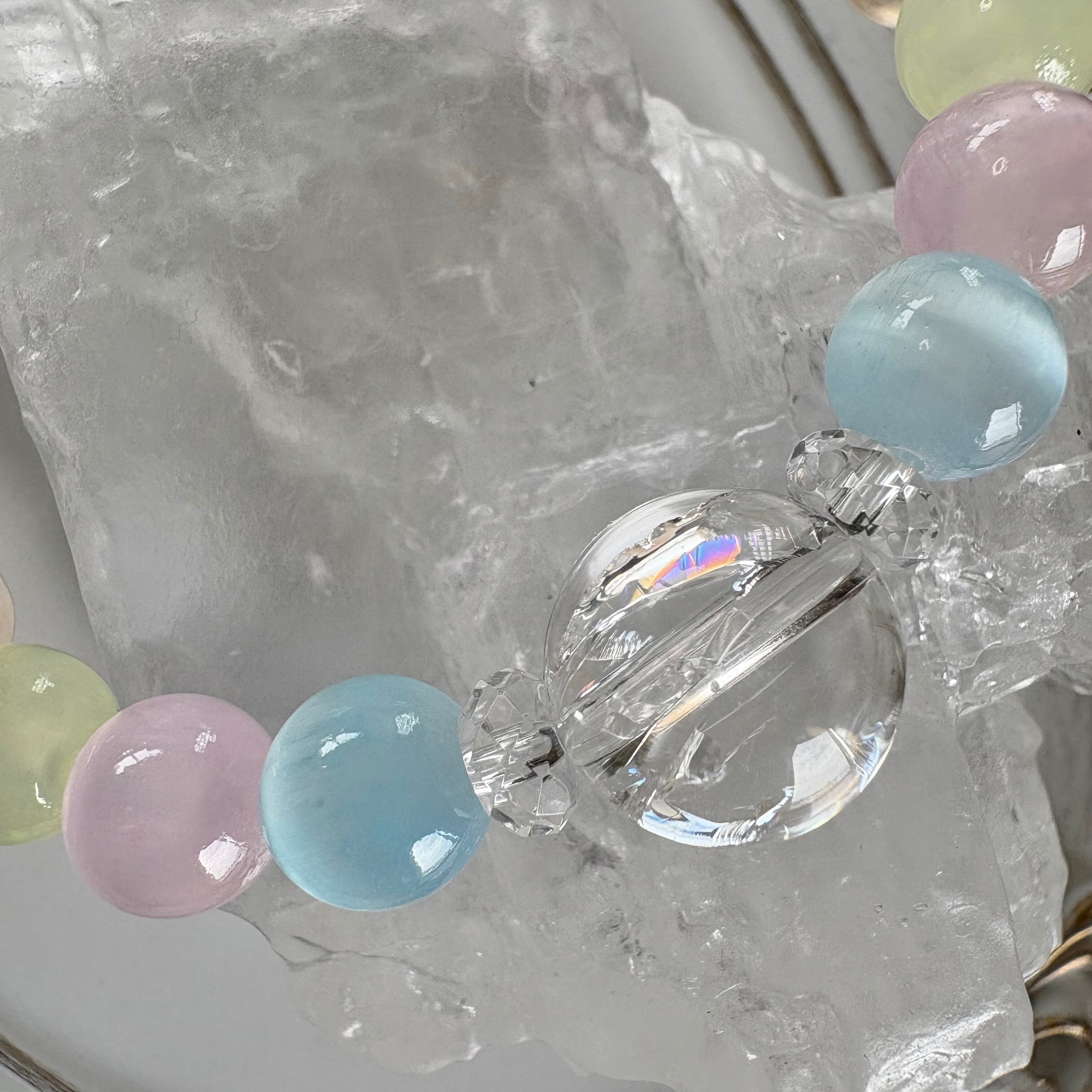 優しいパステルカラーのセレナイトをミックスしたブレスレットは、まるで月明かりが織りなす虹のような柔らかく穏やかな雰囲気をまとっています。その中央には、美しい虹色の輝きを放つアイリスクォーツを配置。アイリスクォーツの透明感と光が織りなす幻想的な輝きが、全体を引き立てます。さらに、両サイドにはボタンカットの水晶を組み合わせることで、洗練されたアクセントと清らかなエネルギーをプラスしました。